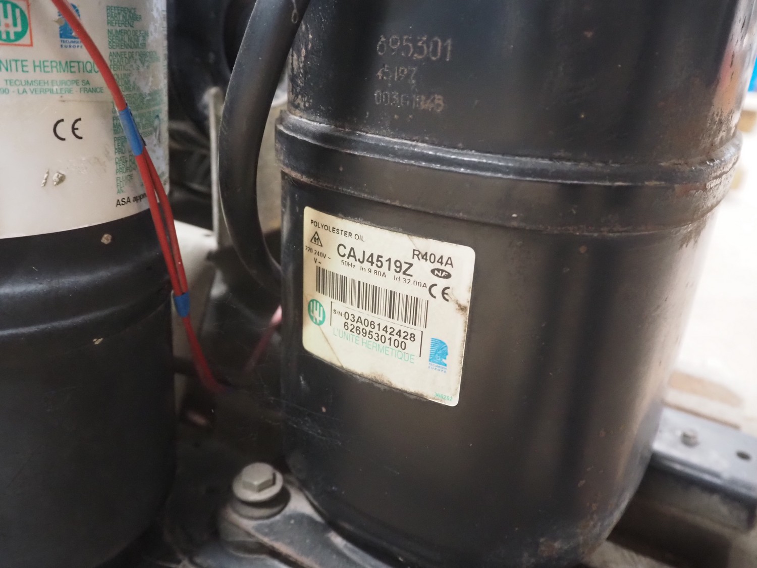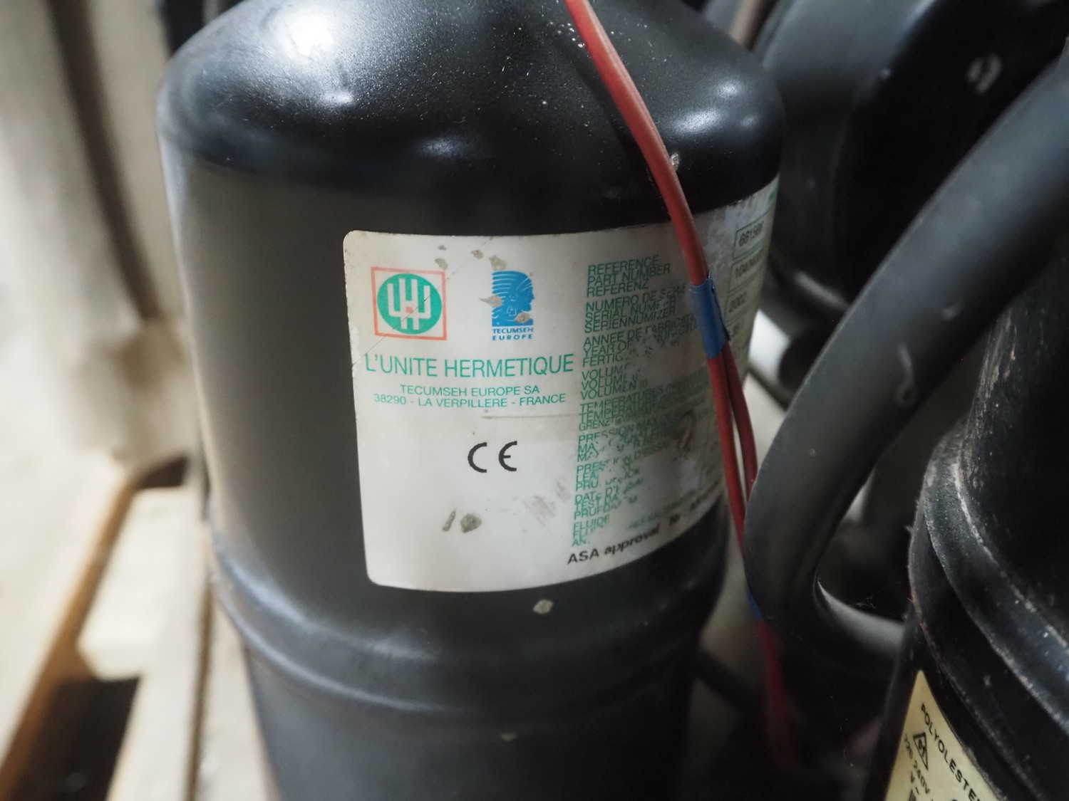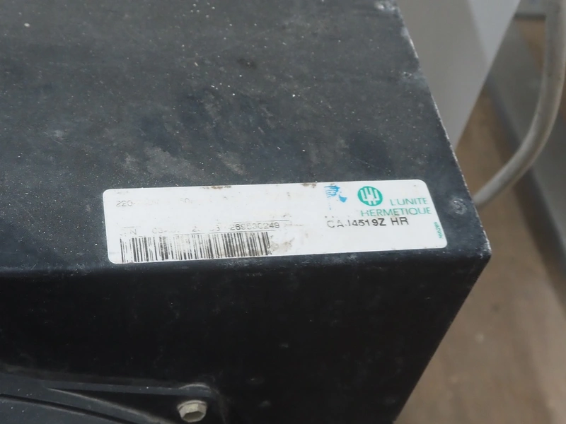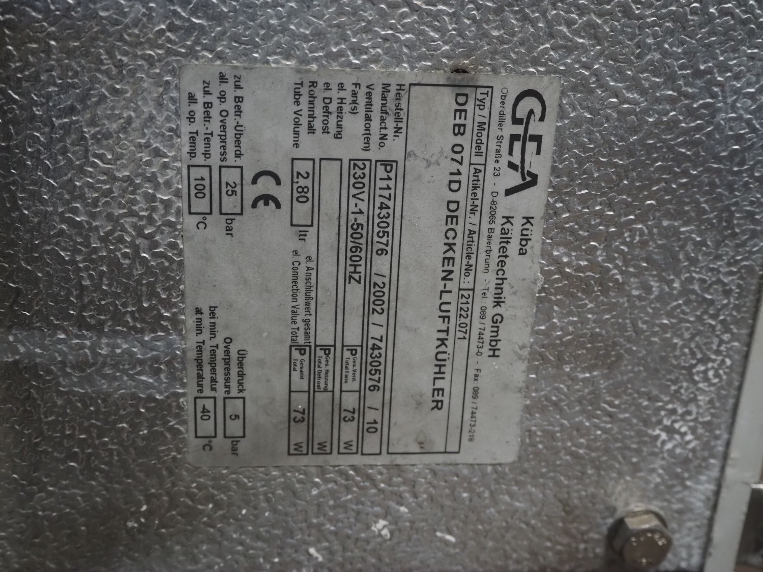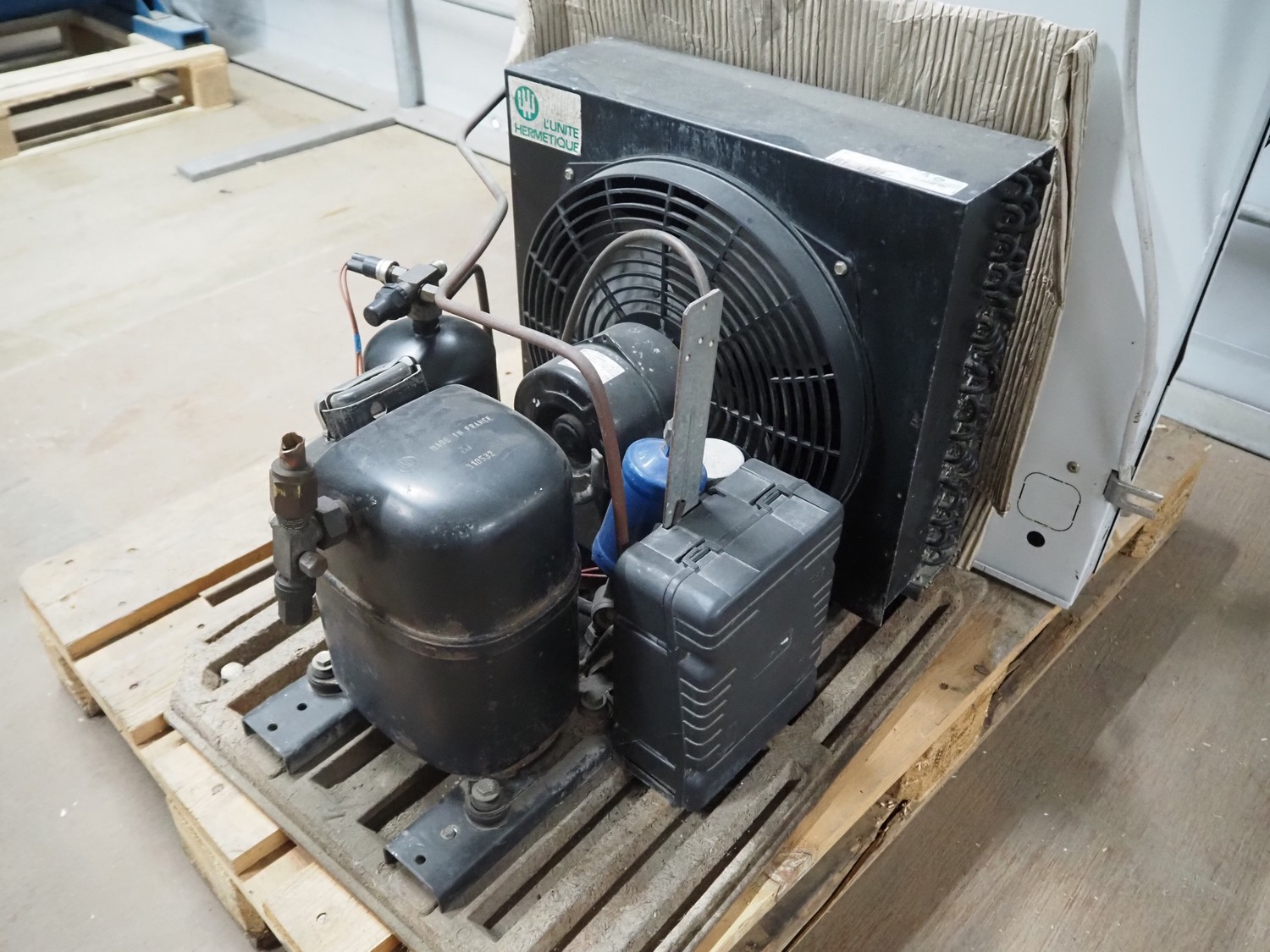 GEA evaporator, type: DEB 071D Decken-Luftkühler, number: P117430576, year of construction: 2002, 230 V, 1 Ph, 50/60 Hz, dimensions: 670 mm x 1050 mm x 240 mm with L'unite Hermetique cooling compressor, dimensions: 700 mm x 600 mm x 500 mm.