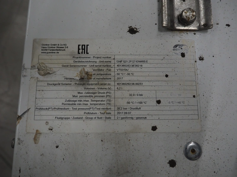 Güntner GmbH & Co KG evaporator, model: GHF 031 2F/27-ENW50.E, serial number: 401360287/36.00218, year of construction: 2017, dimensions: 1200 mm x 400 mm x 500 mm.