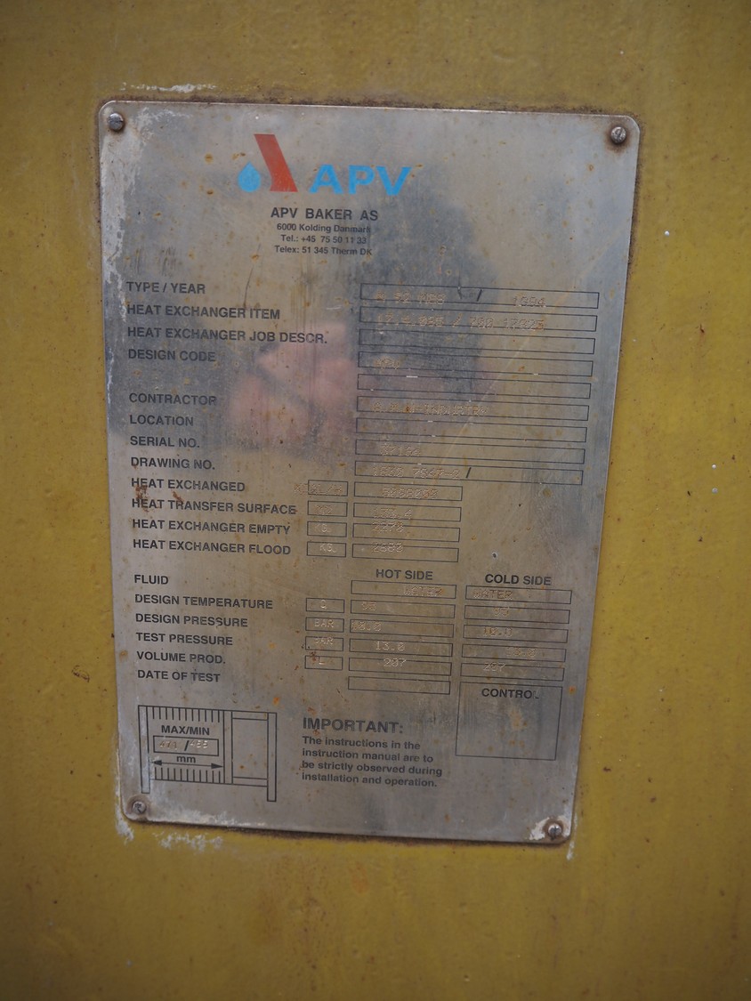 APV Baker AS plate heat exchanger, type: M92 MGS, serial number: 37134, year of construction: 1994, dimensions: 1500 mm x 900 mm x 1950 mm.