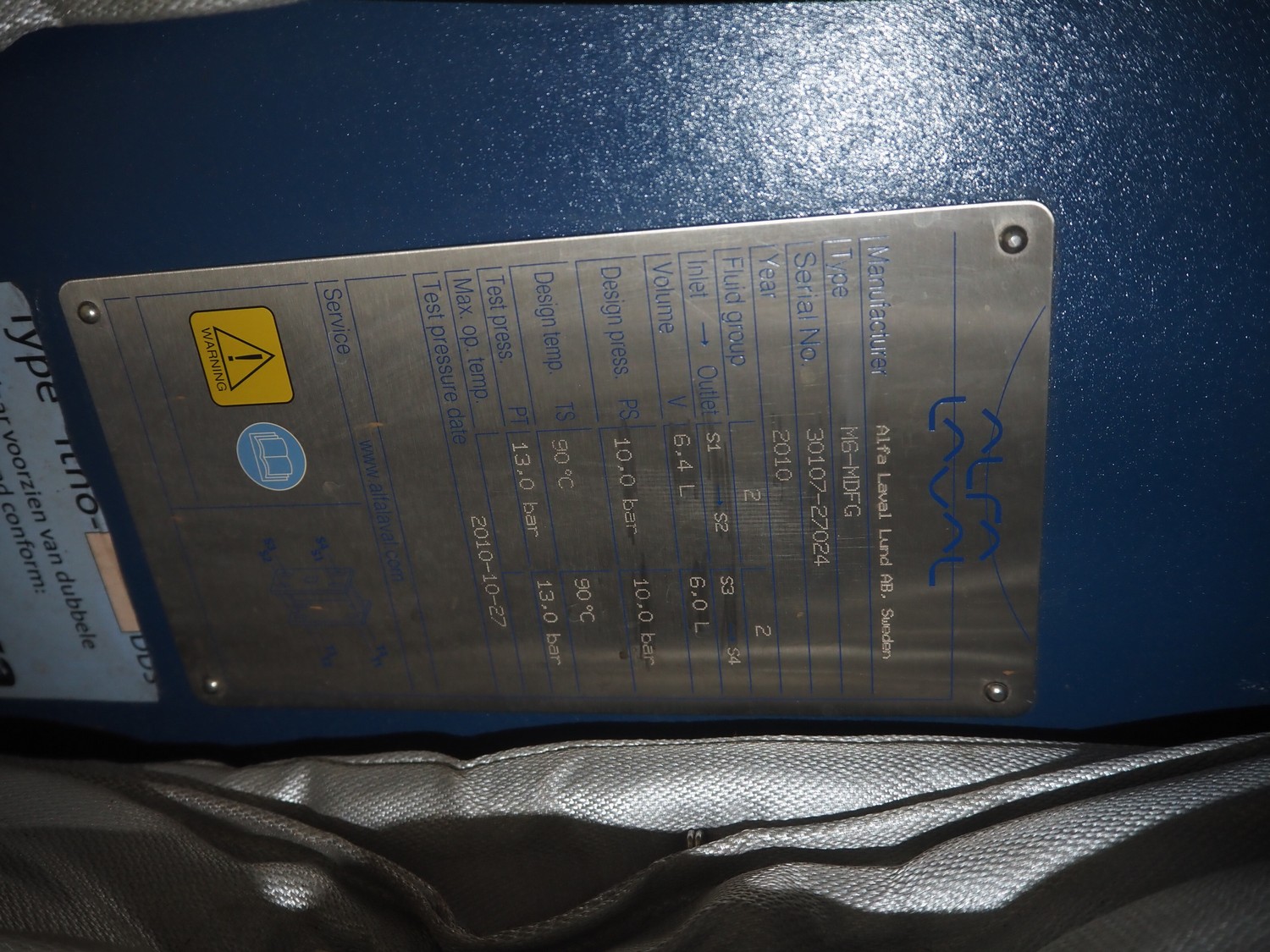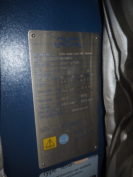 Alfa Laval heat exchanger, type: M6-MDFG, serial number: 30107-27024, year of construction: 2010, volume: 6.4 / 6.0 liter, dimensions: 970 mm x 860 mm x 370 mm.