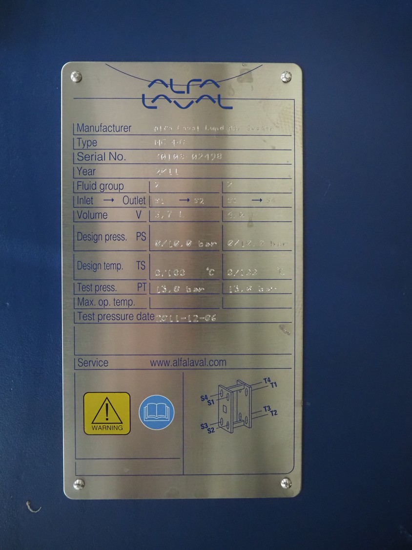Alfa Laval heat exchanger, type: M6-FG, serial number: 30108-02428, year of construction: 2011, volume: 3.7 / 4.0 liter, dimensions: 1120 mm x 740 mm x 320 mm.
