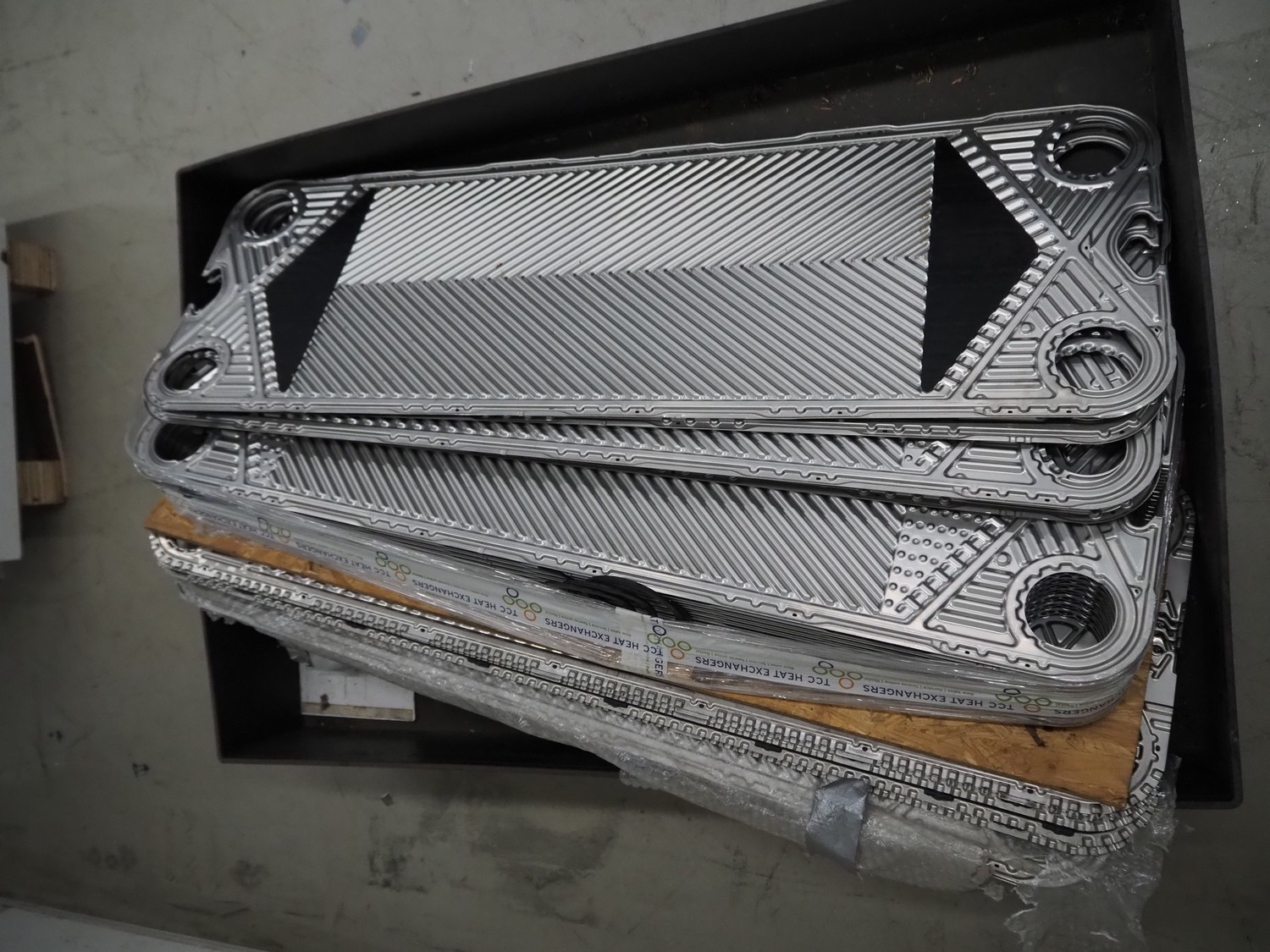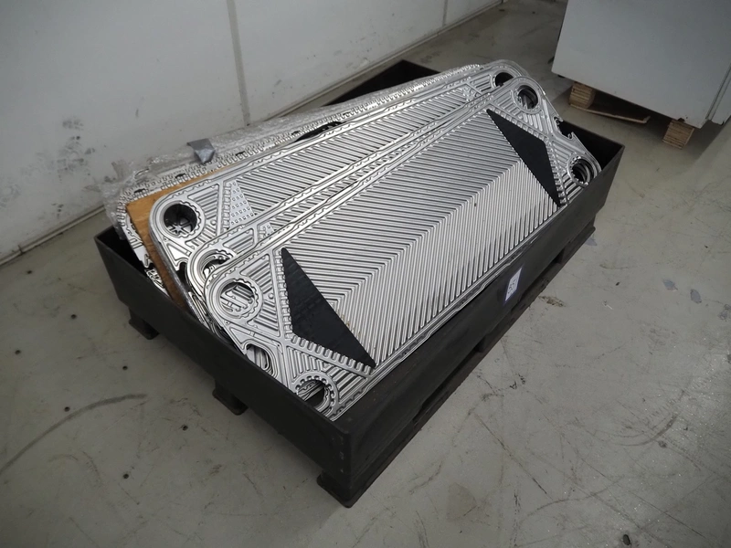 Pallet with plates for heat exchanger, dimensions 1 plate: 1150 mm x 400 mm, total dimensions: 1200 mm x 800 mm x 600 mm.