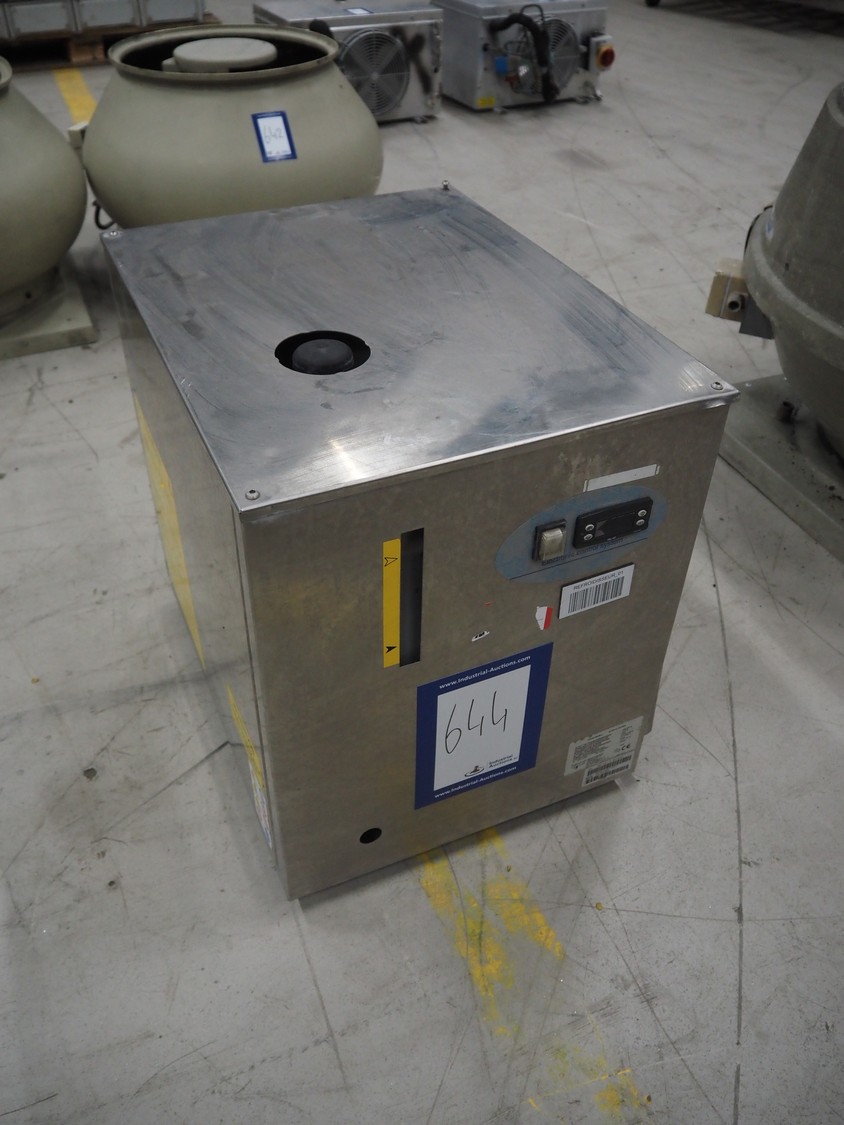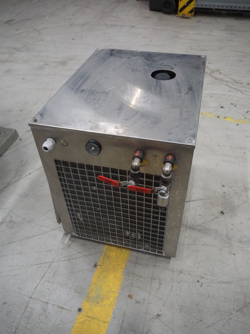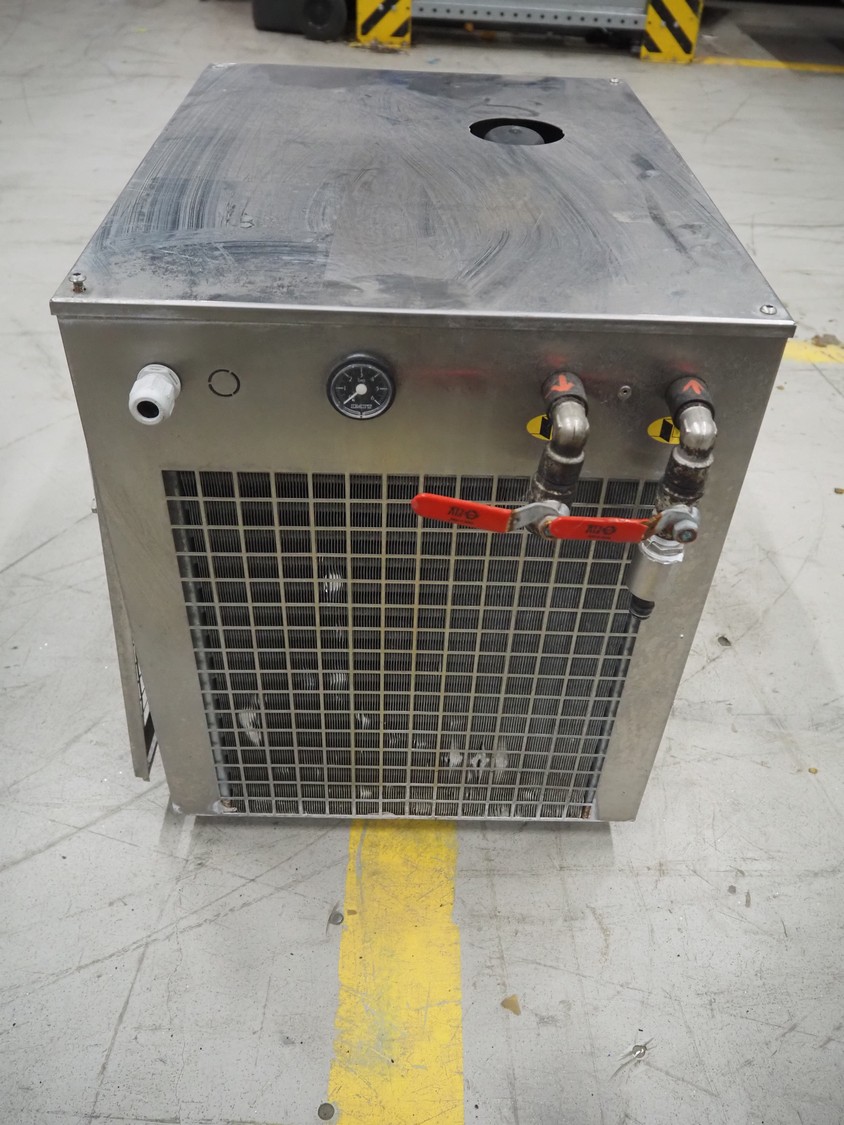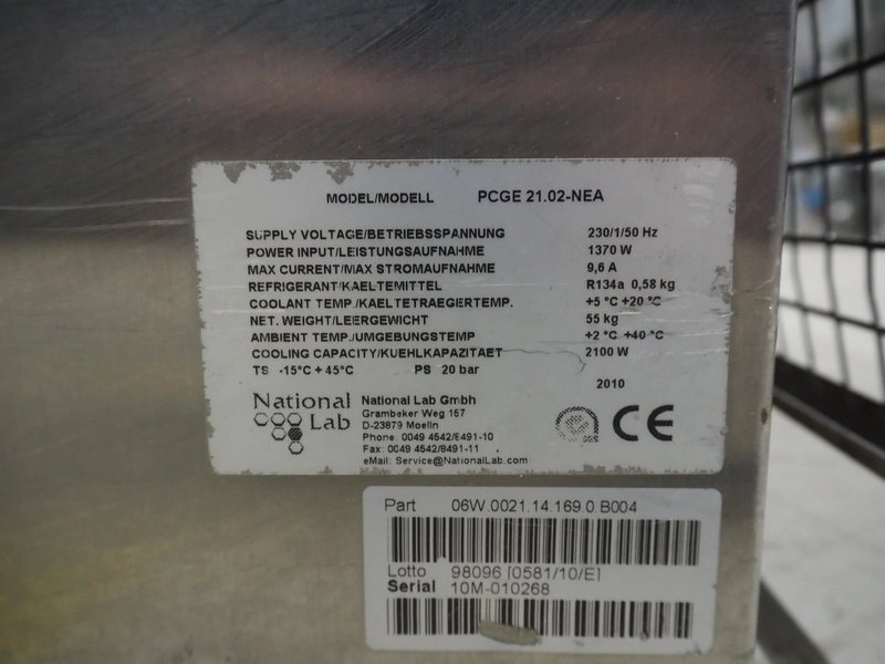 National Lab GmbH cooling unit, model: PCGE 21.02-NEA, serial number: 10M-010268, year of construction: 2010, weight: 55 Kg, 230 V, 1 Ph, 50 Hz, 9.6 A, 2100 W, refrigerant: R134a, 0.58 Kg, dimensions: 650 mm x 450 mm x 540 mm.