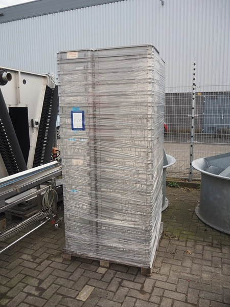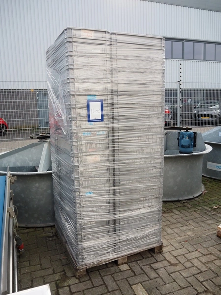 Pallet with 80 plastic crates, dimensions each crate: 600 mm x 400 mm x 110 mm, total dimensions: 1200 mm x 800 mm x 2400 mm.
