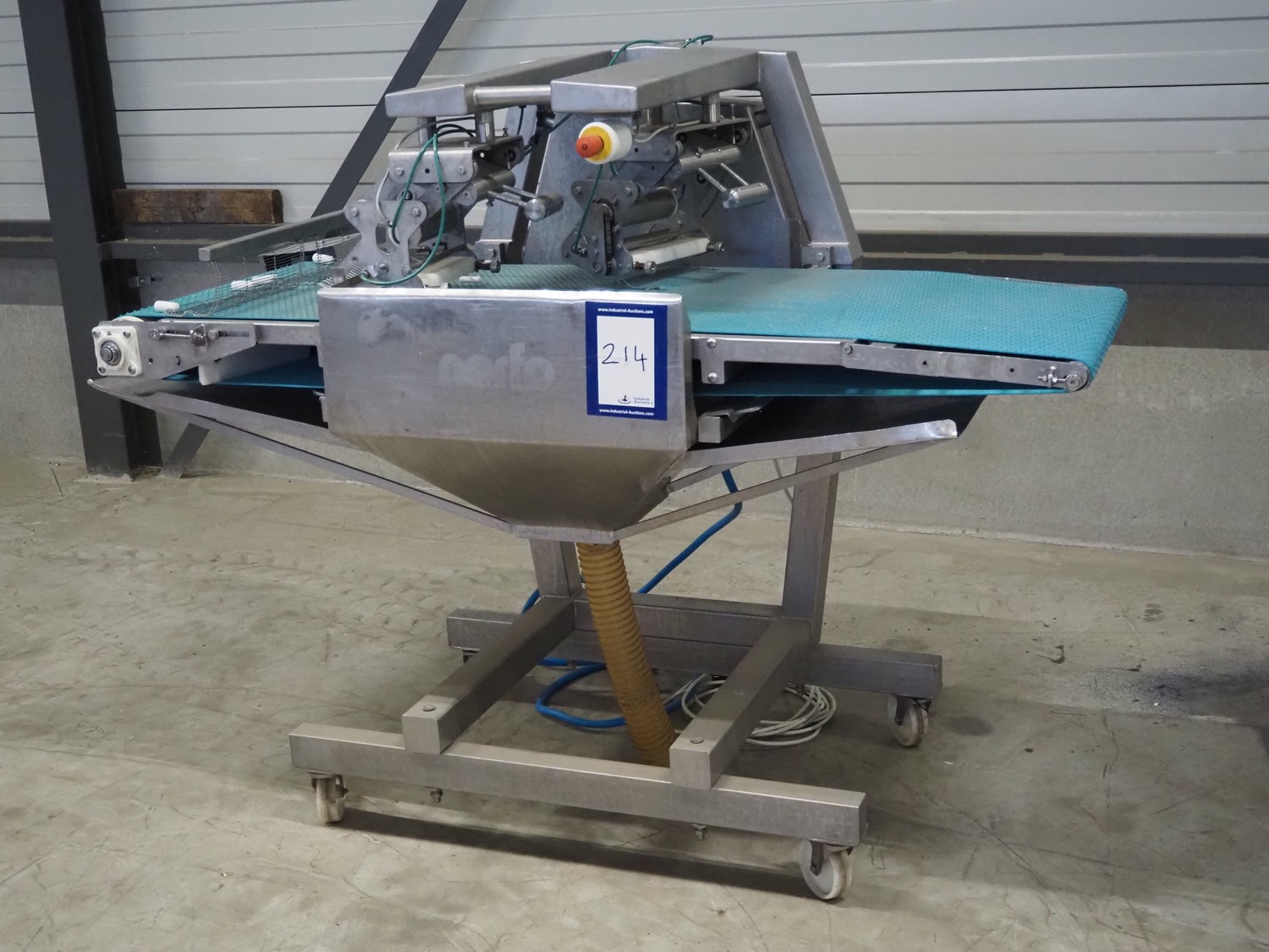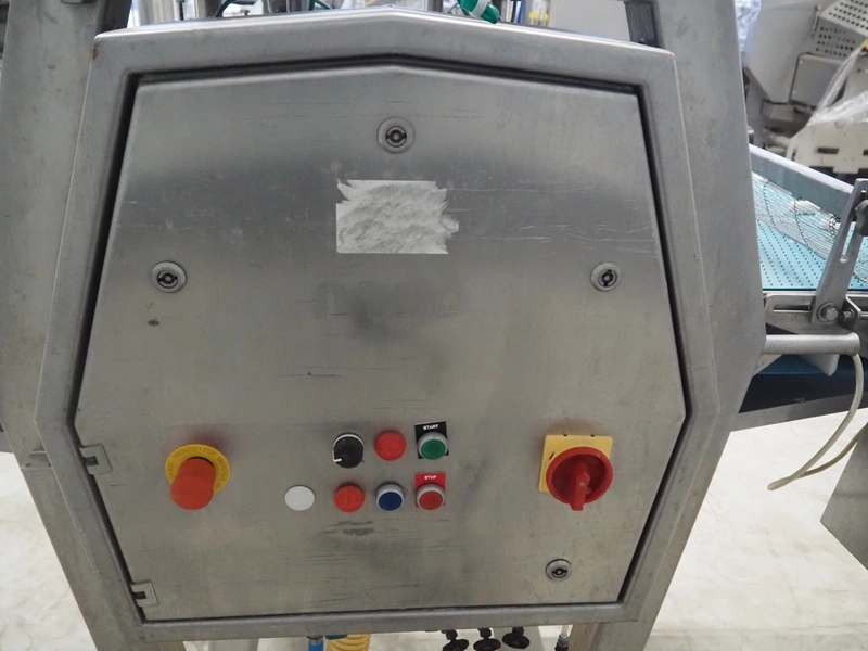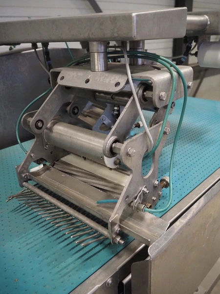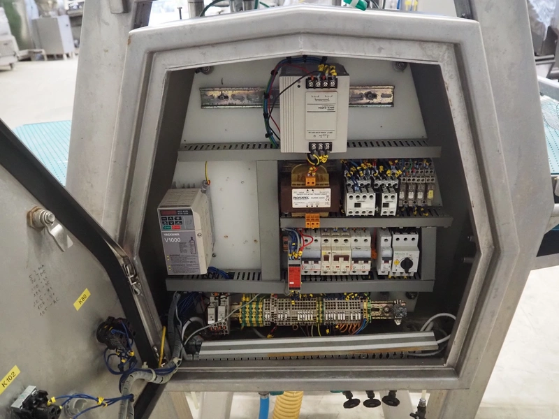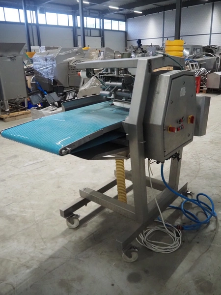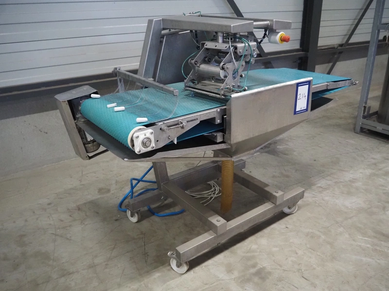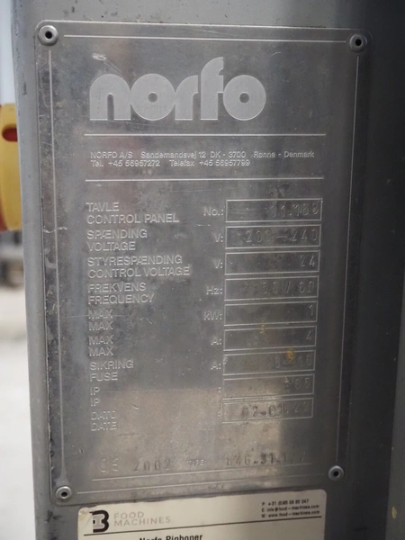 Norfo mobile pin bone remover, type: 846.31.137, number: 31.168, year of construction: 2002, 200-240 V, 50/60 Hz, 4 A, 1 kW, plastic belt, belt width: 650 mm, total dimensions: 2150 mm x 1060 mm x 1400 mm.