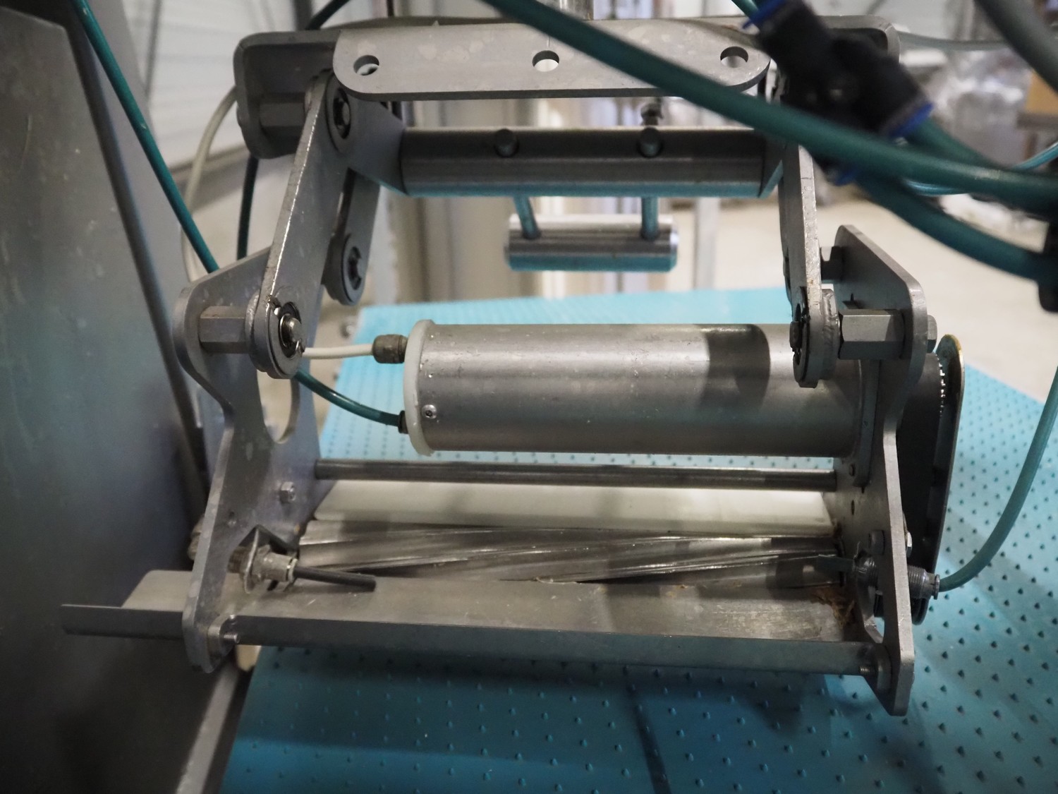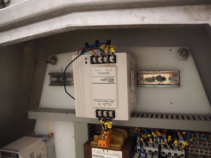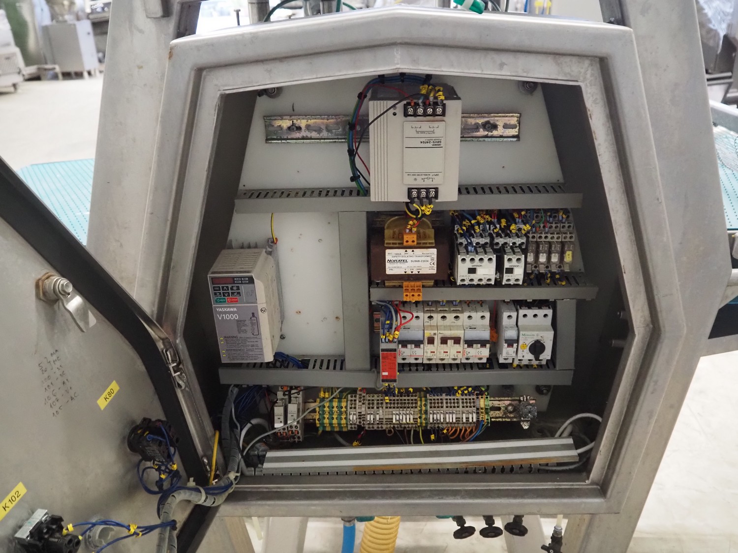 Norfo mobile pin bone remover, type: 846.31.137, number: 31.168, year of construction: 2002, 200-240 V, 50/60 Hz, 4 A, 1 kW, plastic belt, belt width: 650 mm, total dimensions: 2150 mm x 1060 mm x 1400 mm.
