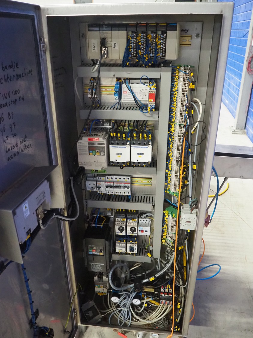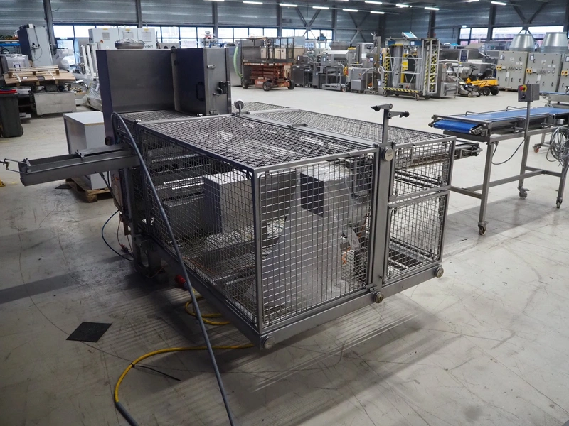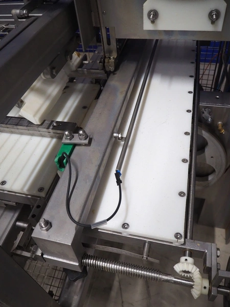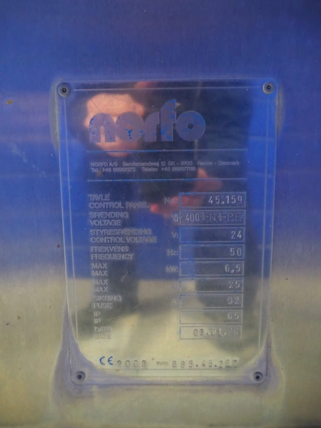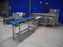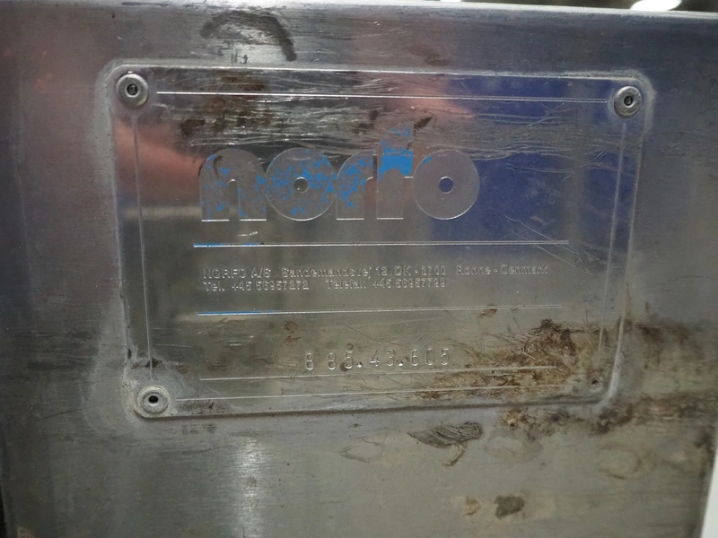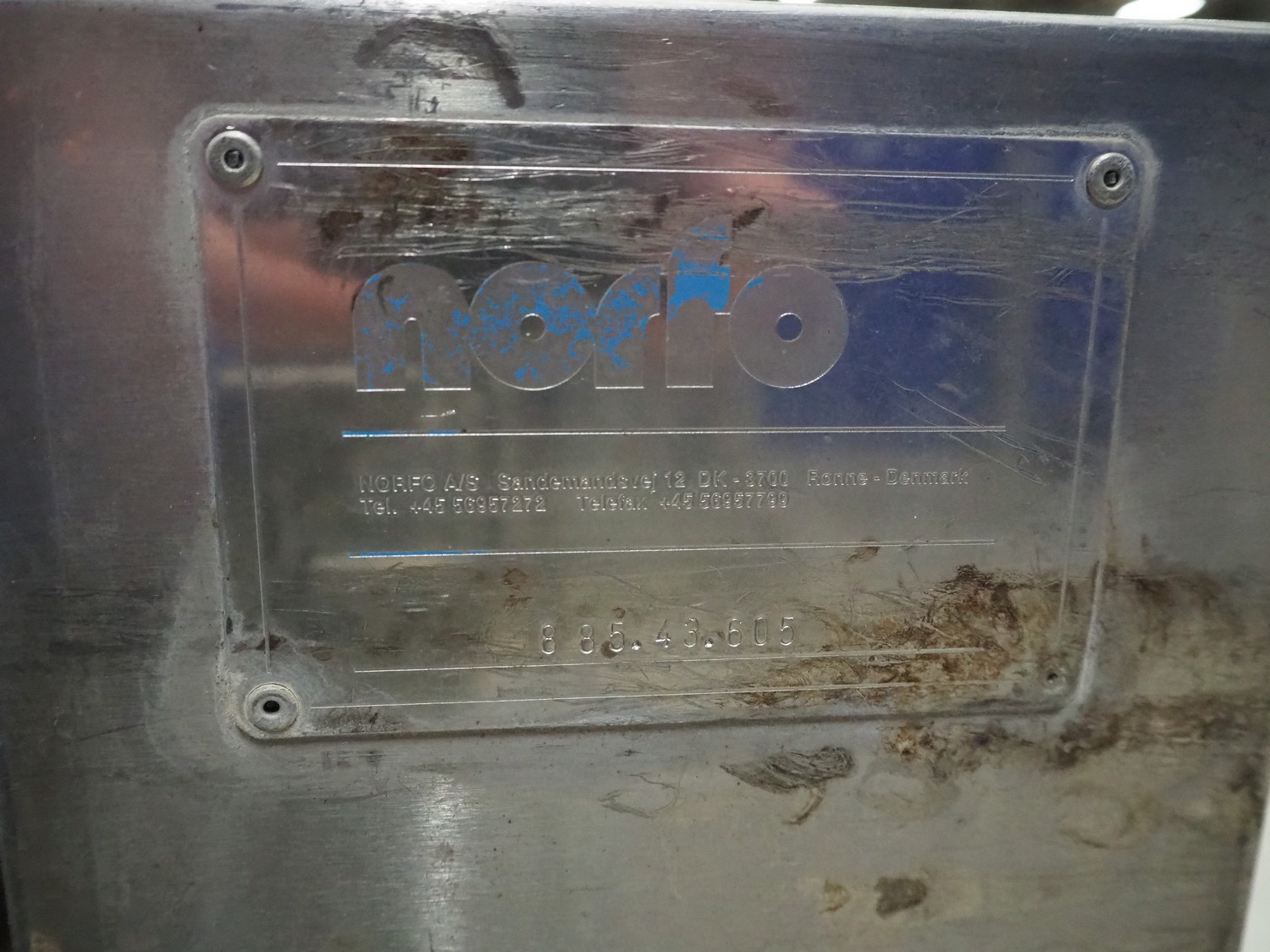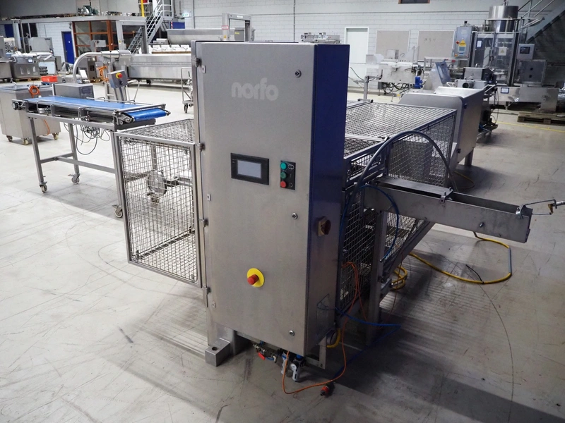 Norfo A/S automatic slicer for fish, type: 885.45.207, year of construction: 2003, 400 V, 3 Ph, 50 Hz, 25/32 A, 6.5 kW, plastic belts, belt width: 250 mm, total dimensions: 3600 mm x 2500 mm x 1600 mm. Including mobile infeed belt, number: 885.43.605, plastic belts, belt width: 380 mm, total dimensions: 2100 mm x 800 mm x 1400 mm. Slicer is missing belts. Including cabinet with parts.