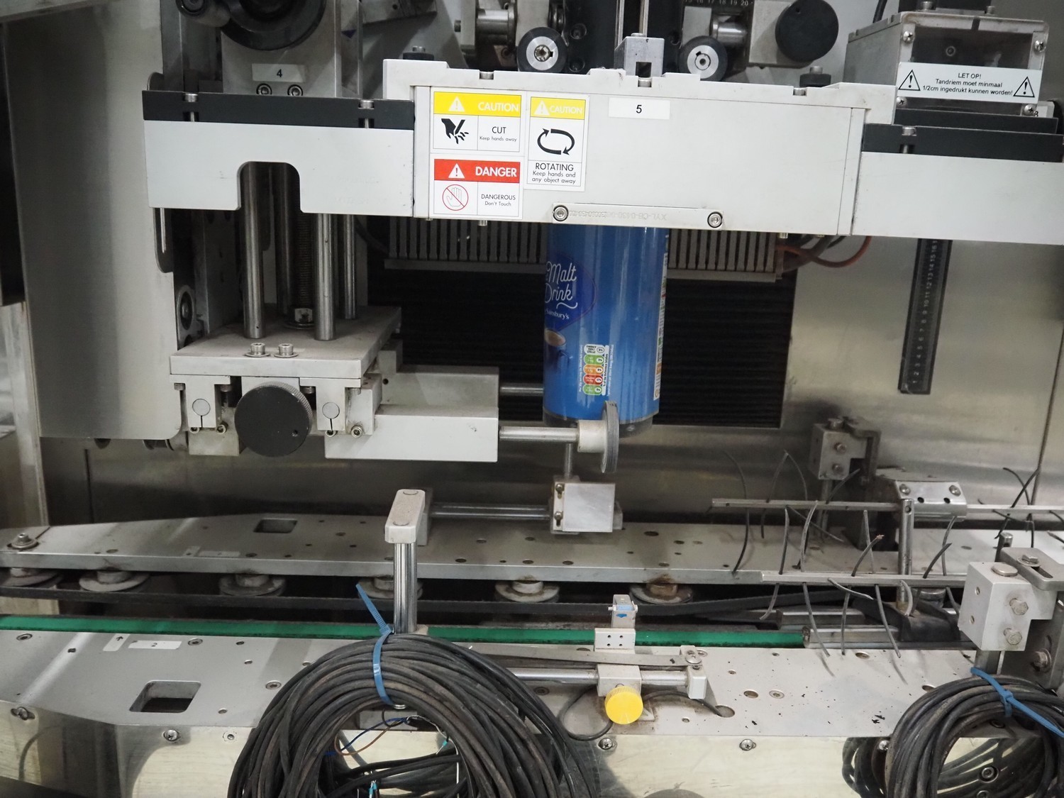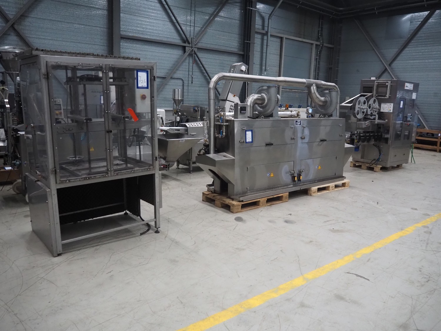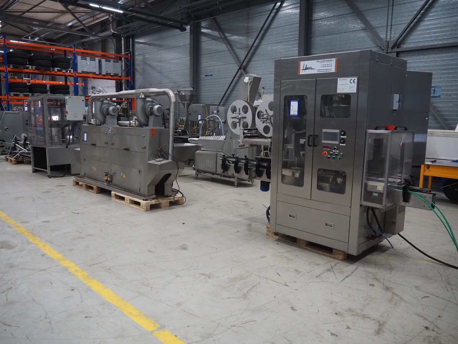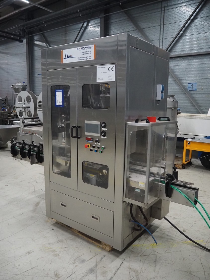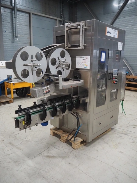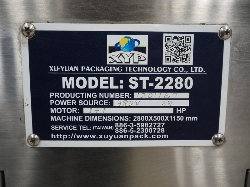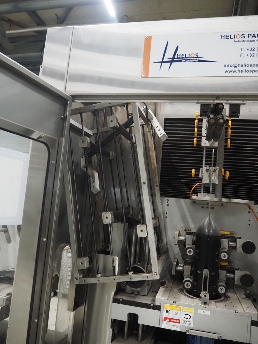 Helios / Xu-Yuan packaging, labelling, shrinking and cooling line for pots, consisting of: Helios packaging and labelling machine, model: XYL-250S, serial number: HSA-250S-026, 380 V, 3 Ph, 0.75 kW, maximum belt width: 90 mm, clearance: 130 mm x 480 mm, dimensions: 3650 mm x 1050 mm x 2250 mm. Xu-Yuan steam shrinking tunnel, model: ST-2280, number: 1201167, 380 V, 3 Ph, clearance: 200 mm x 480 mm, total dimensions: 2800 mm x 500 mm x 1150 mm. Pneumatic cooling machine for pots, clearance: dimensions: 1500 mm x 1000 mm x 2000 mm. Including transport belts with uprights, pallet with blower and pallet extra parts.