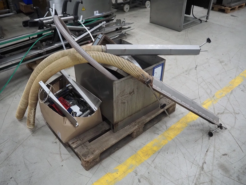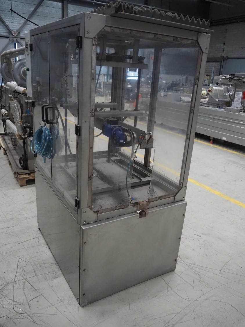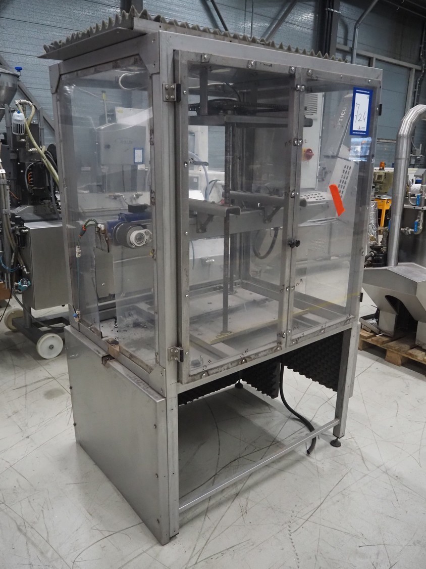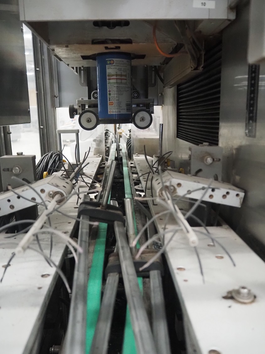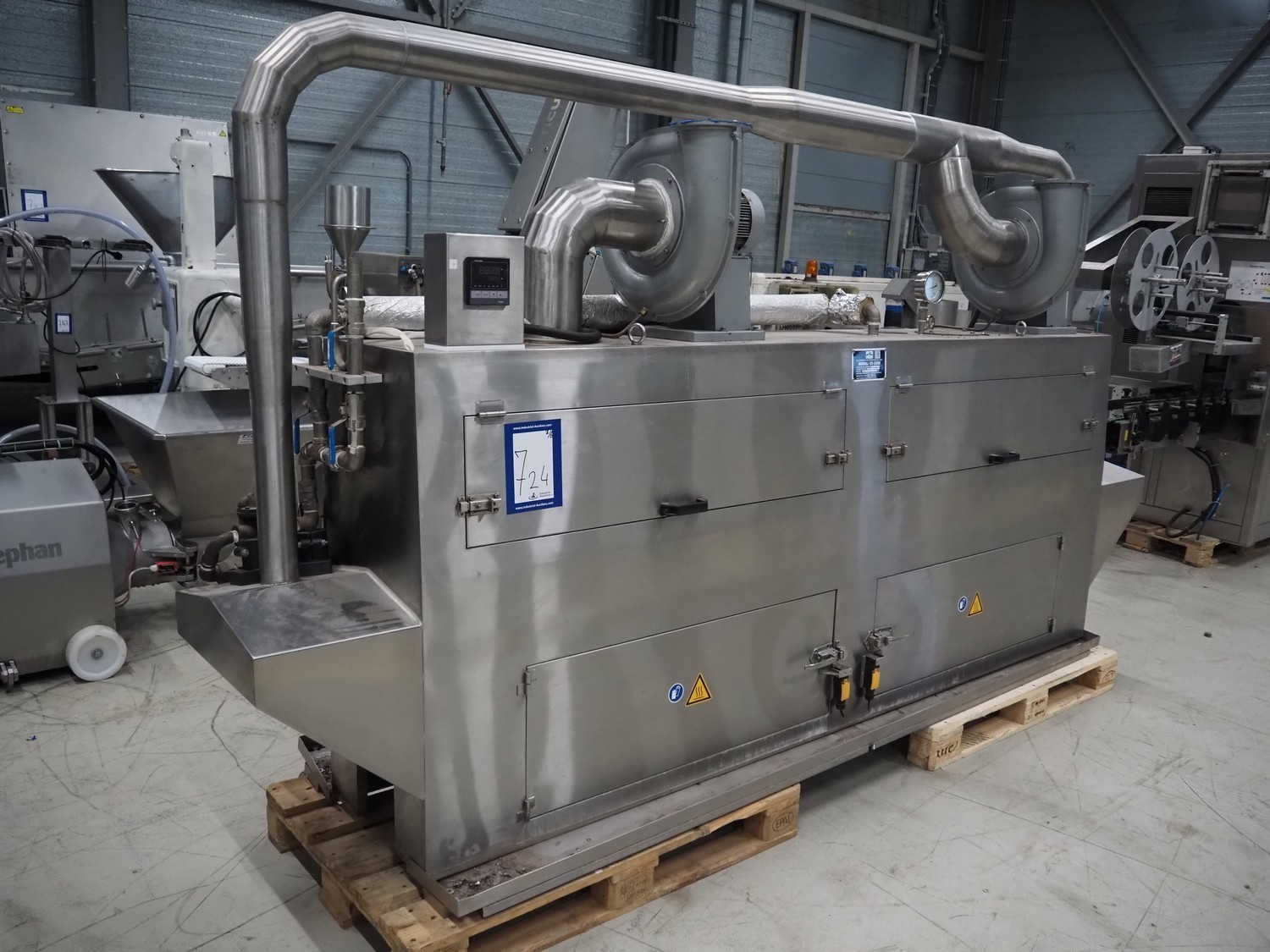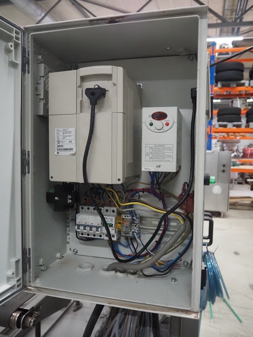Helios / Xu-Yuan packaging, labelling, shrinking and cooling line for pots, consisting of: Helios packaging and labelling machine, model: XYL-250S, serial number: HSA-250S-026, 380 V, 3 Ph, 0.75 kW, maximum belt width: 90 mm, clearance: 130 mm x 480 mm, dimensions: 3650 mm x 1050 mm x 2250 mm. Xu-Yuan steam shrinking tunnel, model: ST-2280, number: 1201167, 380 V, 3 Ph, clearance: 200 mm x 480 mm, total dimensions: 2800 mm x 500 mm x 1150 mm. Pneumatic cooling machine for pots, clearance: dimensions: 1500 mm x 1000 mm x 2000 mm. Including transport belts with uprights, pallet with blower and pallet extra parts.