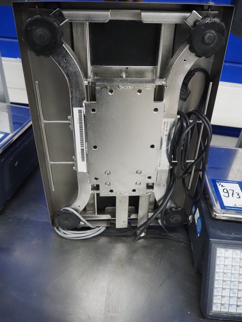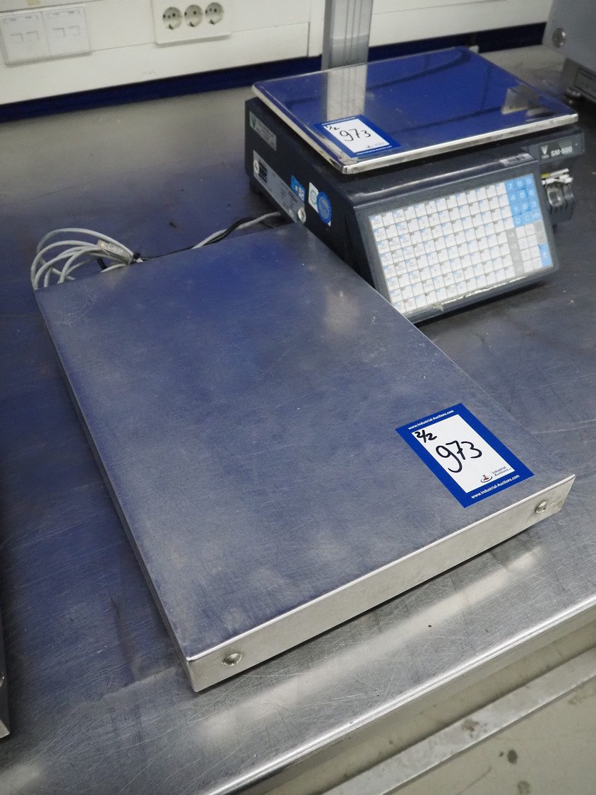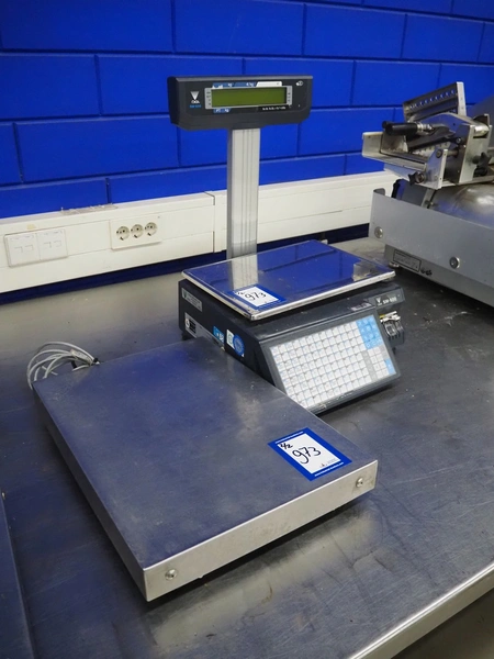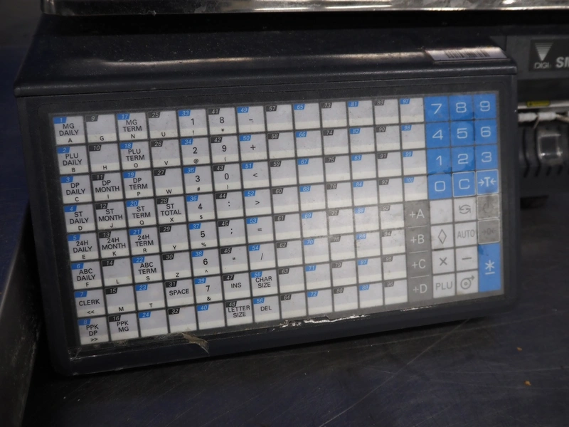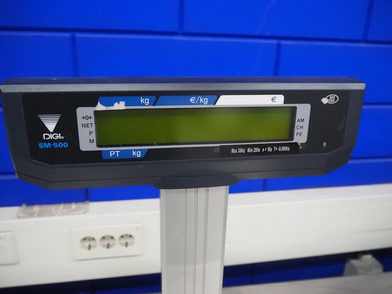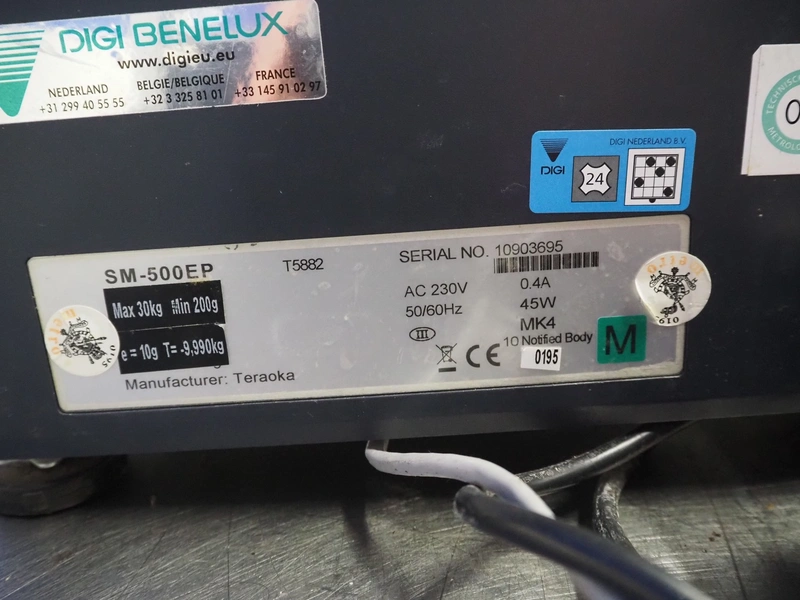 Digi Benelux weighing scale with label printer and extra scale, model: SM-500EP, serial number: 10903695, 230 V, 50/60 Hz, 0.4 A, 45 W, maximum capacity: 30 kg, minimum capacity: 200 g, e= 10 g, T= -9.990 kg, scale dimensions: 380 mm x 280 mm, total dimensions: 400 mm x 480 mm x 560 mm. Dimensions extra scale: 500 mm x 350 mm.