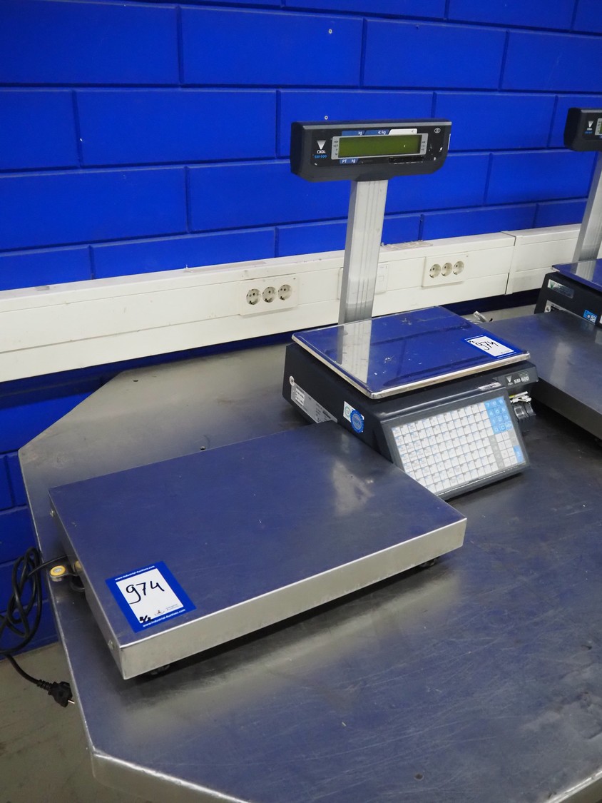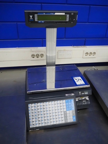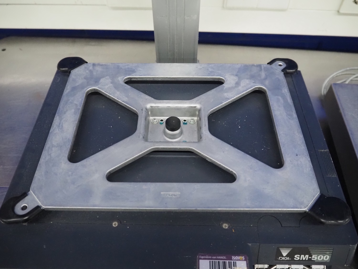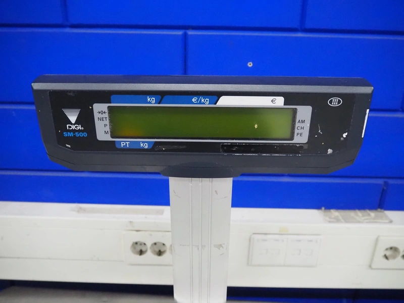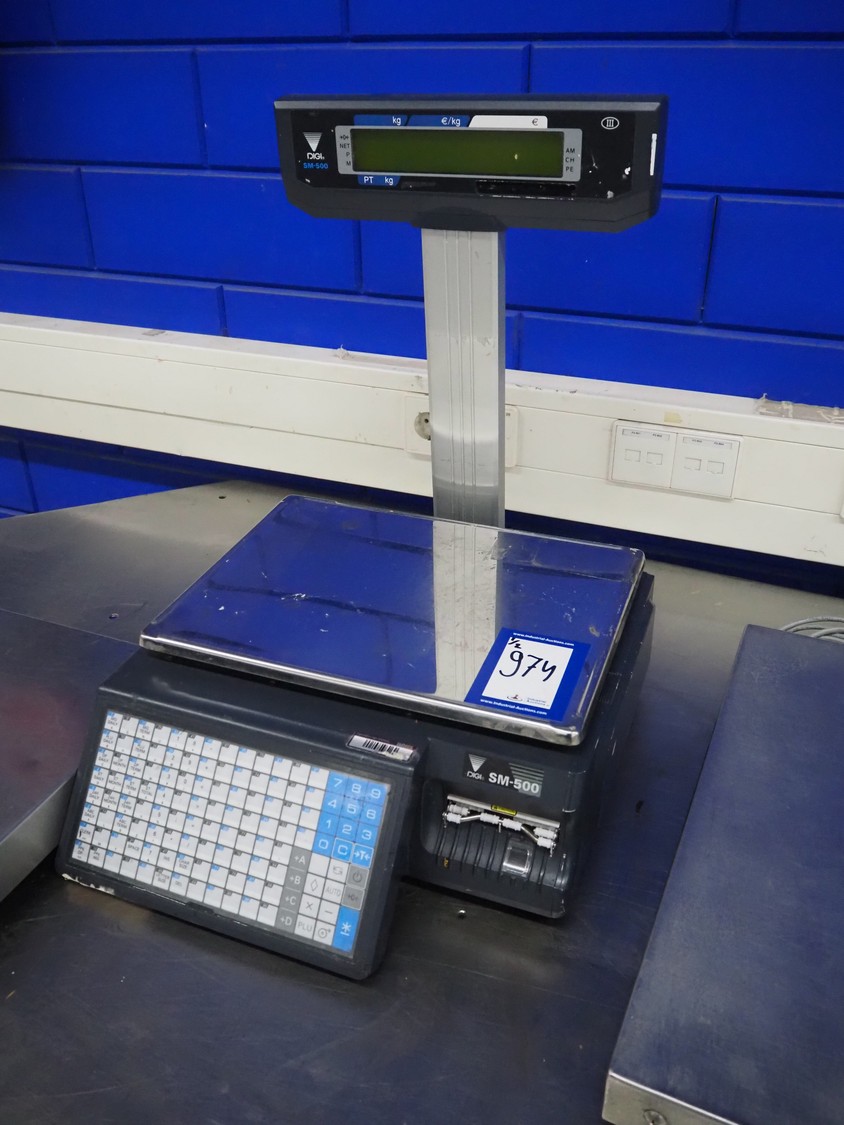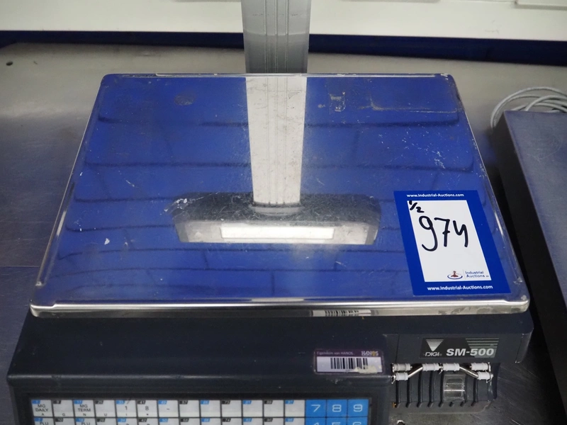 Digi Benelux weighing scale with label printer and extra scale, model: SM-500EP, serial number: 10903679, 230 V, 50/60 Hz, 0.4 A, 45 W, maximum capacity: 30 kg, minimum capacity: 200 g, e= 10 g, T= -9.990 kg, scale dimensions: 380 mm x 280 mm, total dimensions: 400 mm x 480 mm x 560 mm. Dimensions extra scale: 500 mm x 350 mm.