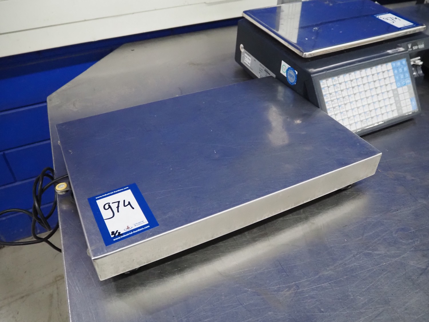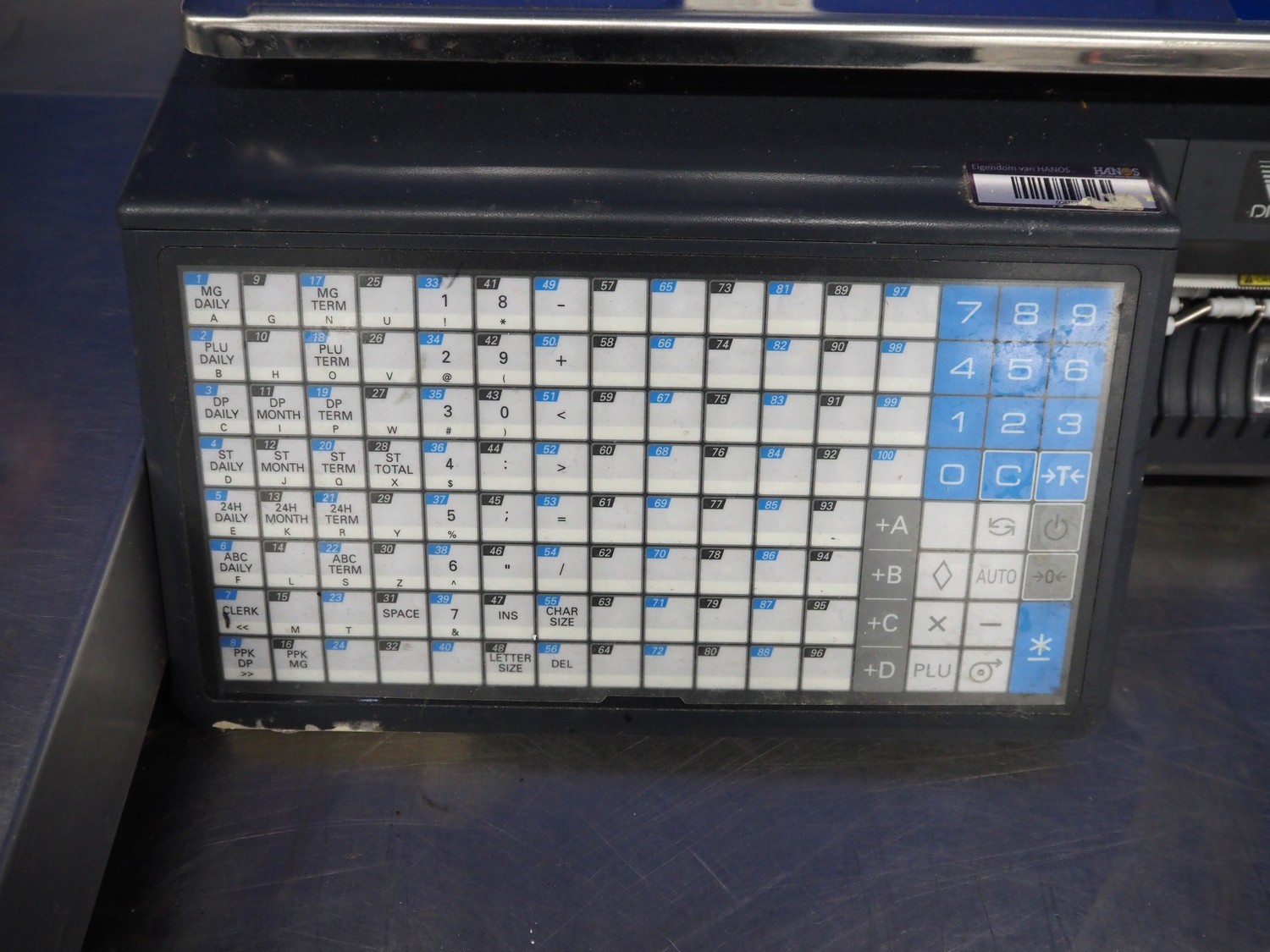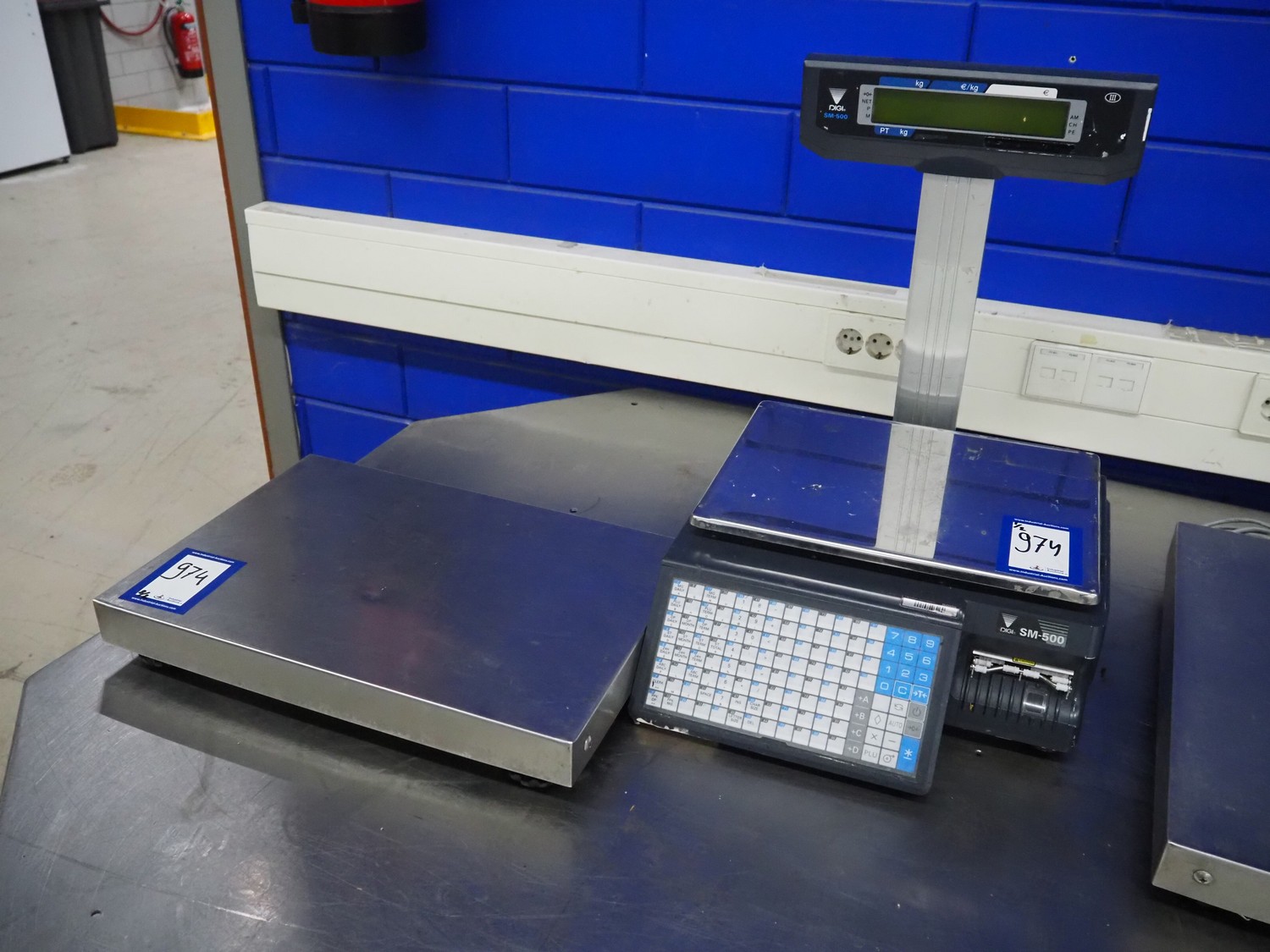 Digi Benelux weighing scale with label printer and extra scale, model: SM-500EP, serial number: 10903679, 230 V, 50/60 Hz, 0.4 A, 45 W, maximum capacity: 30 kg, minimum capacity: 200 g, e= 10 g, T= -9.990 kg, scale dimensions: 380 mm x 280 mm, total dimensions: 400 mm x 480 mm x 560 mm. Dimensions extra scale: 500 mm x 350 mm.