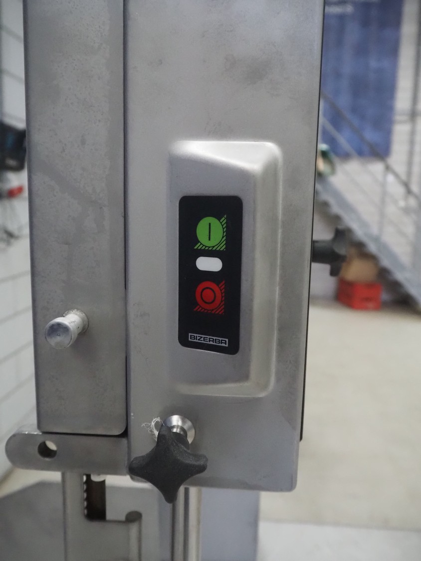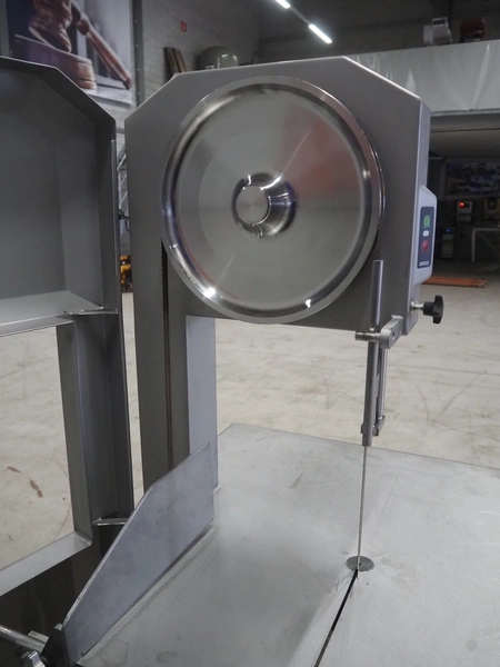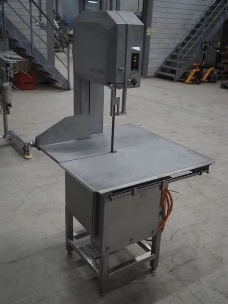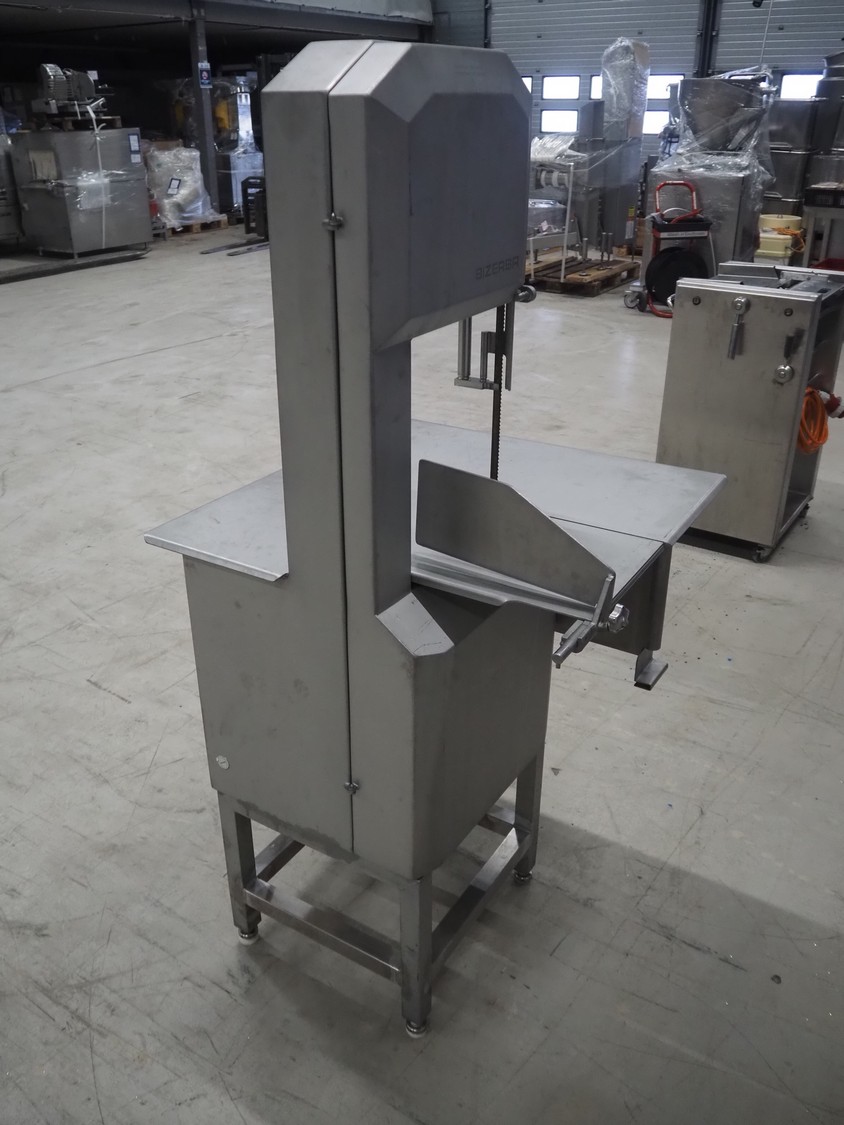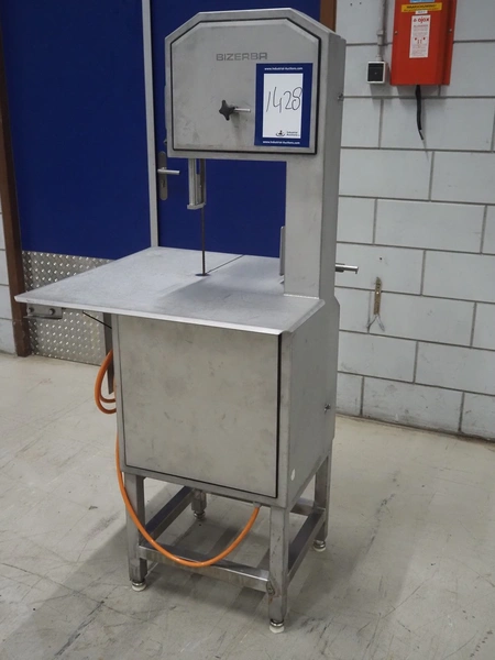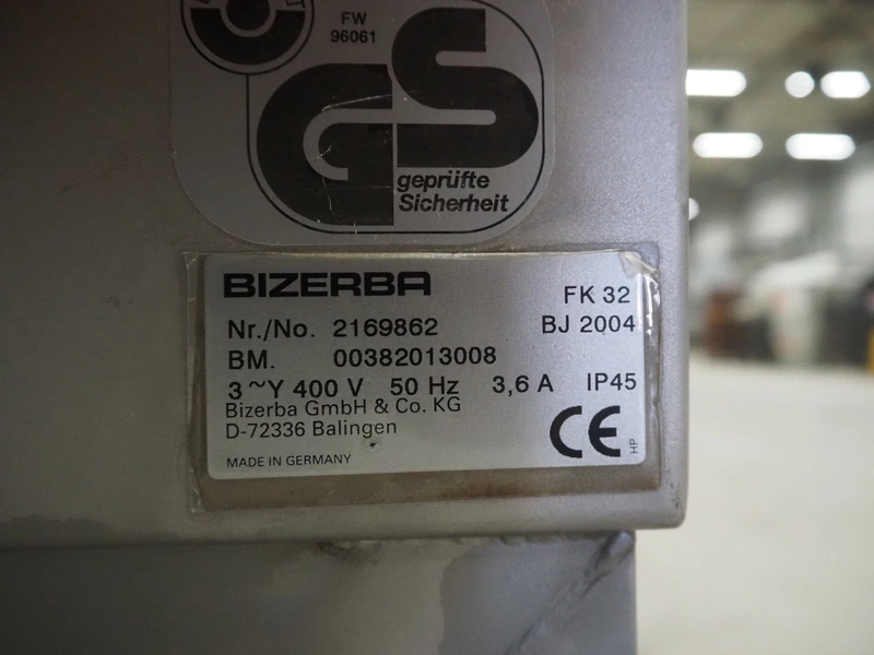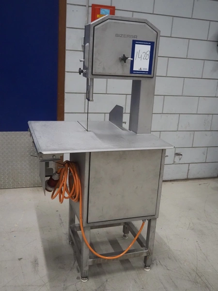 Bizerba bandsaw, model: FK 32, machine number: 2169862, year of construction: 2004, 400 V, 3 Ph, 50 Hz, 3.6 A, table dimensions: 750 mm x 750 mm, total dimensions: 750 mm x 750 mm x 1600 mm.