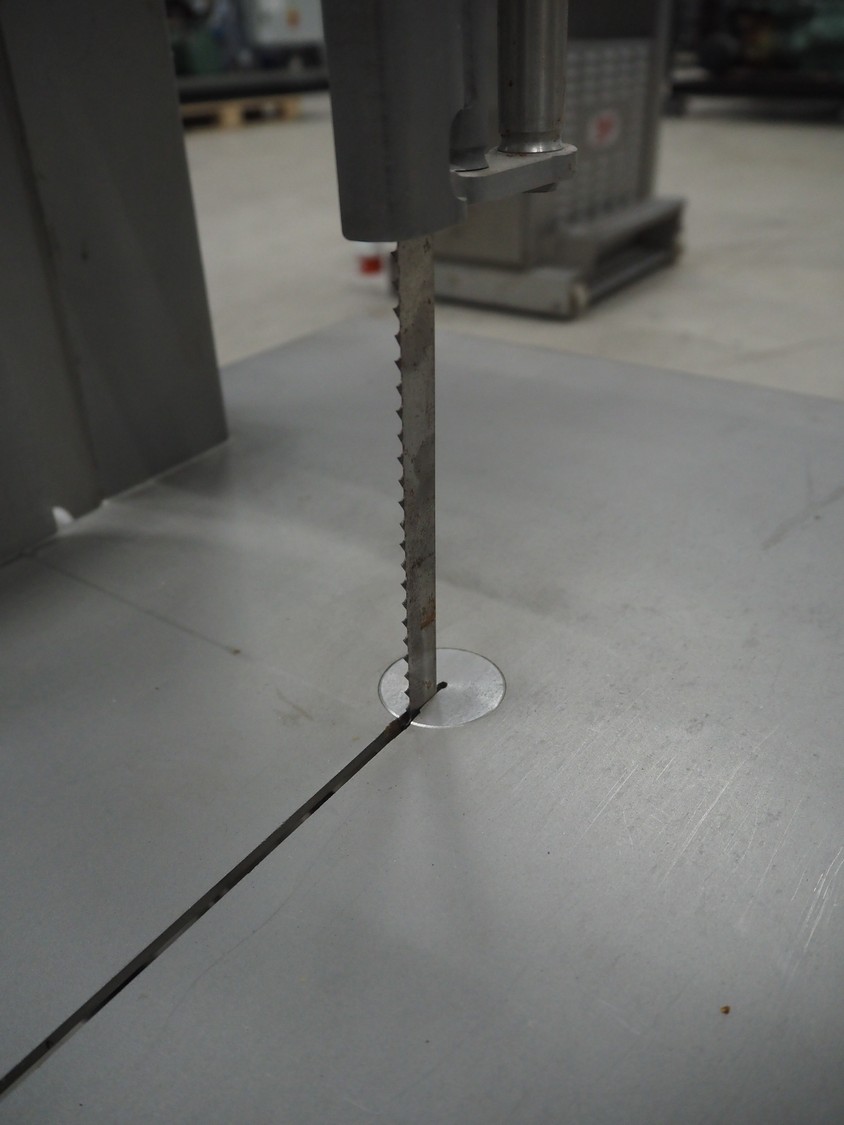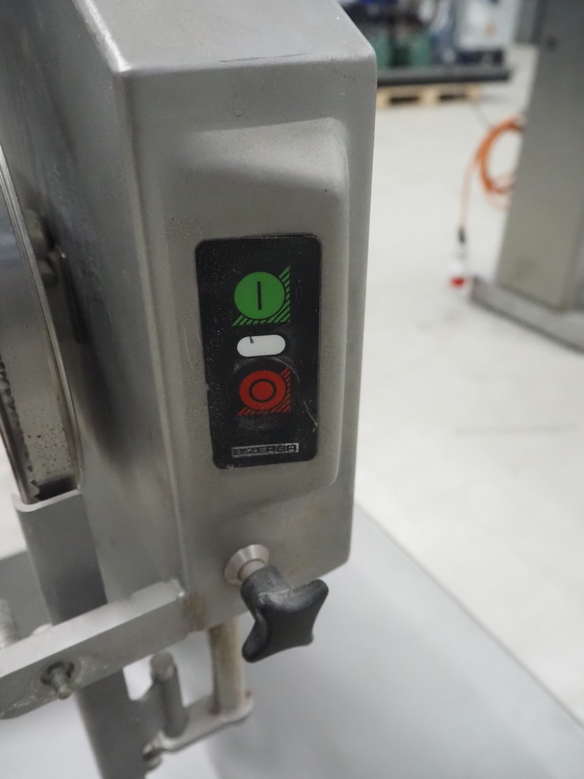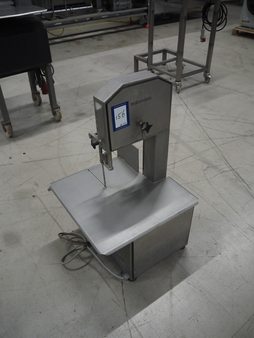 Bizerba bandsaw, type: FK 23, number: 1664751, year of construction: 1999, 400 V, 3 Ph, 50 Hz, 2.5 A, table dimensions: 530 mm x 530 mm, total dimensions: 530 mm x 530 mm x 900 mm. Without cover.