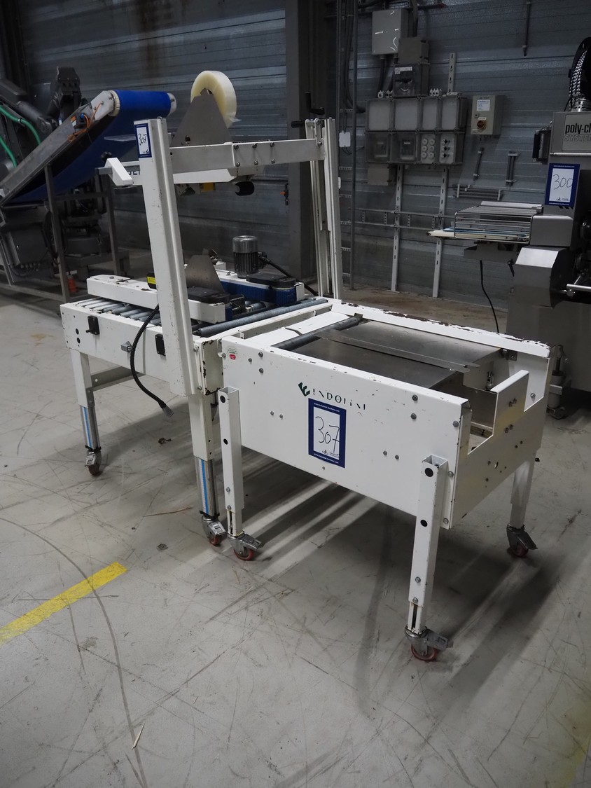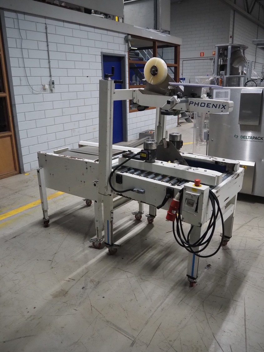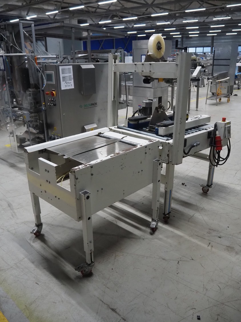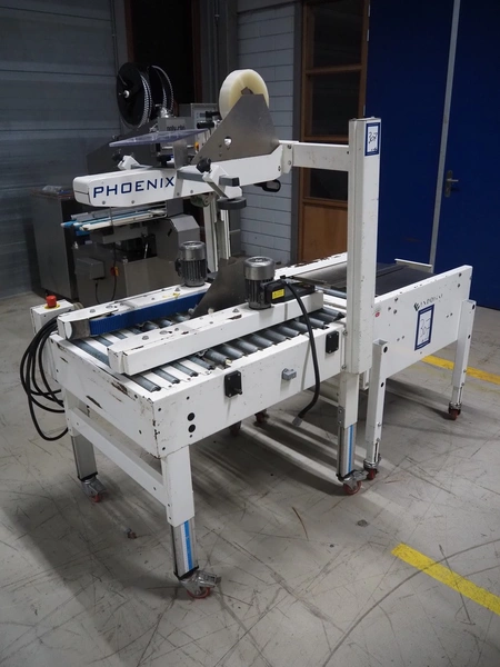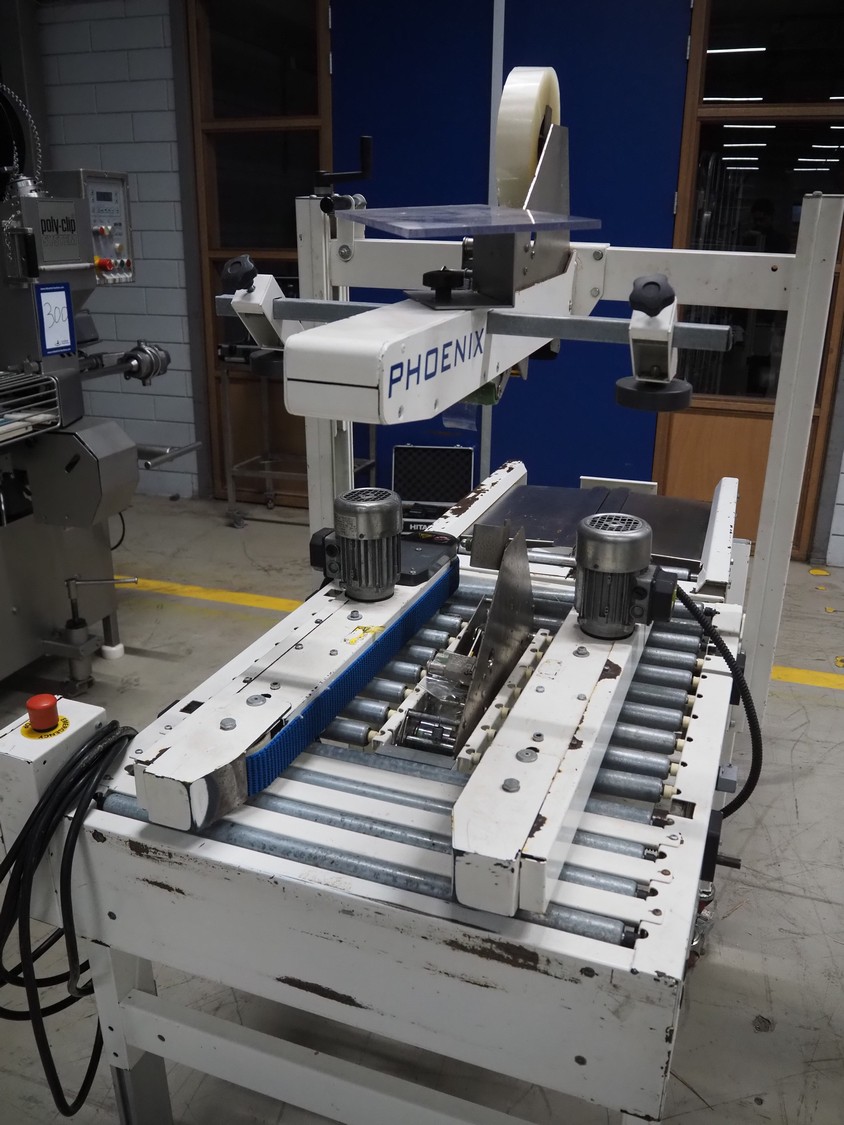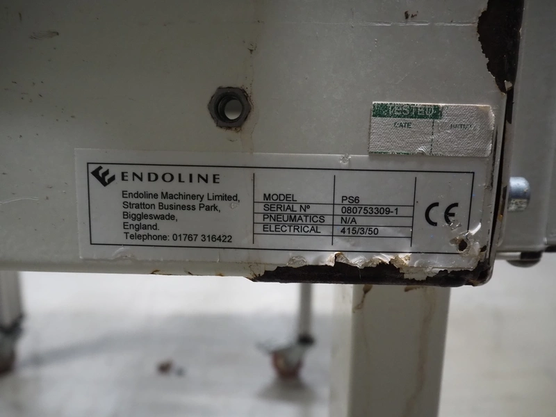 Endoline mobile box closing machine, model: PS6, serial number: 080753309-1, aluminium rollers, roller width: 670 mm, total dimensions: 1000 mm x 900 mm x 1720 mm, 900 mm x 750 mm x 850 mm.