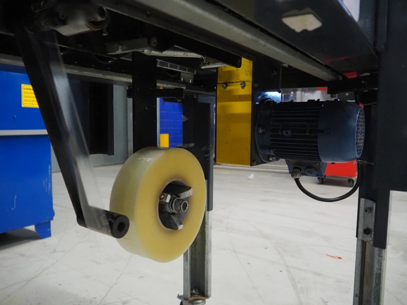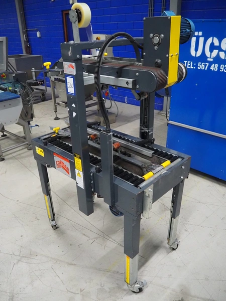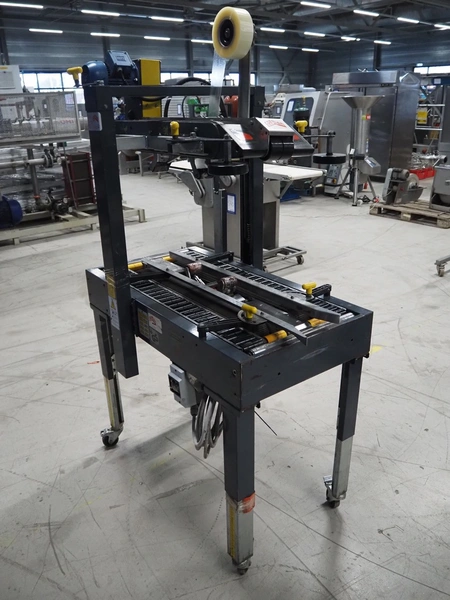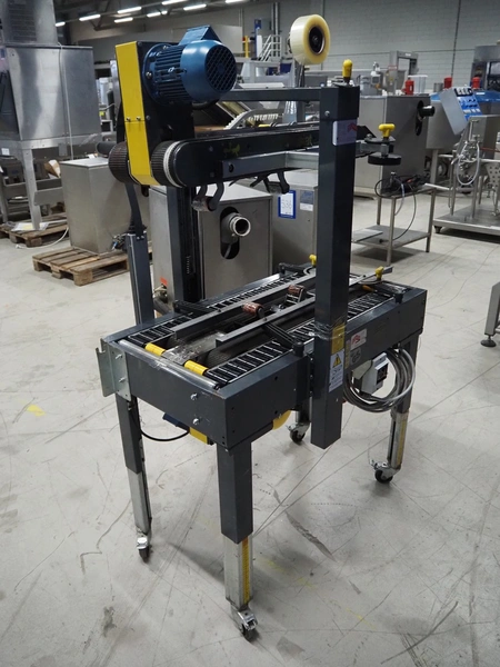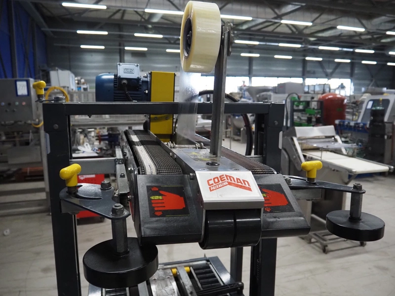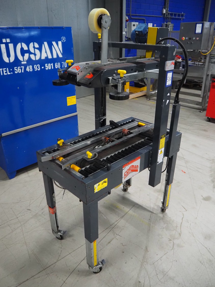Coeman Packaging mobile box closing machine, model: SM2, serial number: 7617, year of construction: 1988, 380 V, 3 Ph, 50 Hz, 1.4 A, 240 W, plastic belts, belt width: 75 mm, total dimensions: 1150 mm x 700 mm x 1800 mm.