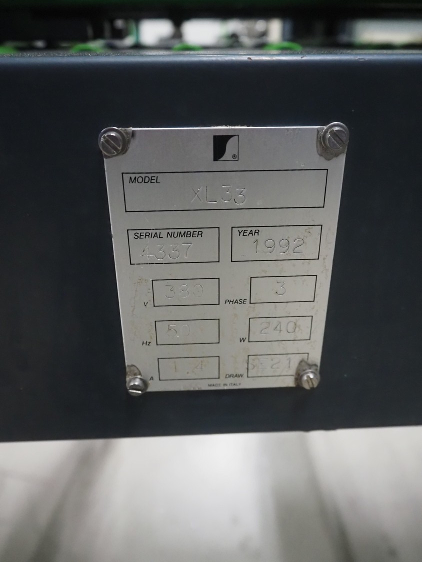 SIAT S.p.A. box closing machine, model: XL33, serial number: 4337, year of construction: 1992, 380 V, 3 Ph, 50 Hz, 1.4 A, 240 W, dimensions: 1950 mm x 1000 mm x 1700 mm.