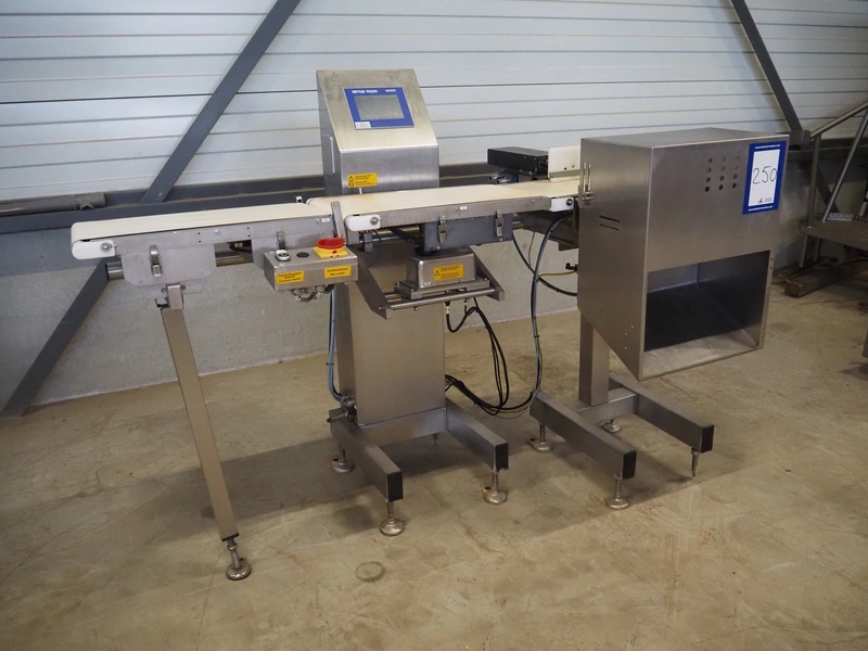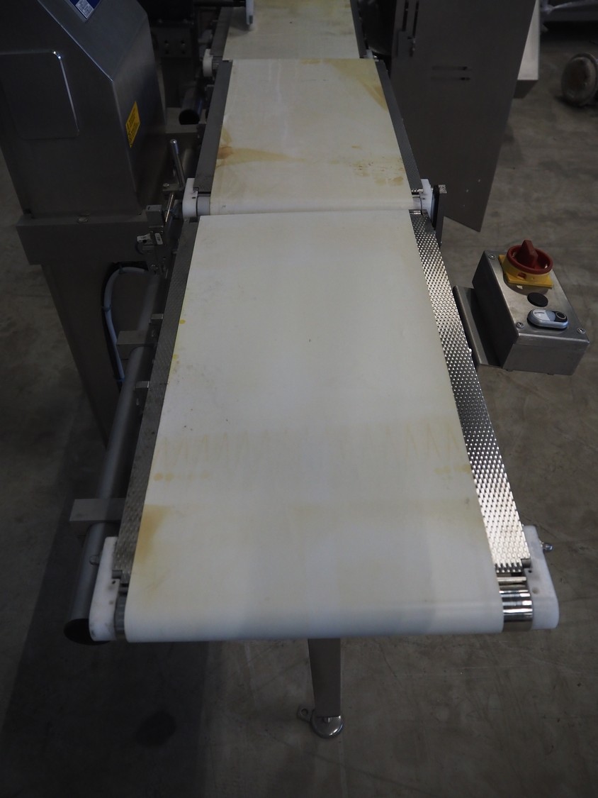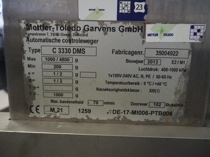 Mettler-Toledo Garvens GmbH checkweigher with rejector, type: C 3330 DMS, fabrication number: 35004922, year of construction: 2013, 1x100-240 V, 50-60 Hz, maximum belt speed: 70 m/min, throughput: 102 pcs/min, min: 200 gram, max: 1000/4800 gram, e= 1/2 gram, belt width: 300 mm, total dimensions: 1900 mm x 1100 mm x 1440 mm.