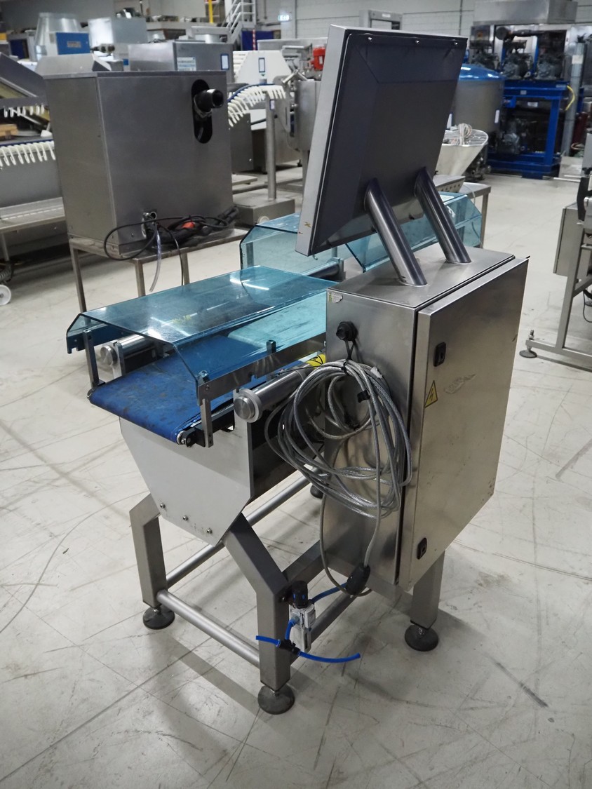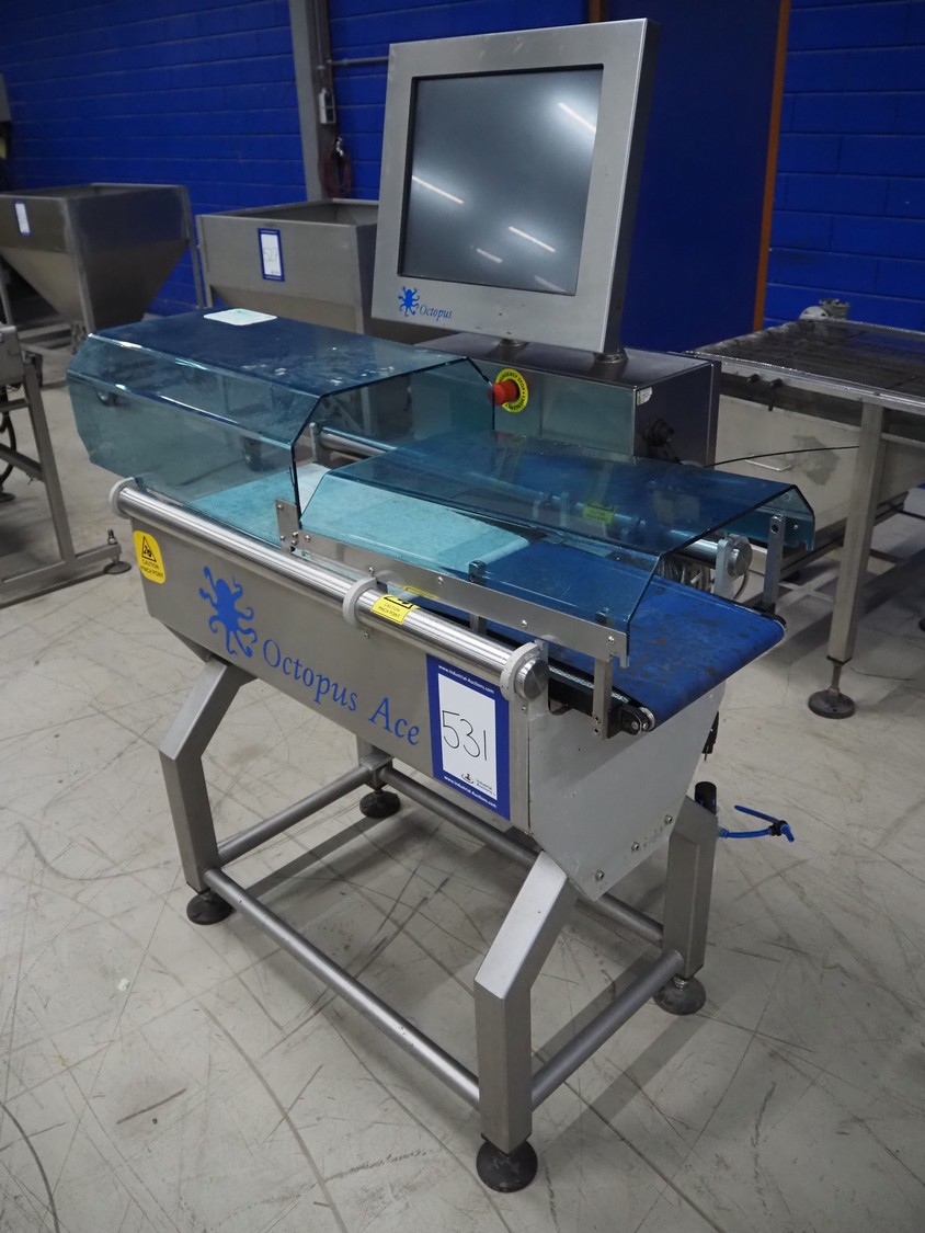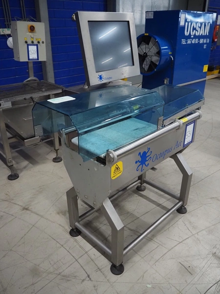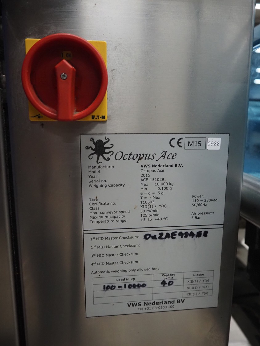 VWS Nederland B.V. checkweigher, model: Octopus Ace, serial number: ACE-151029, year of construction: 2015, 230 V, 1 Ph, 50/60 Hz, 5 bar, plastic belts, belt width: (2x) 290 mm, total dimensions: 1260 mm x 800 mm x 1700 mm.