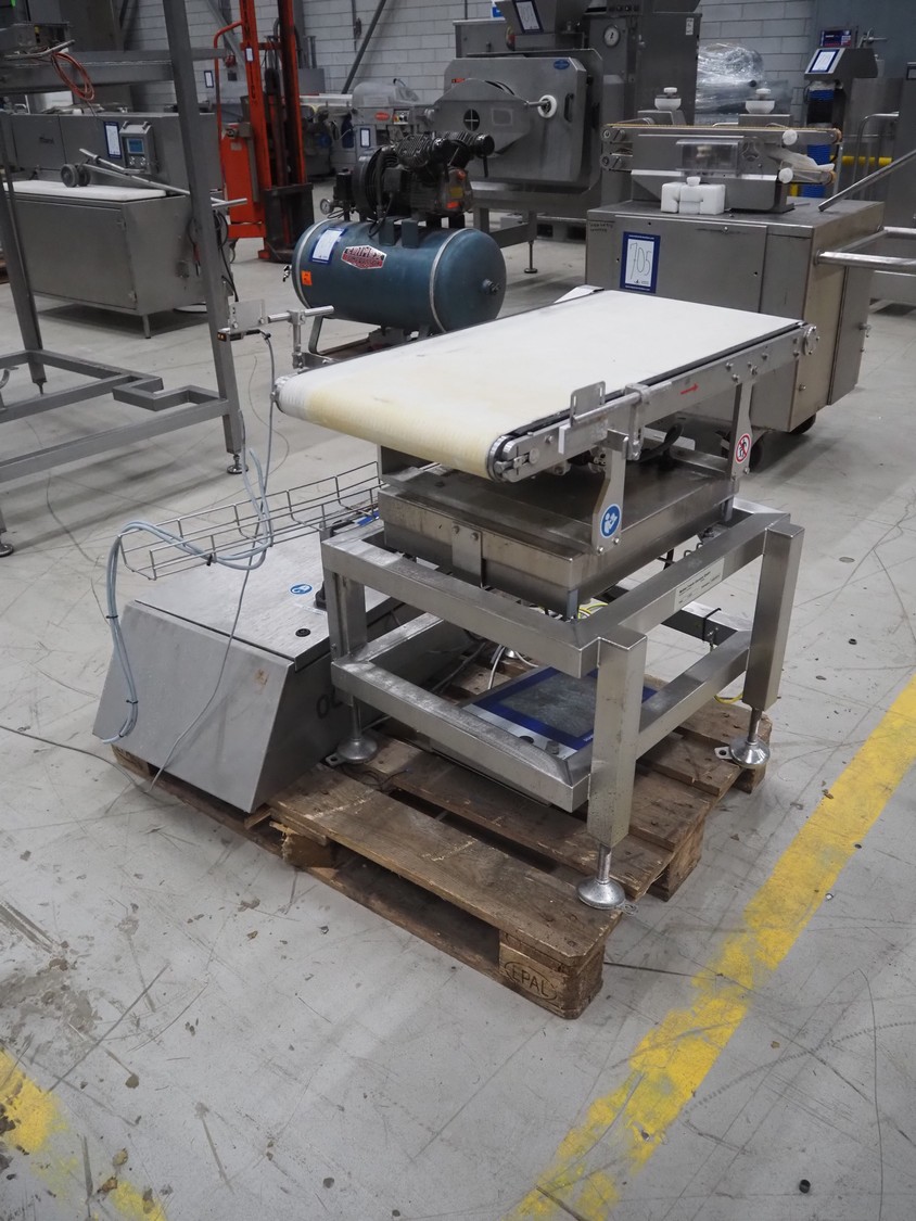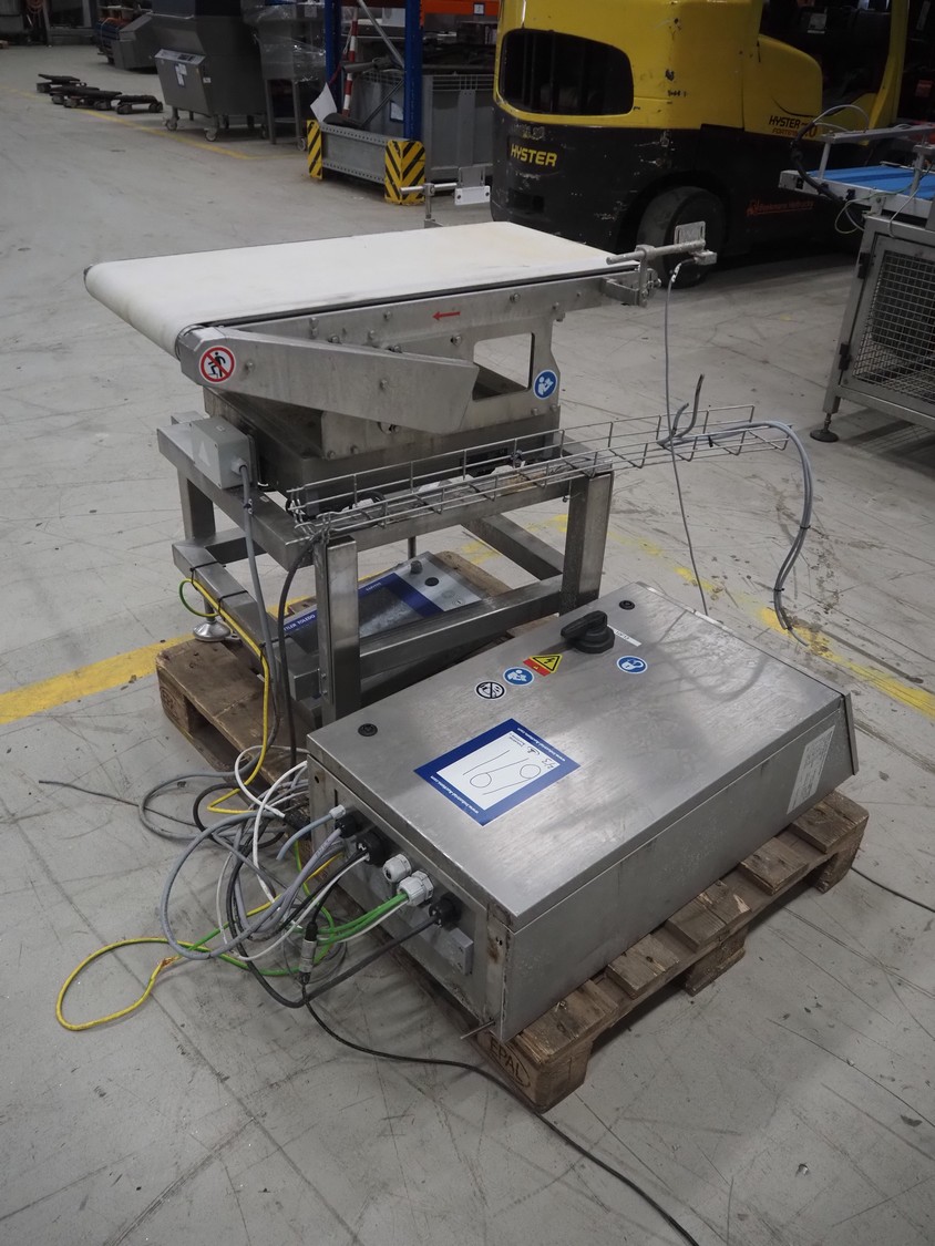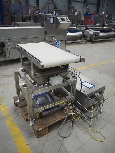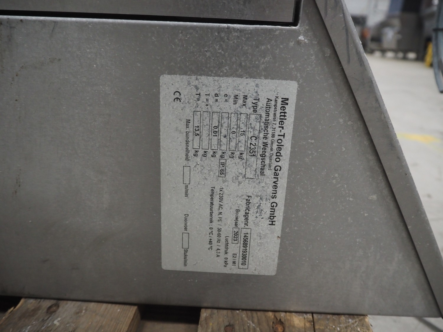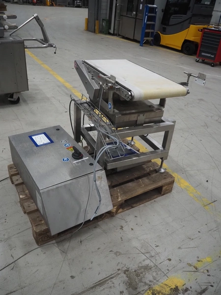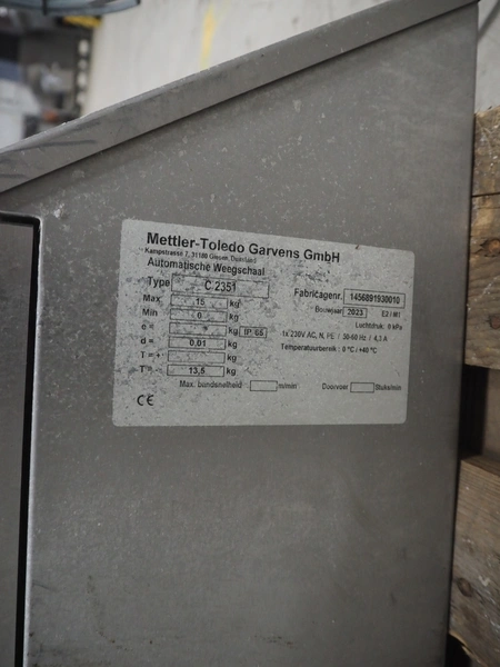 Mettler-Toledo Garvens GmbH checkweigher with scanner, type: C 2351, fabrication number: 1456891930010, year of construction: 2023, 230 V, 1 Ph, 50-60 Hz, 4.3 A, temperature range: 0-40 °C, weighing range: 0-15 kg, plastic belt, belt width: 450 mm, total dimensions: 850 mm x 700 mm x 1700 mm. Screen broken, already dismantled.