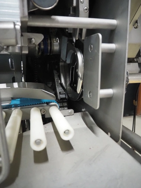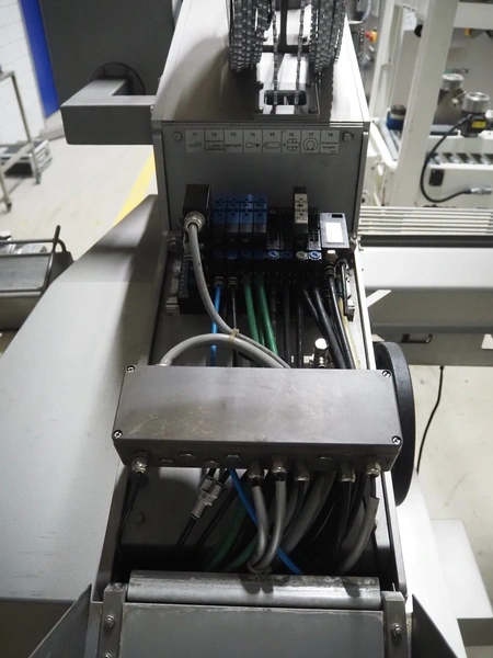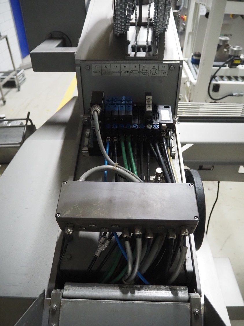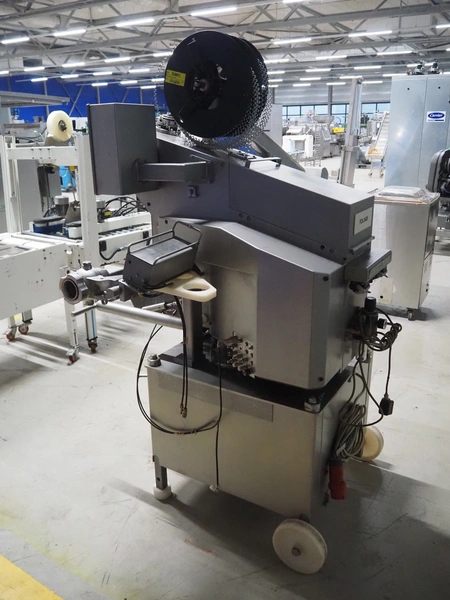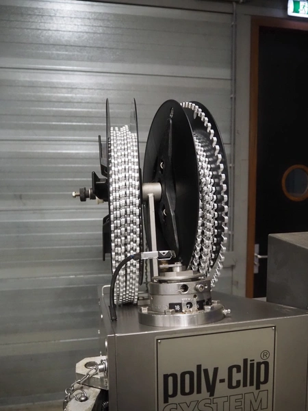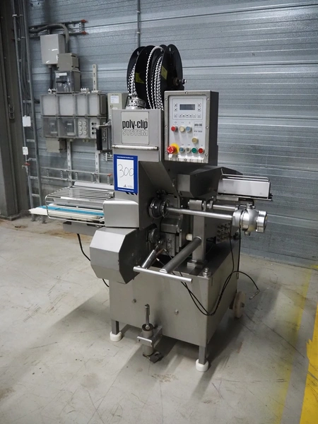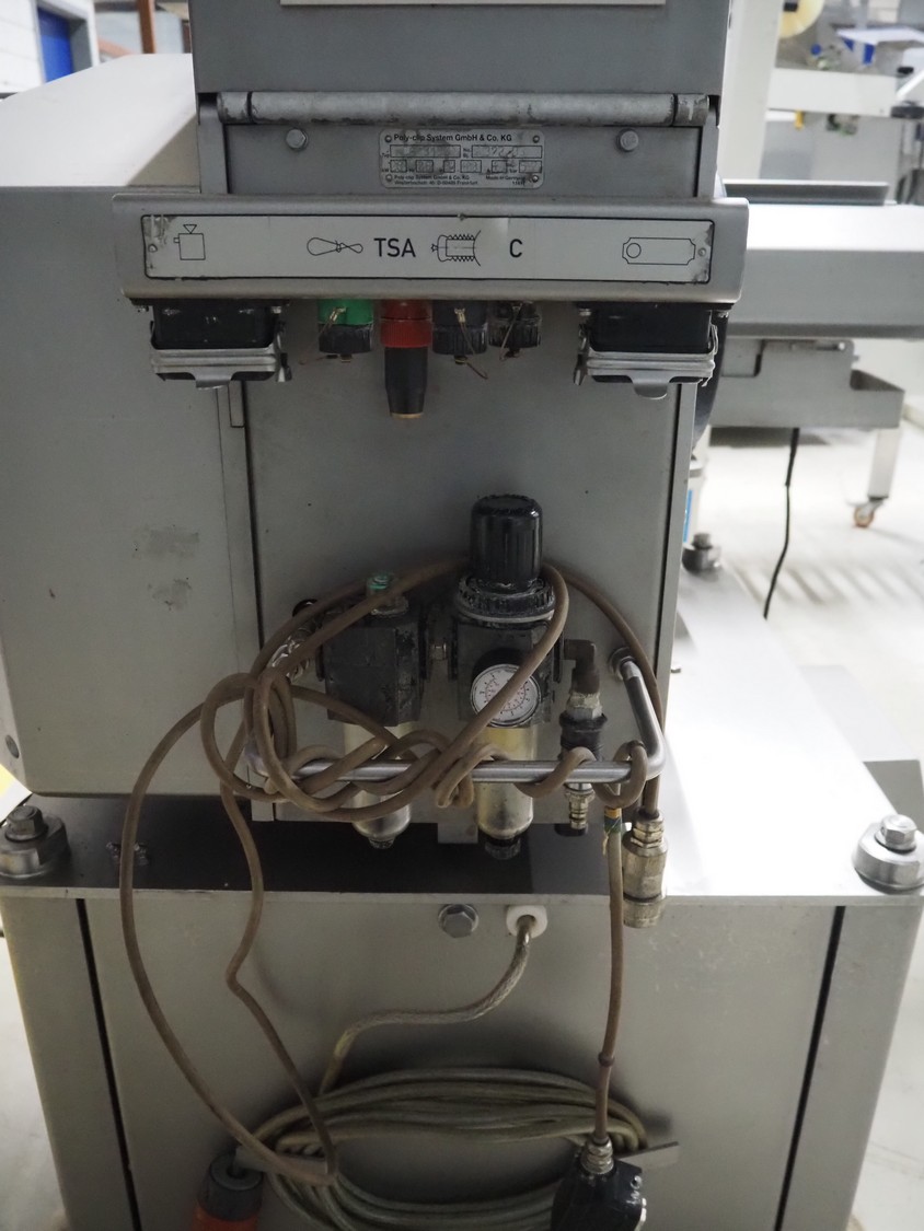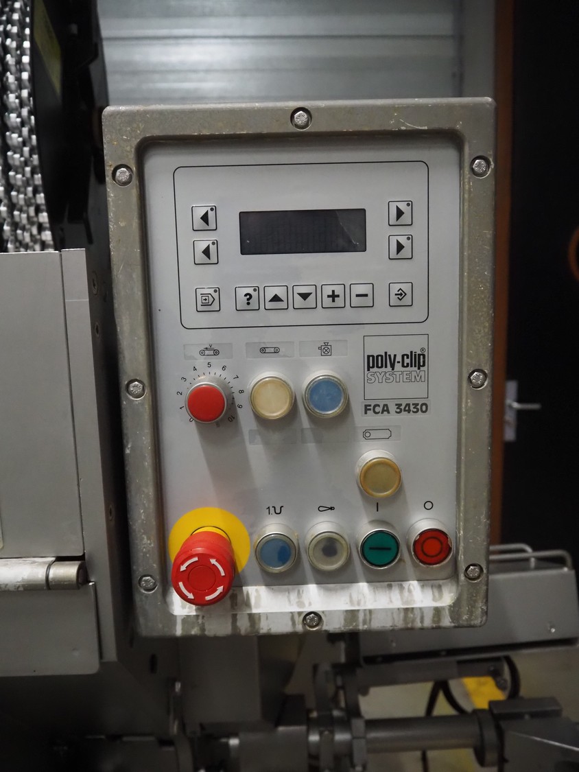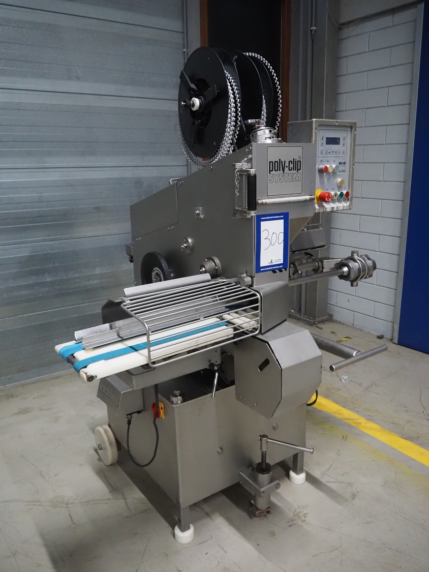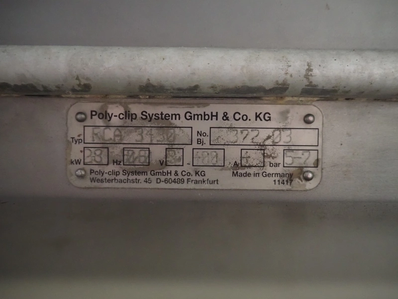 Poly-clip System GmbH & Co. KG mobile automatic double clipper, type: RCA 3430, number: 372, year of construction: 2003, 400 V, 3 Ph, 4 A, 3.8 kW, dimensions: 1300 mm x 1400 mm x 1860 mm.