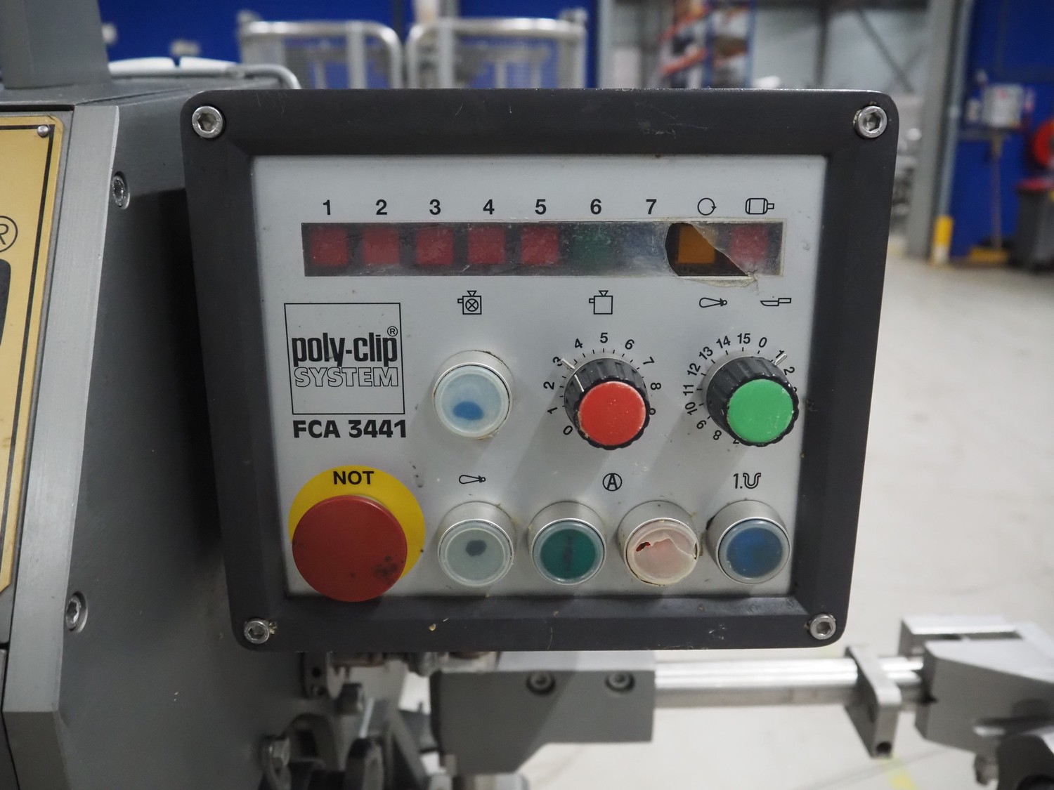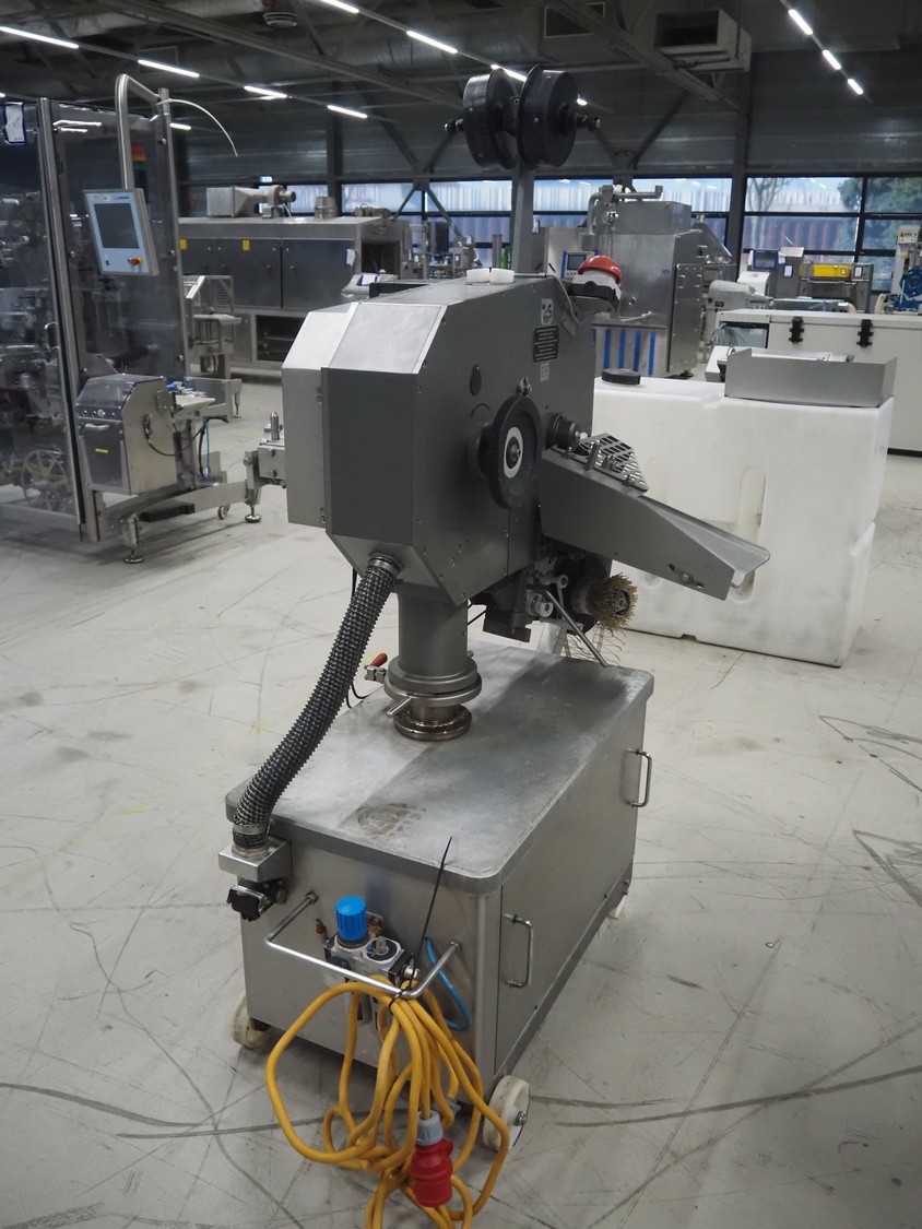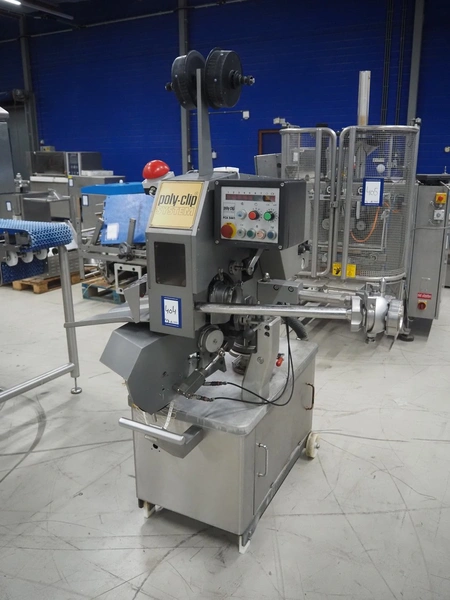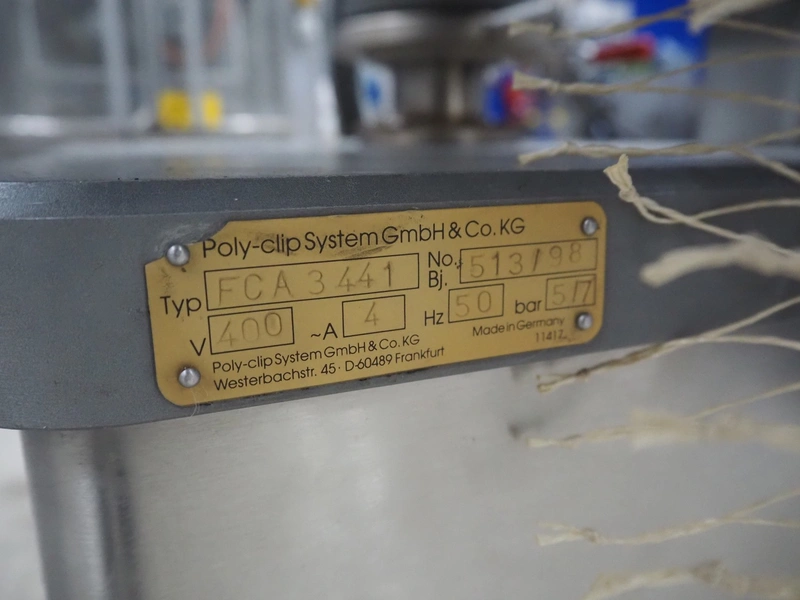 Poly-clip system GmbH & Co. KG mobile double clipper, type: FCA 3 441, number: 513, year of construction: 1998, 400 V, 50 Hz, 4 A, dimensions: 1200 mm x 650 mm x 1880 mm.