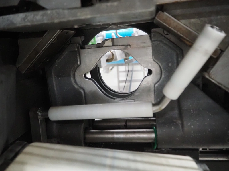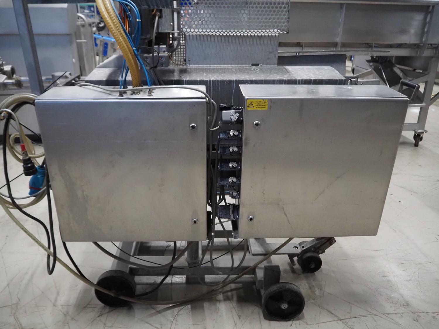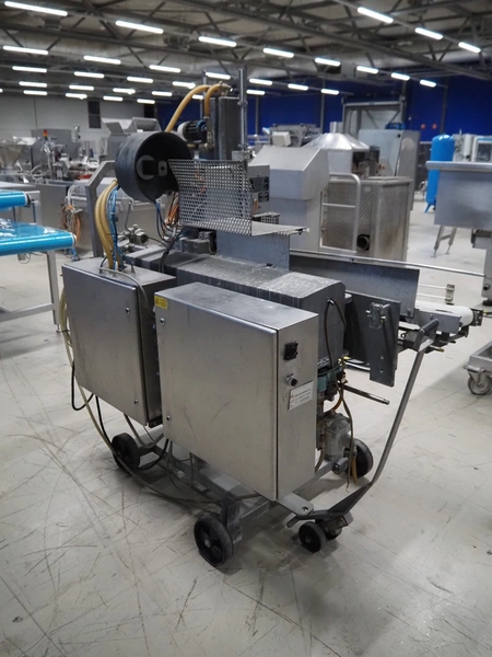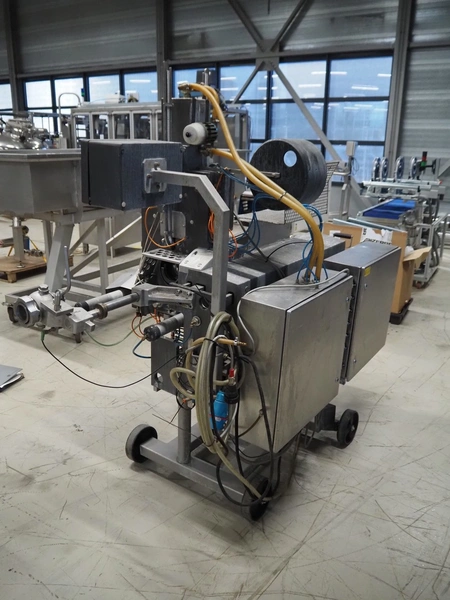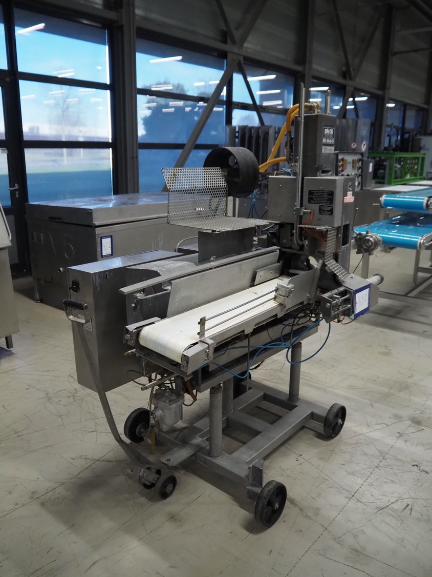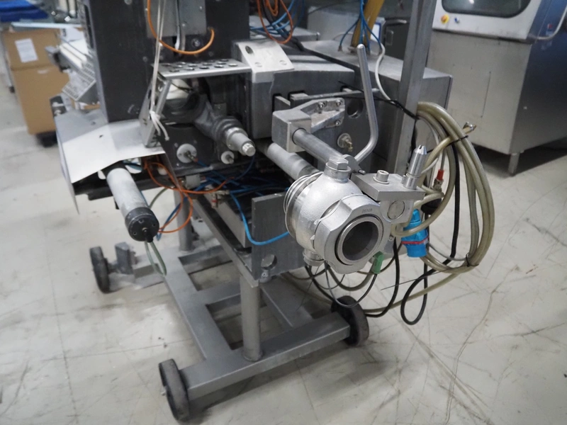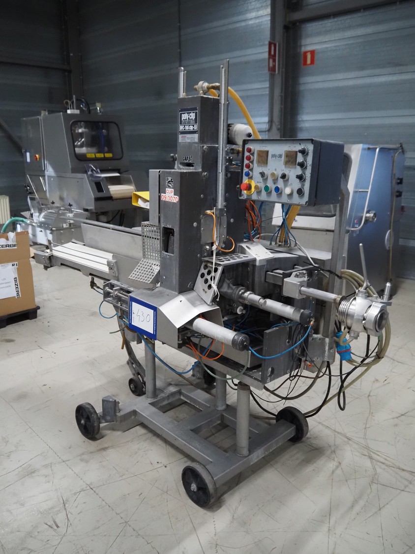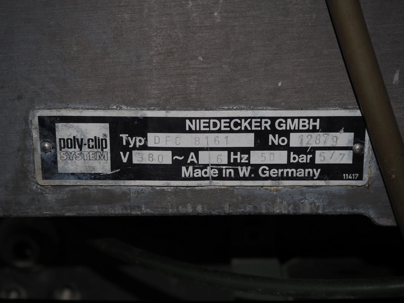 Poly-clip system GmbH & Co. KG mobile double automatic clipper, type: DFC 8161, number: 12879, 380 V, 1 Ph, 50 Hz, 5/7 bar, plastic belt, belt width: 185 mm, total dimensions: 2200 mm x 1100 mm x 1950 mm.