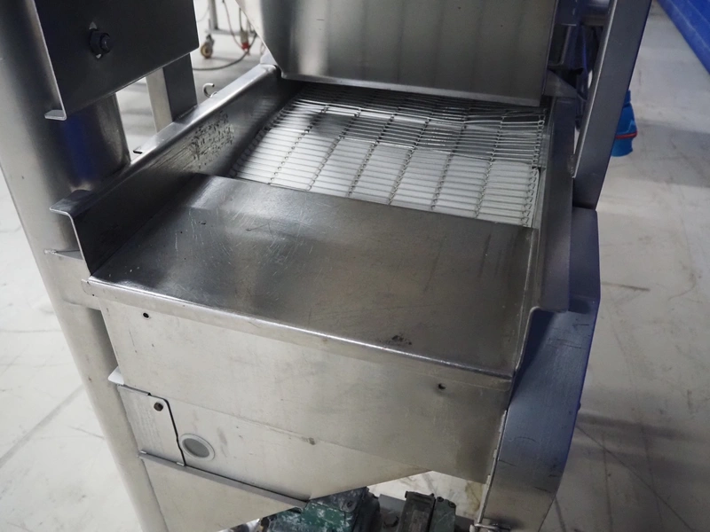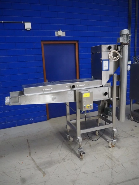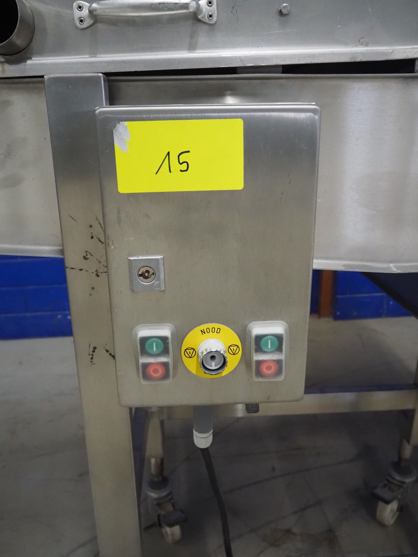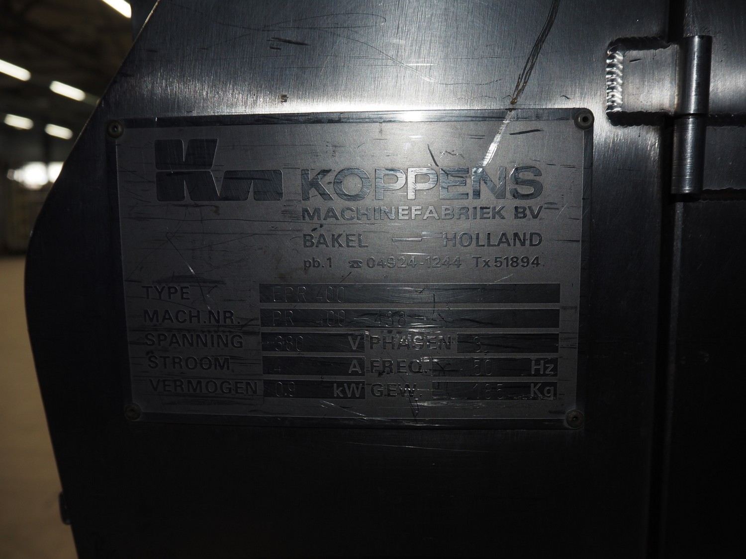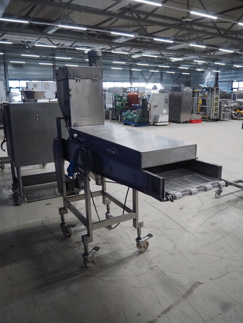 Koppens mobile battering machine, type: EPR 400, machine number: PR 400/438, 380 V, 3 Ph, 50 Hz, 4 A, 0.9 kW, weight: 185 kg, s/s mesh belt, belt width: 400 mm, total dimensions: 2100 mm x 700 mm x 1900 mm.