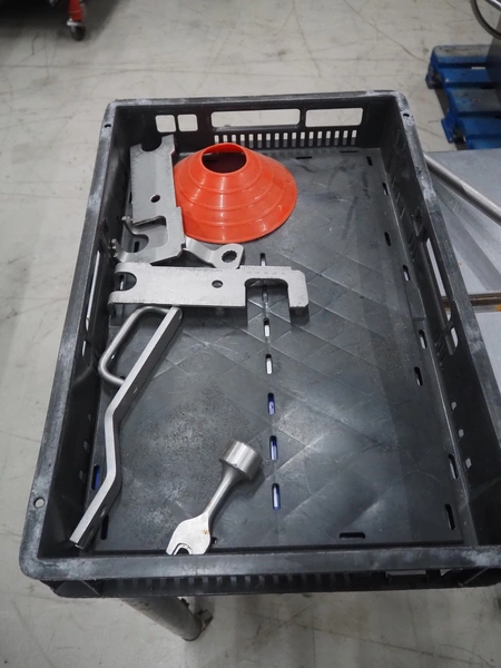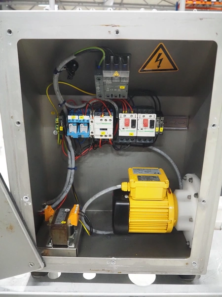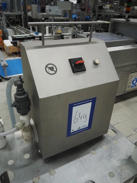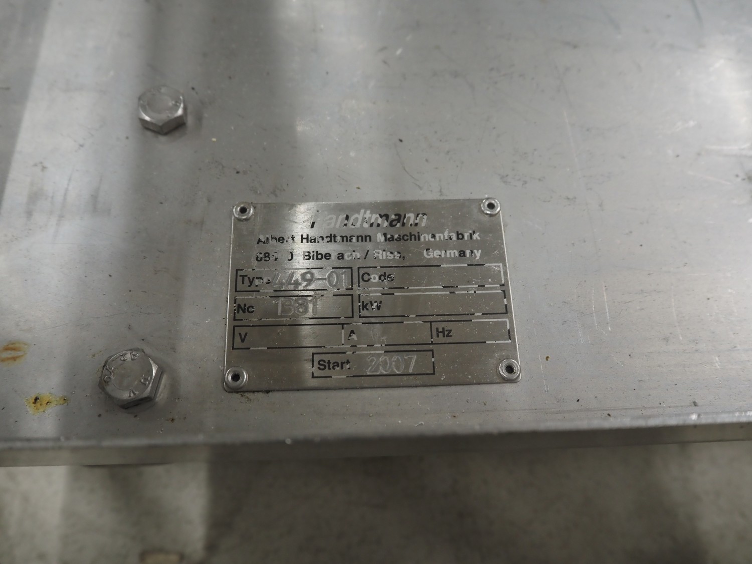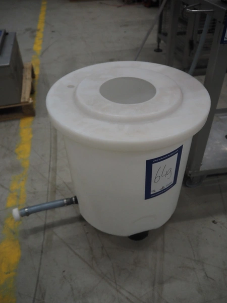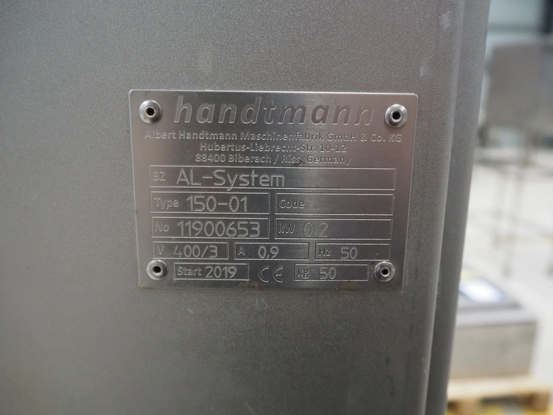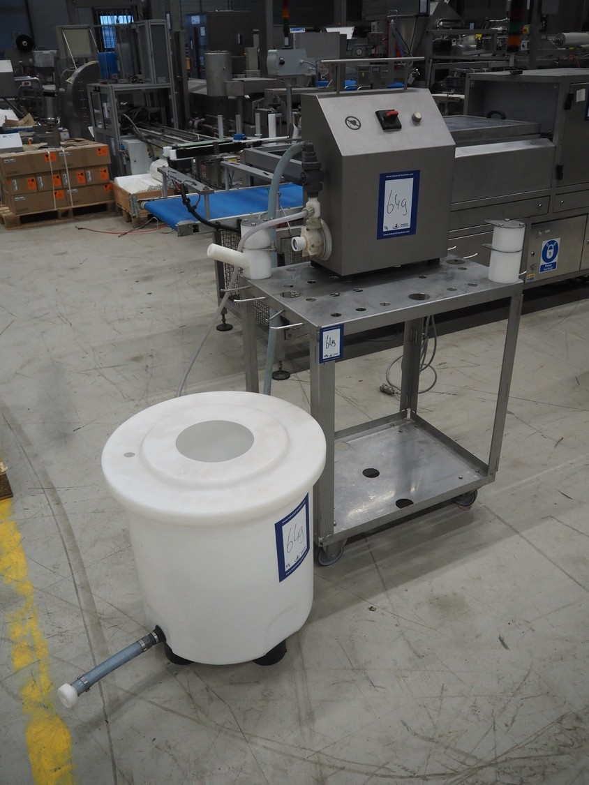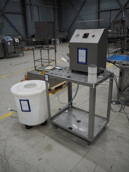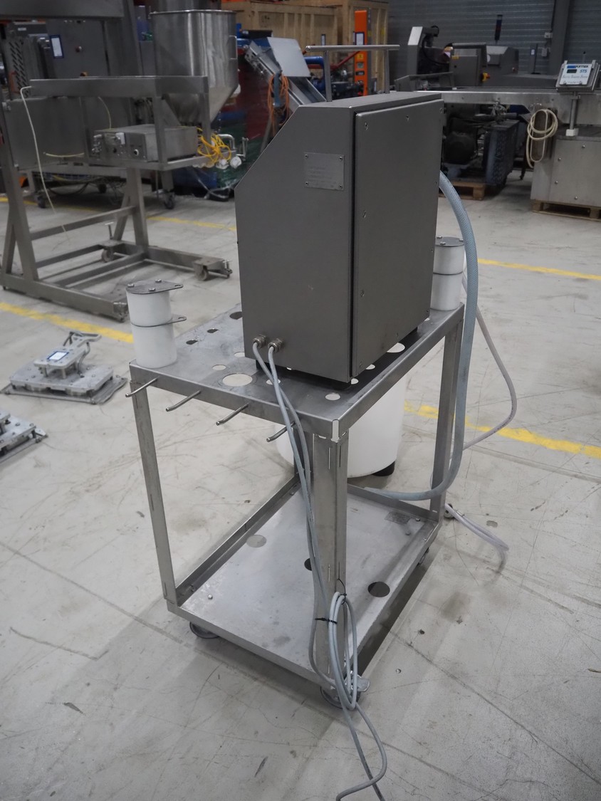 Handtmann coextrusion machine on s/s trolley, type: 150-01, number: 11900653, year of construction: 2019, 400 V, 3 Ph, 50 Hz, 0.9 A, 0.2 kW, dimensions: 950 mm x 700 mm x 1180 mm. With plastic tub, dimensions: Ø 570 mm x 630 mm.