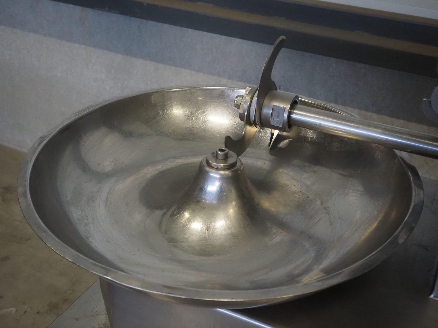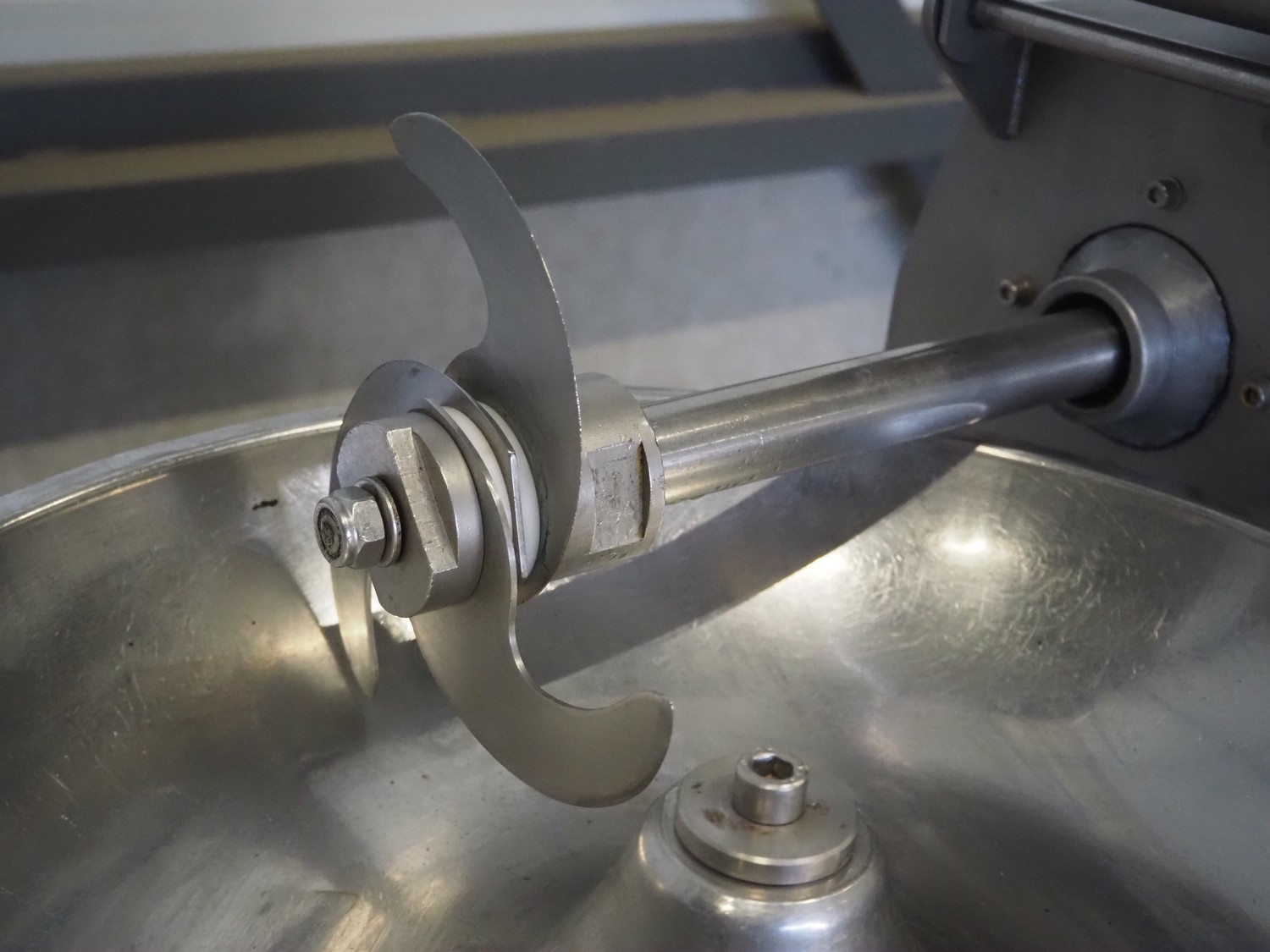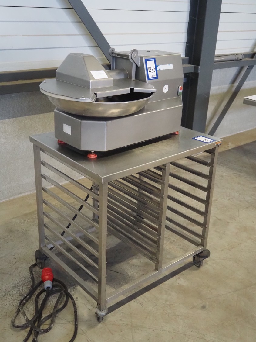 Scharfen cutter on s/s trolley, type: TC11, number: 2143033, year of construction: 2014, 400 V, 3.6/5.1 A, 1400/1800 W, s/s bowl, volume: 11 liter, dimensions cutter: 850 mm x 500 mm x 580 mm, dimensions trolley: 770 mm x 580 mm x 800 mm.