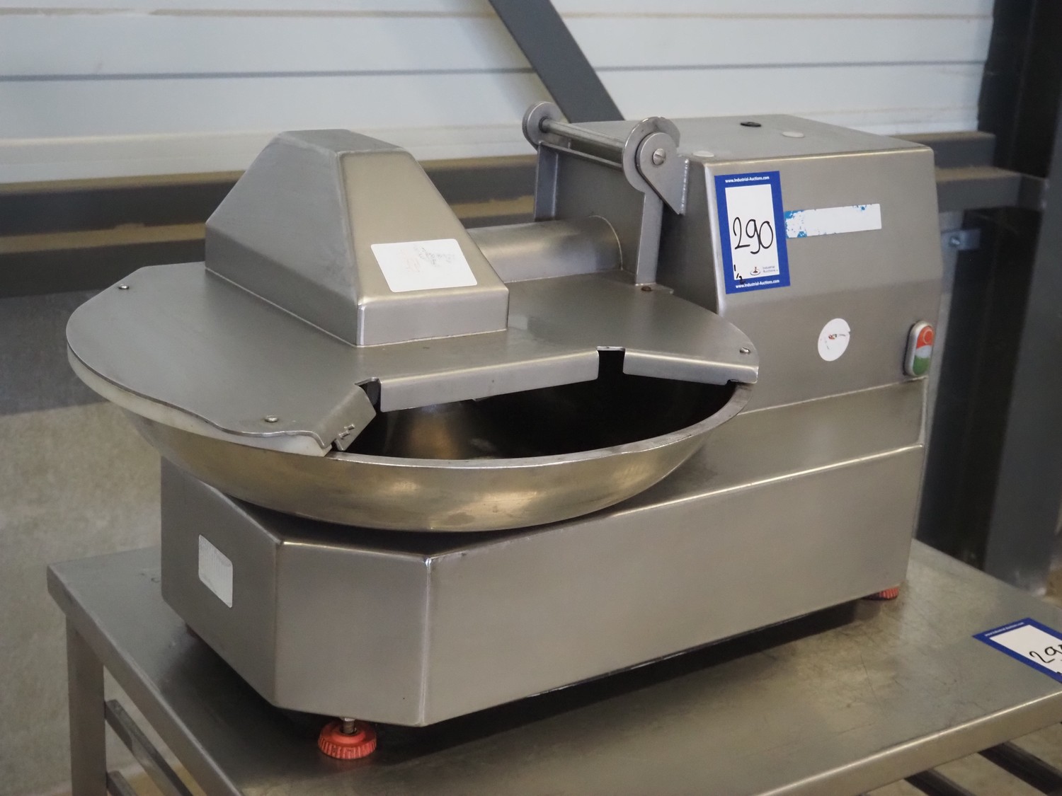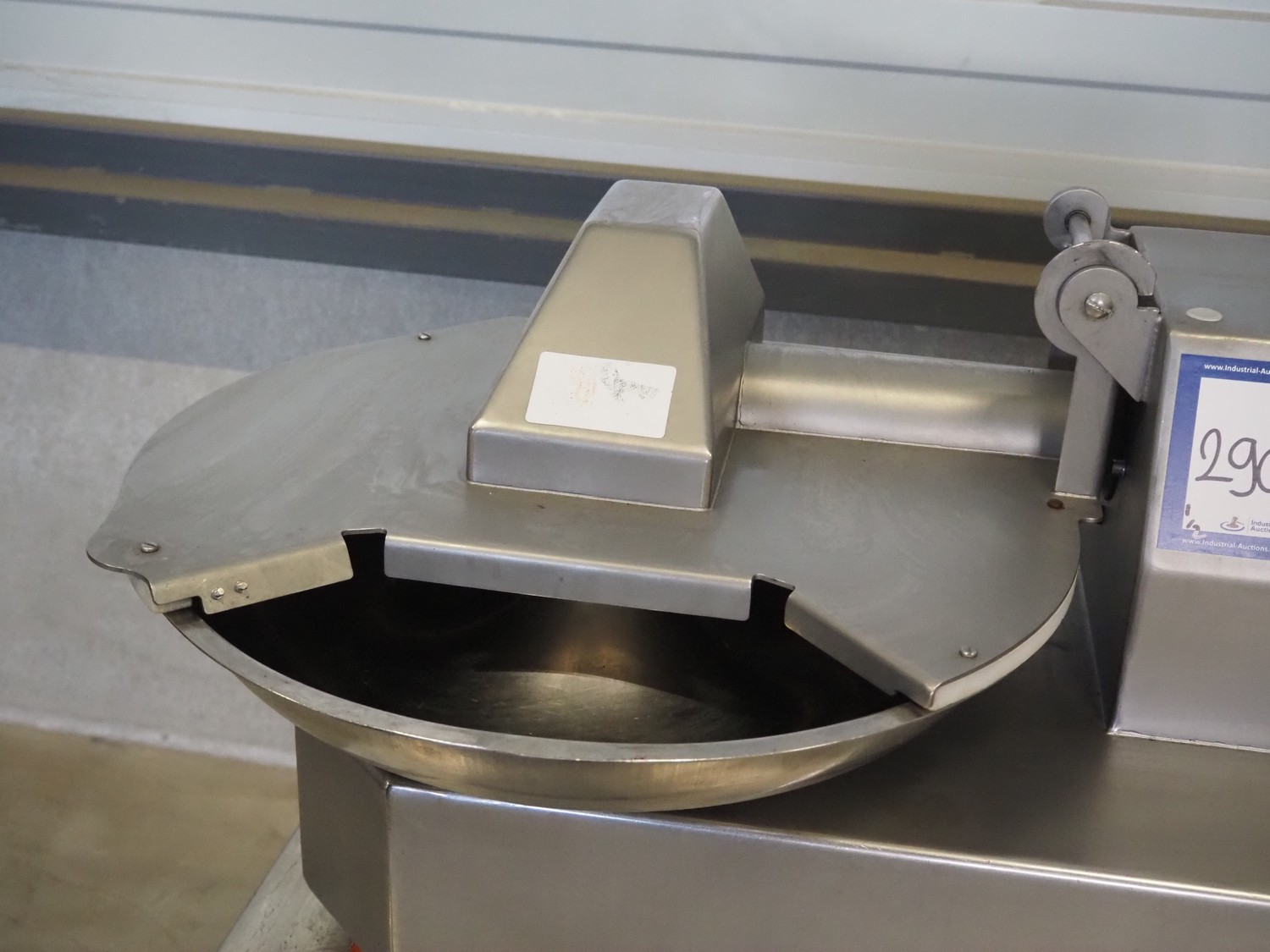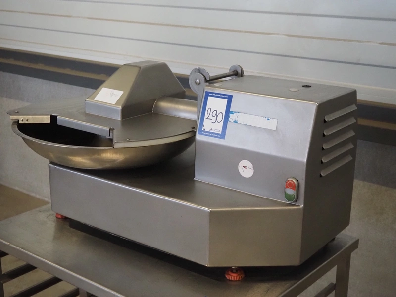 Scharfen cutter on s/s trolley, type: TC11, number: 2143033, year of construction: 2014, 400 V, 3.6/5.1 A, 1400/1800 W, s/s bowl, volume: 11 liter, dimensions cutter: 850 mm x 500 mm x 580 mm, dimensions trolley: 770 mm x 580 mm x 800 mm.
