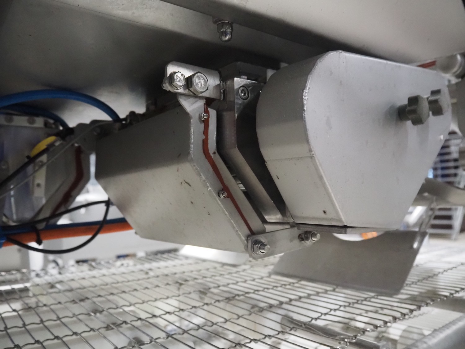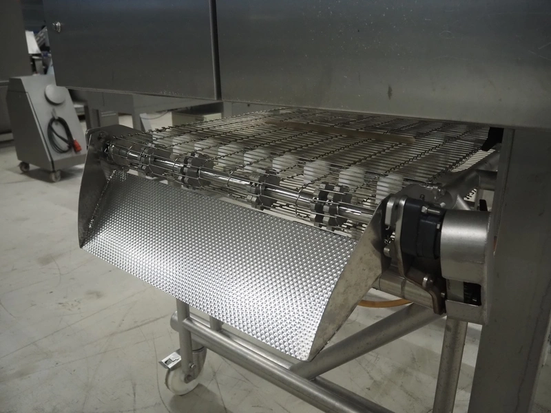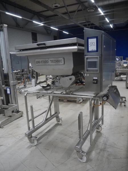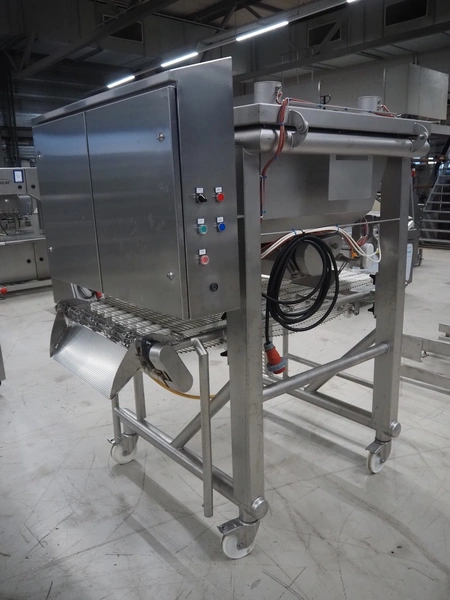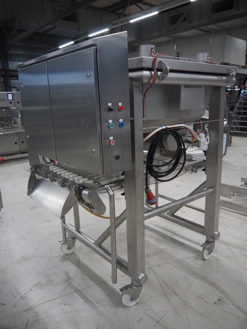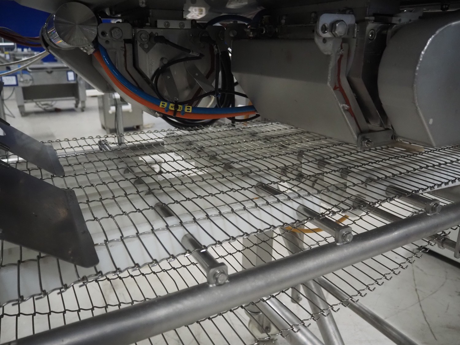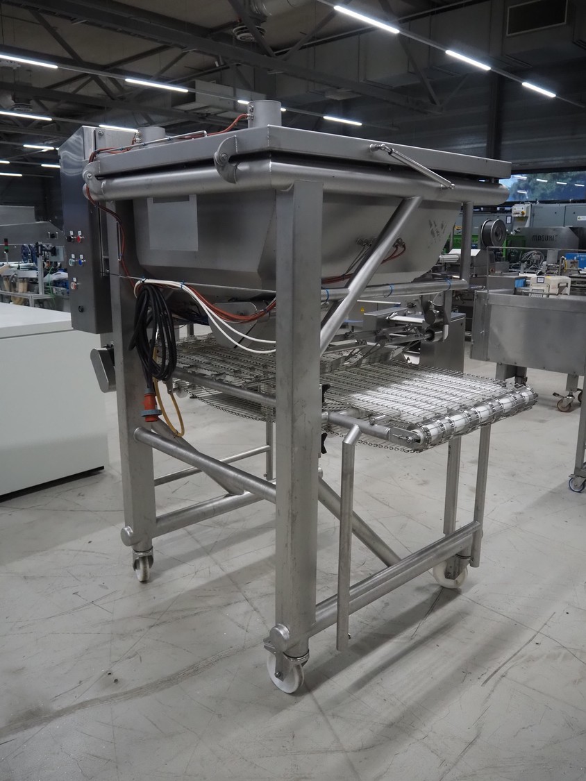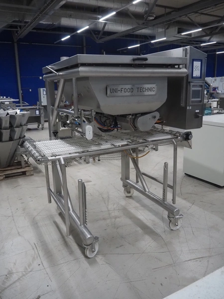 UNI-FOOD TECHNIC mobile depositor, s/s frame, s/s mesh belt, belt width: 710 mm, total dimensions: 1900 mm x 1300 mm x 2040 mm.