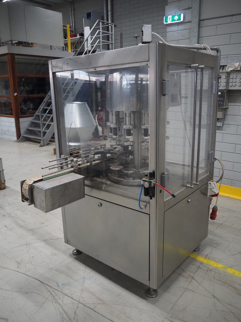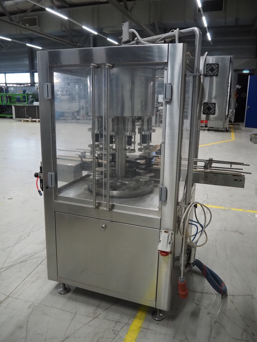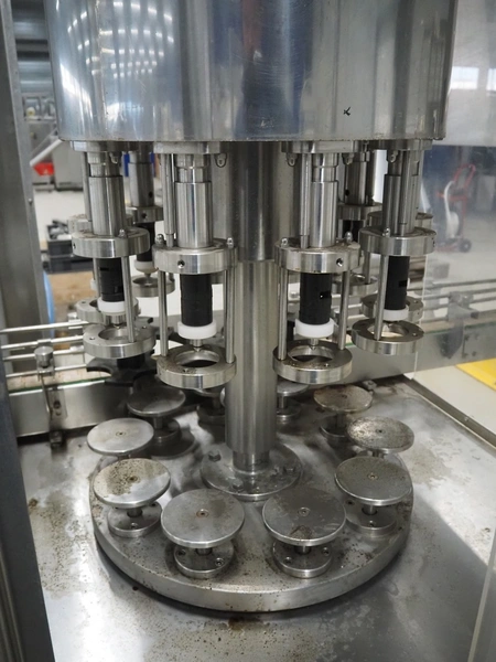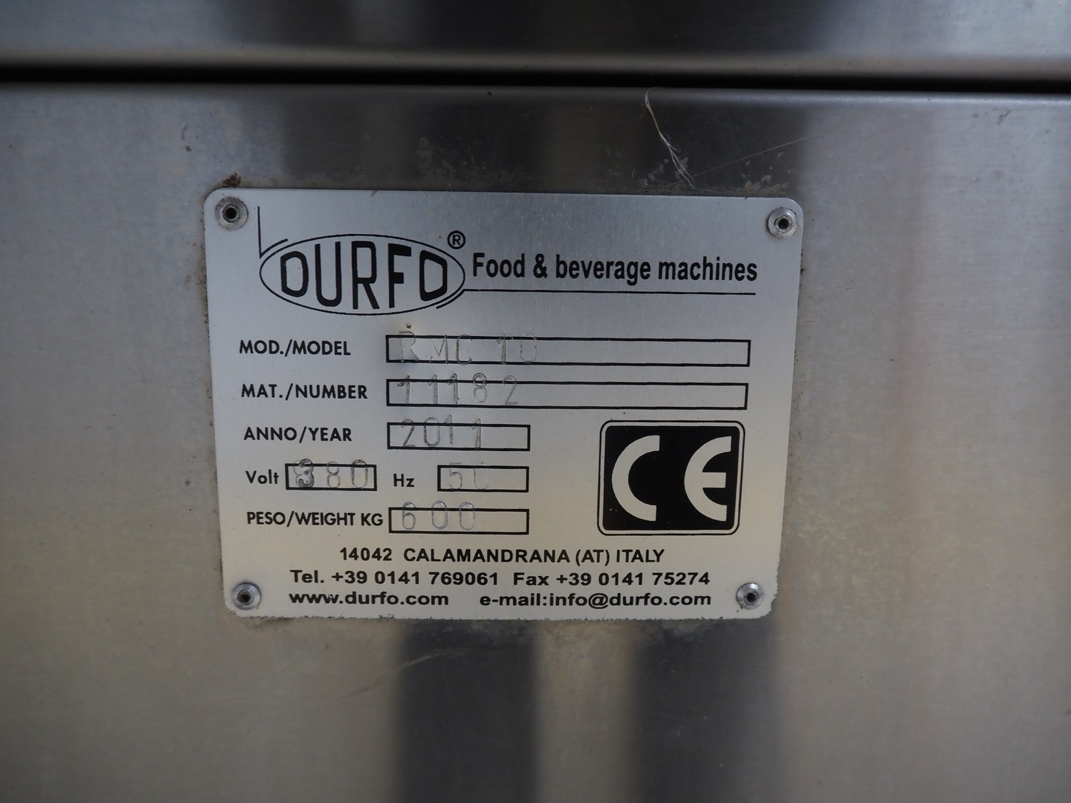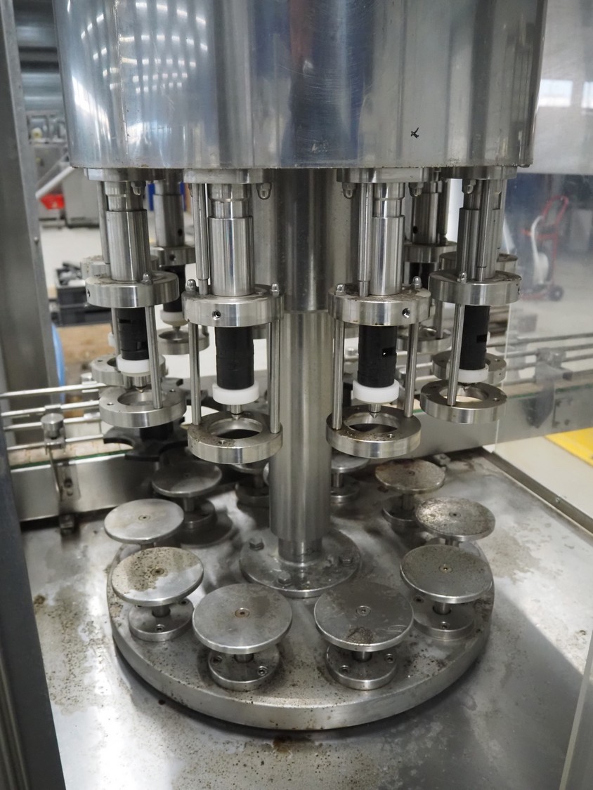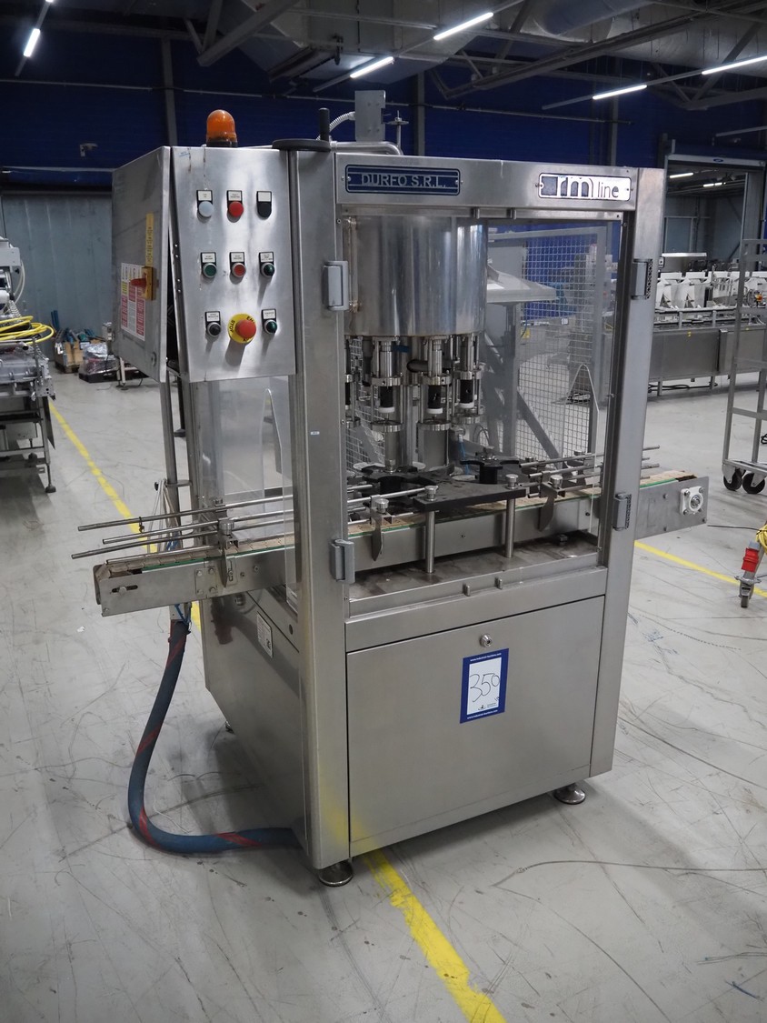 Durfo s.r.l. monoblock filler for liquids with 10 filling heads, model: RMC 10, serial number: 11182, year of construction: 2011, 380 V, 50 Hz, weight: 600 kg, dimensions: 2100 mm x 1200 mm x 2150 mm. Including pallet with parts.