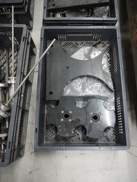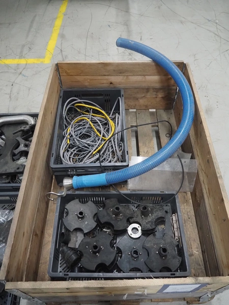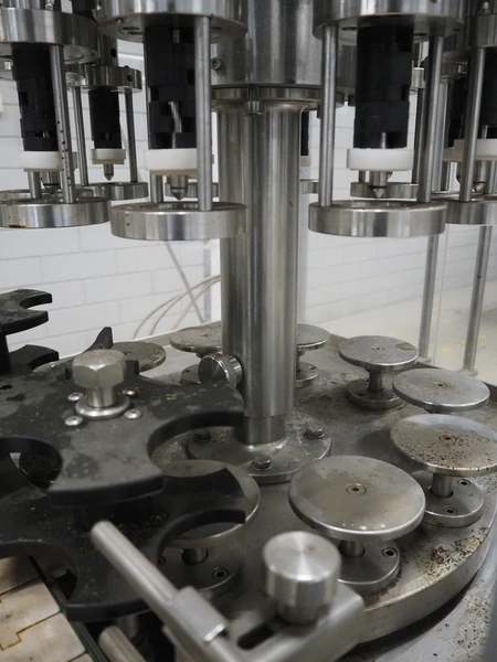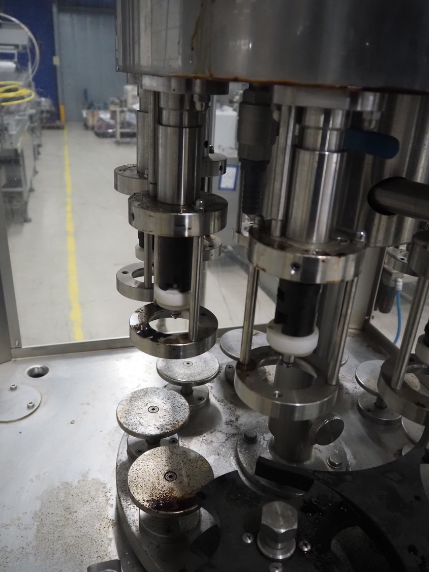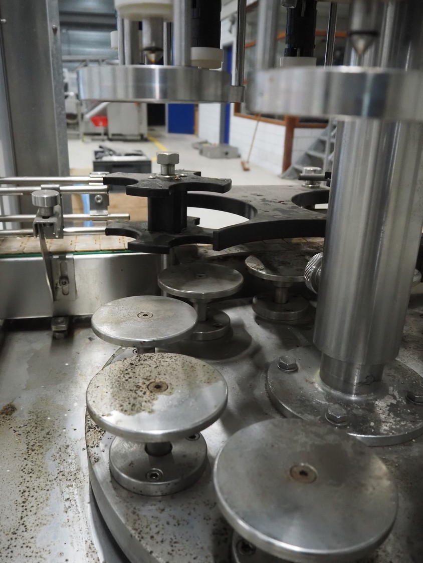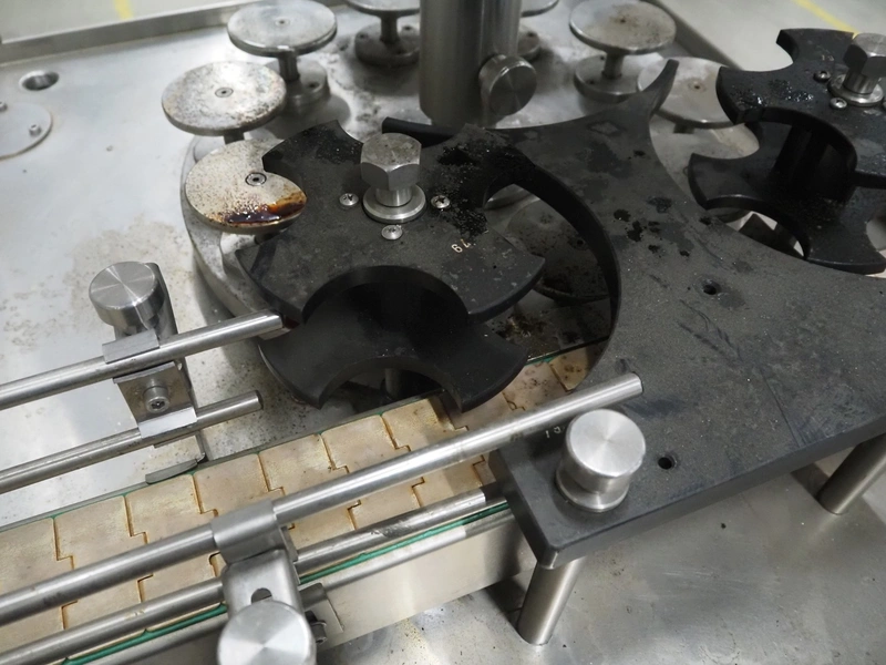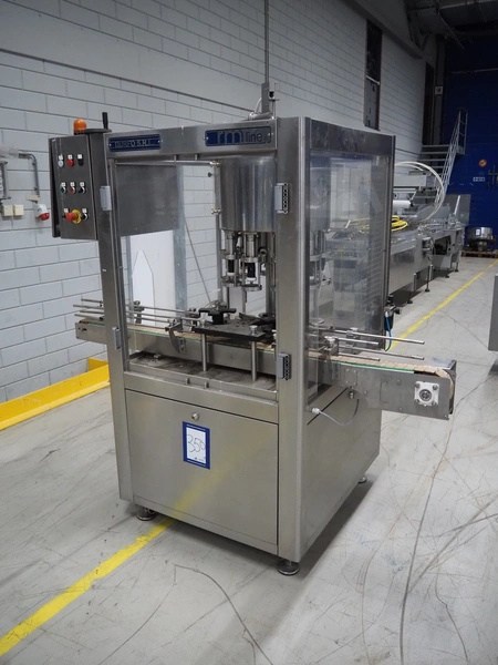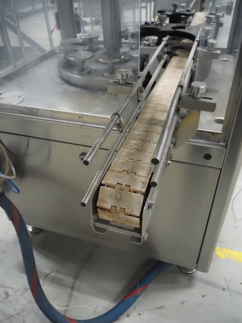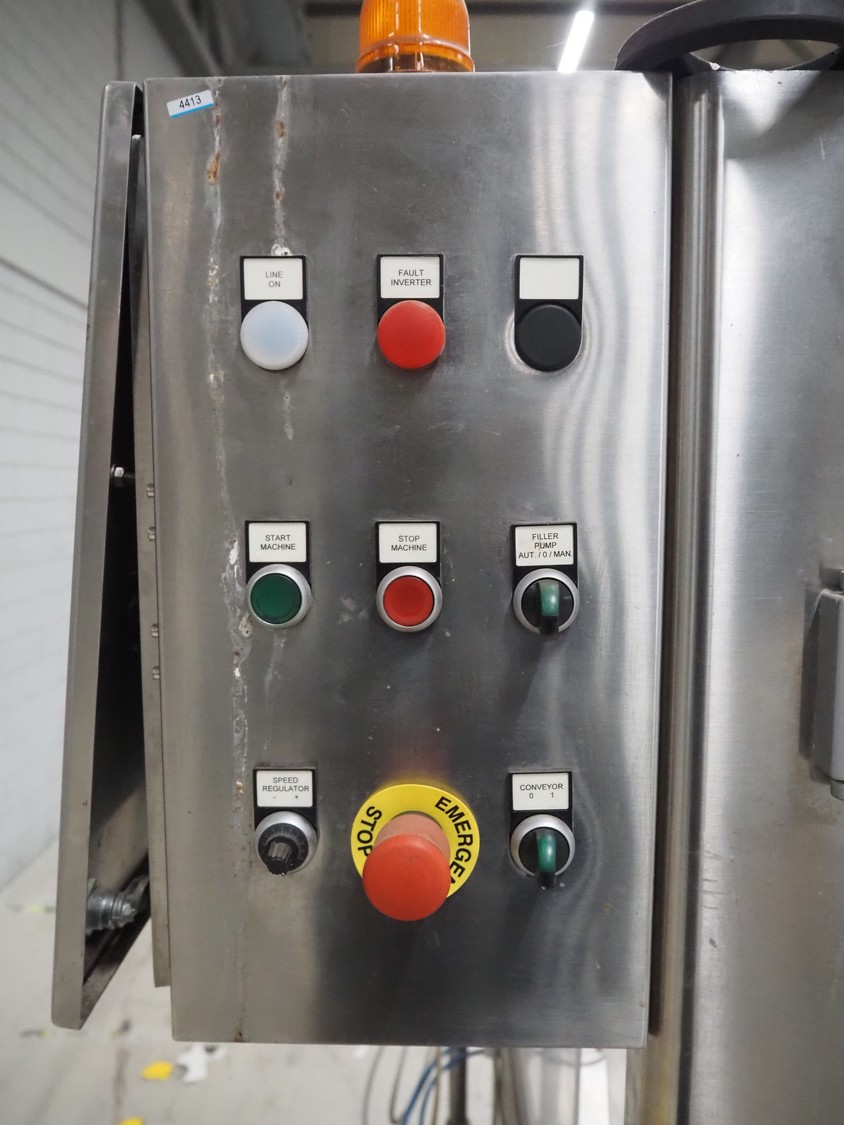 Durfo s.r.l. monoblock filler for liquids with 10 filling heads, model: RMC 10, serial number: 11182, year of construction: 2011, 380 V, 50 Hz, weight: 600 kg, dimensions: 2100 mm x 1200 mm x 2150 mm. Including pallet with parts.