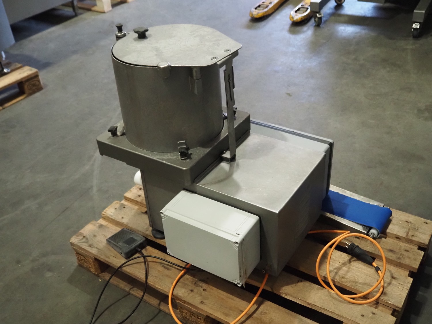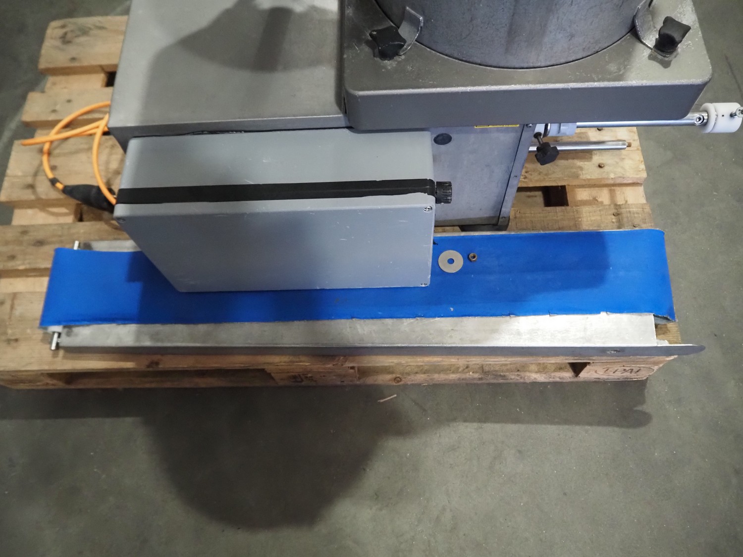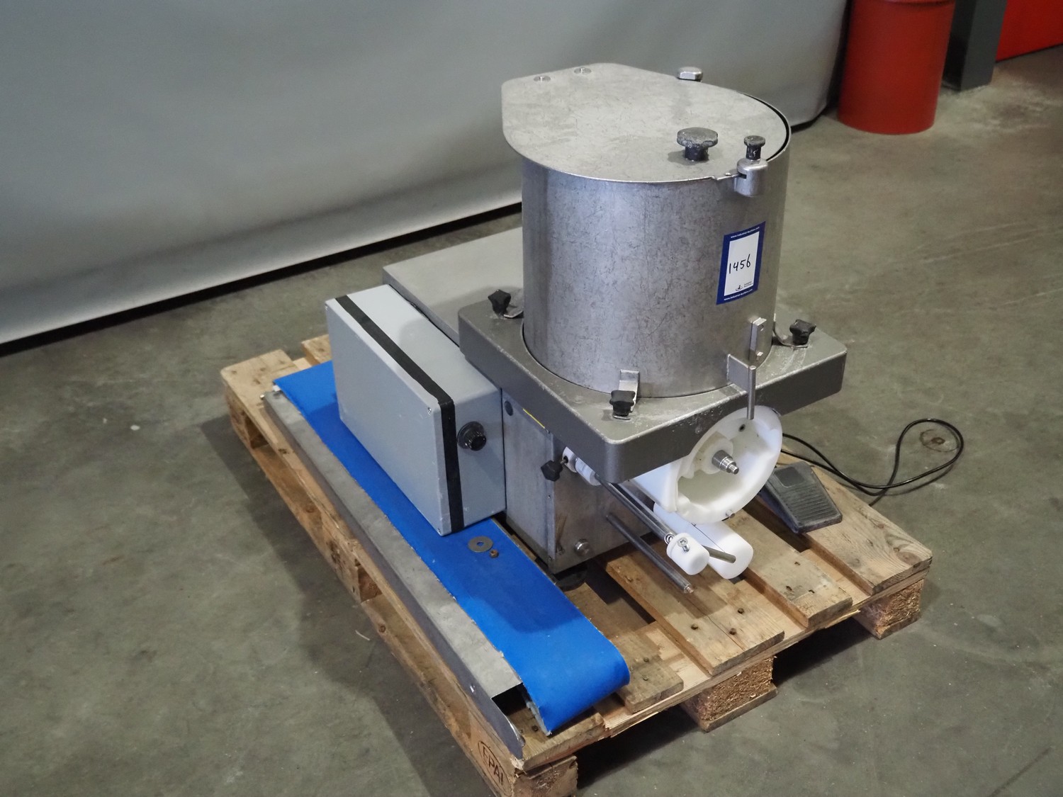 Deighton manufacturing UK Ltd hamburger forming machine, type: R4000, inside dimensions: Ø 355 mm x 325 mm, plastic belt, belt width: 140 mm, total dimensions: 850 mm x 620 mm x 800 mm.