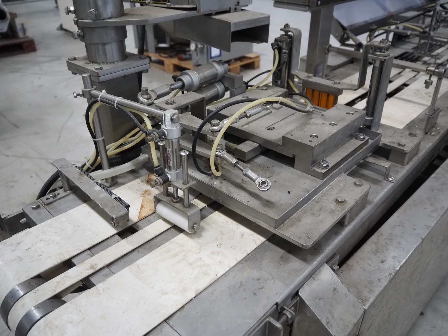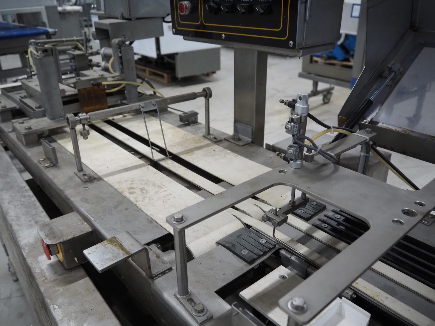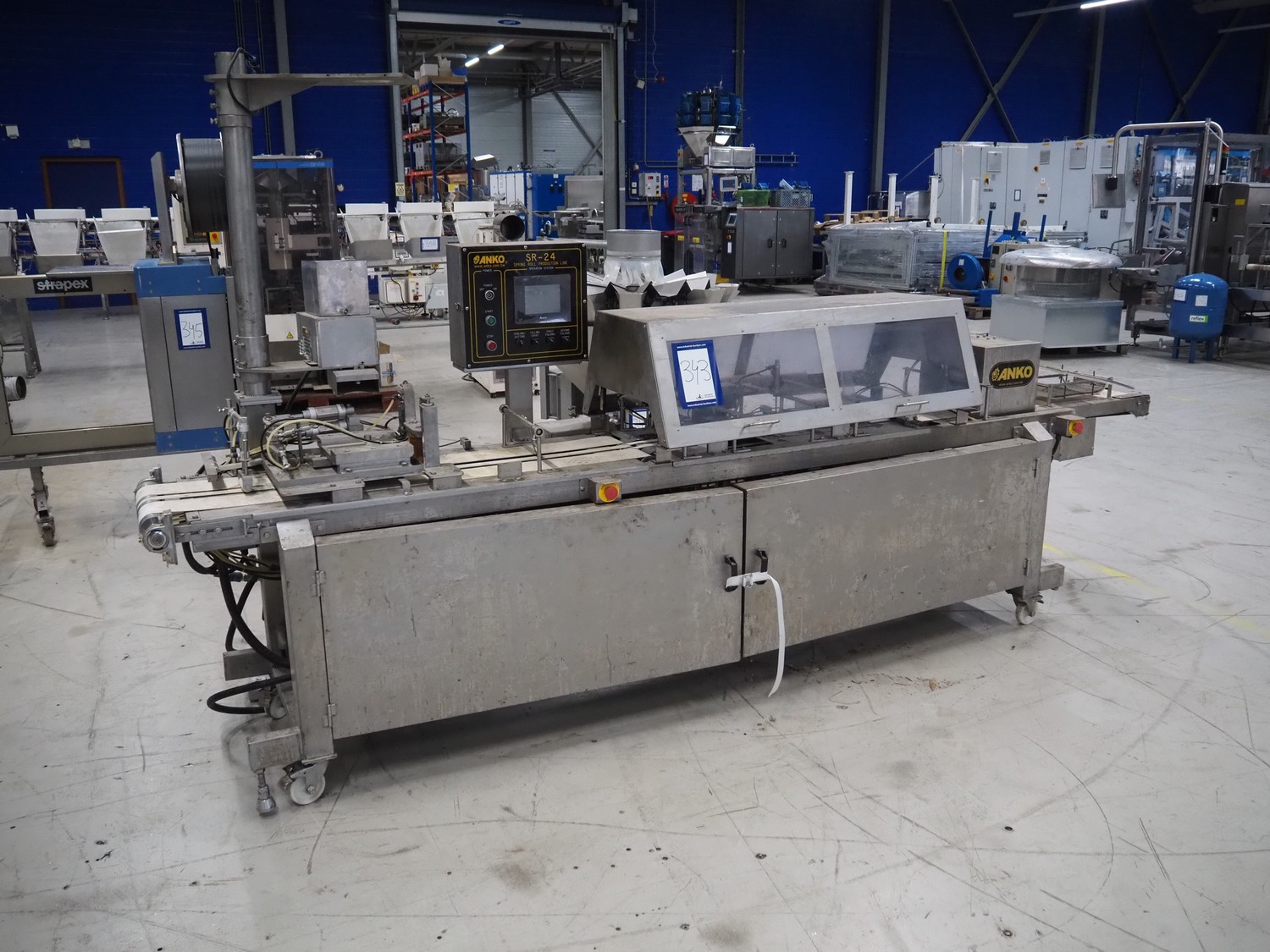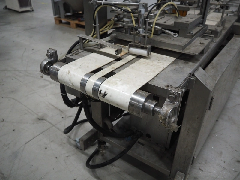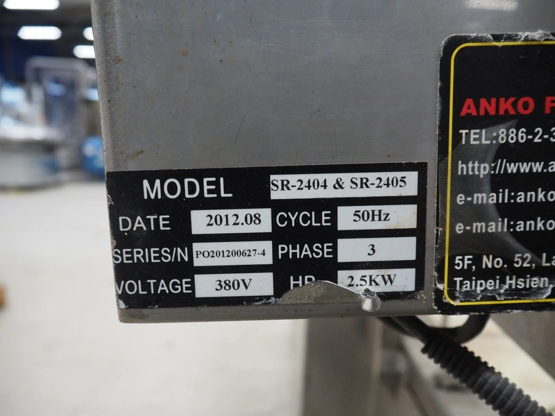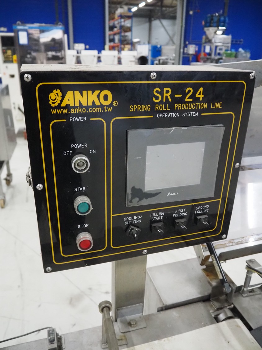 ANKO spring roll filling and folding machine, model: SR-2404 & SR-2405, serial number: PO201200627-4, year of construction: 2012.08, 380 V, 3 Ph, 50 Hz, 2.5 kW, plastic belts, belt width: (2x) 110 mm / 30mm / (2x) 20 mm / 150 mm, total dimensions: 3700 mm x 750 mm x 1930 mm. Incomplete.