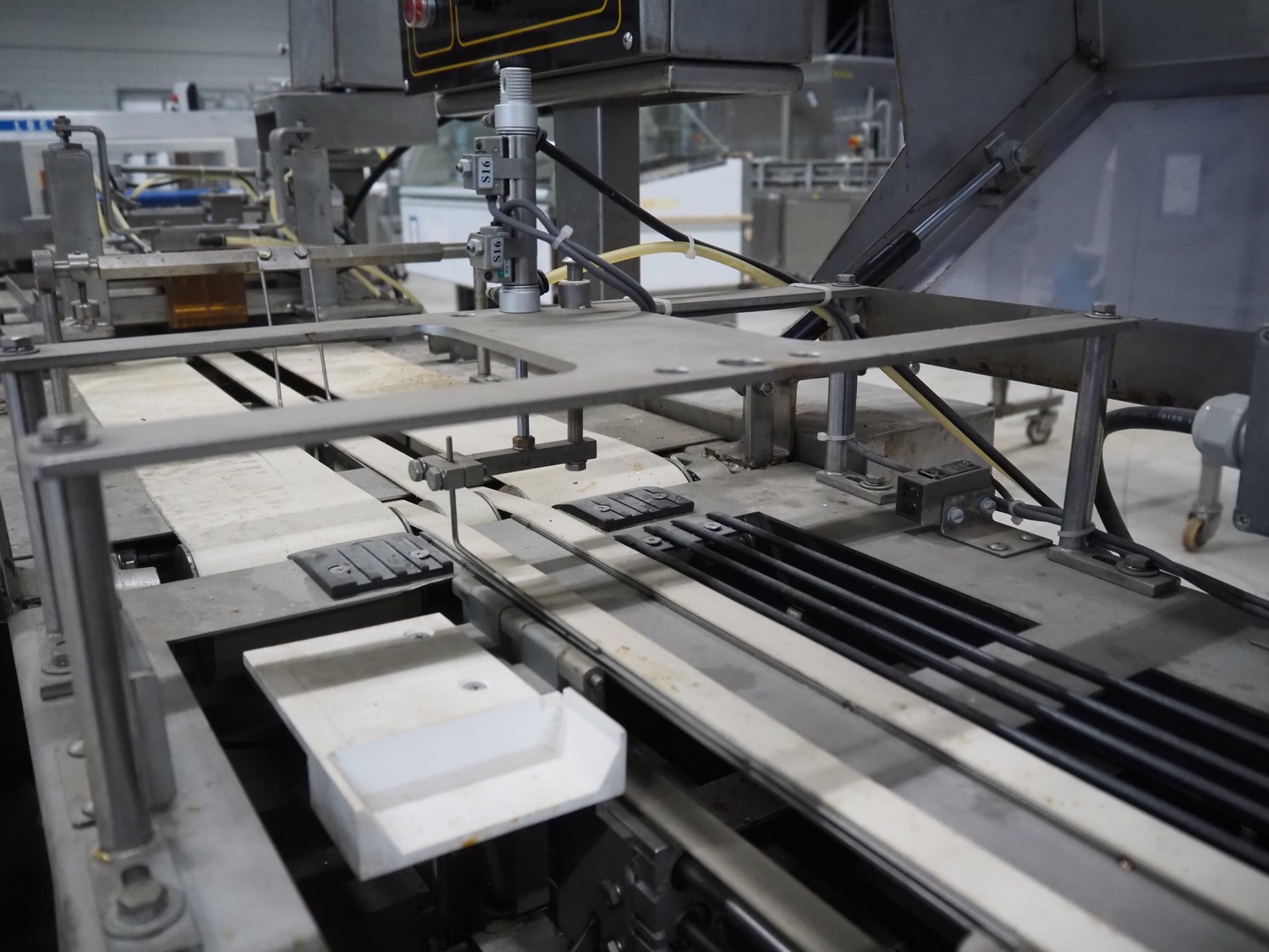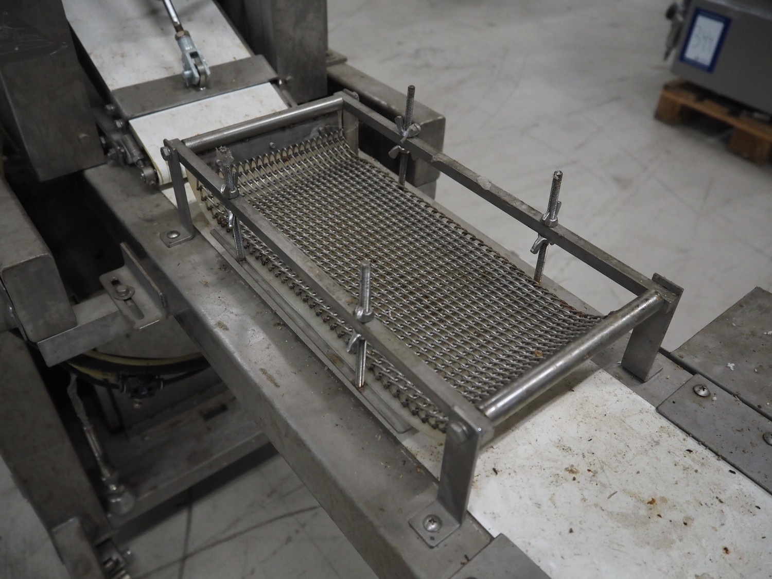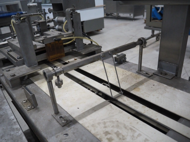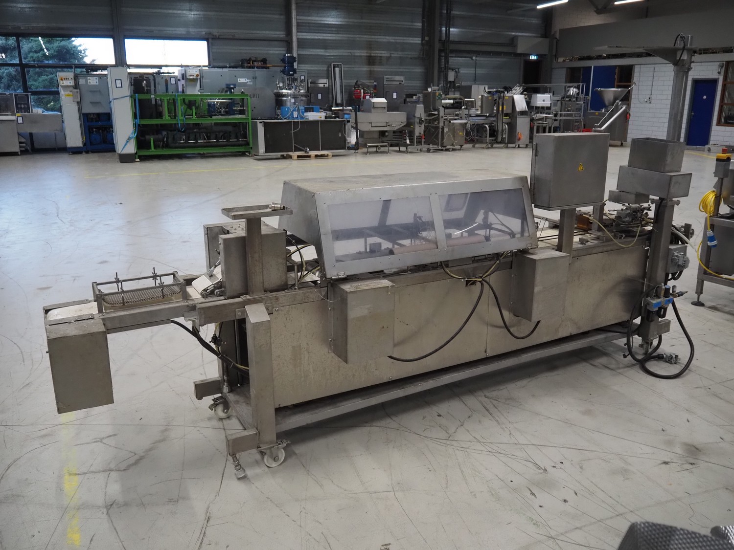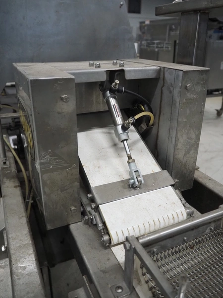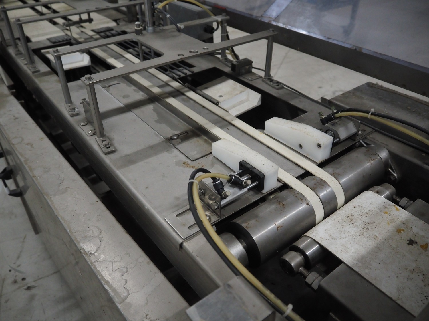 ANKO spring roll filling and folding machine, model: SR-2404 & SR-2405, serial number: PO201200627-4, year of construction: 2012.08, 380 V, 3 Ph, 50 Hz, 2.5 kW, plastic belts, belt width: (2x) 110 mm / 30mm / (2x) 20 mm / 150 mm, total dimensions: 3700 mm x 750 mm x 1930 mm. Incomplete.