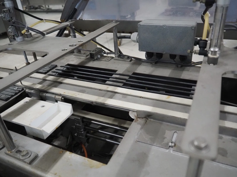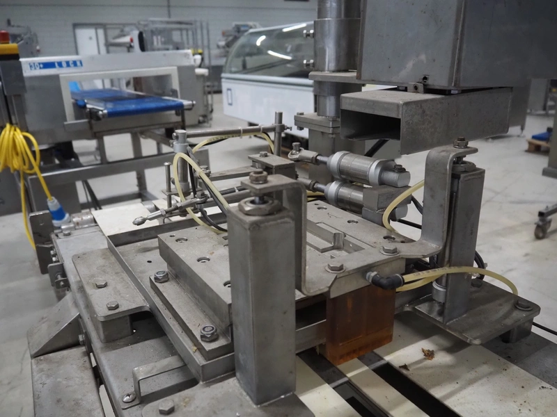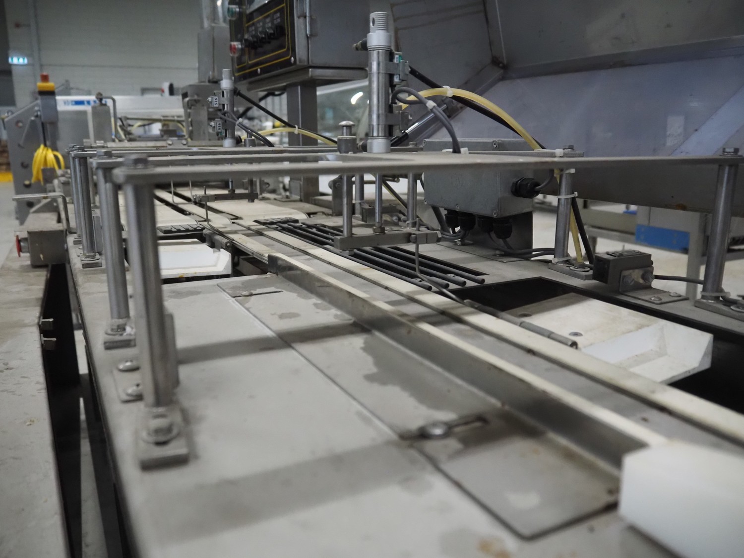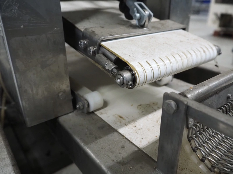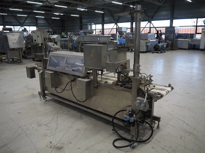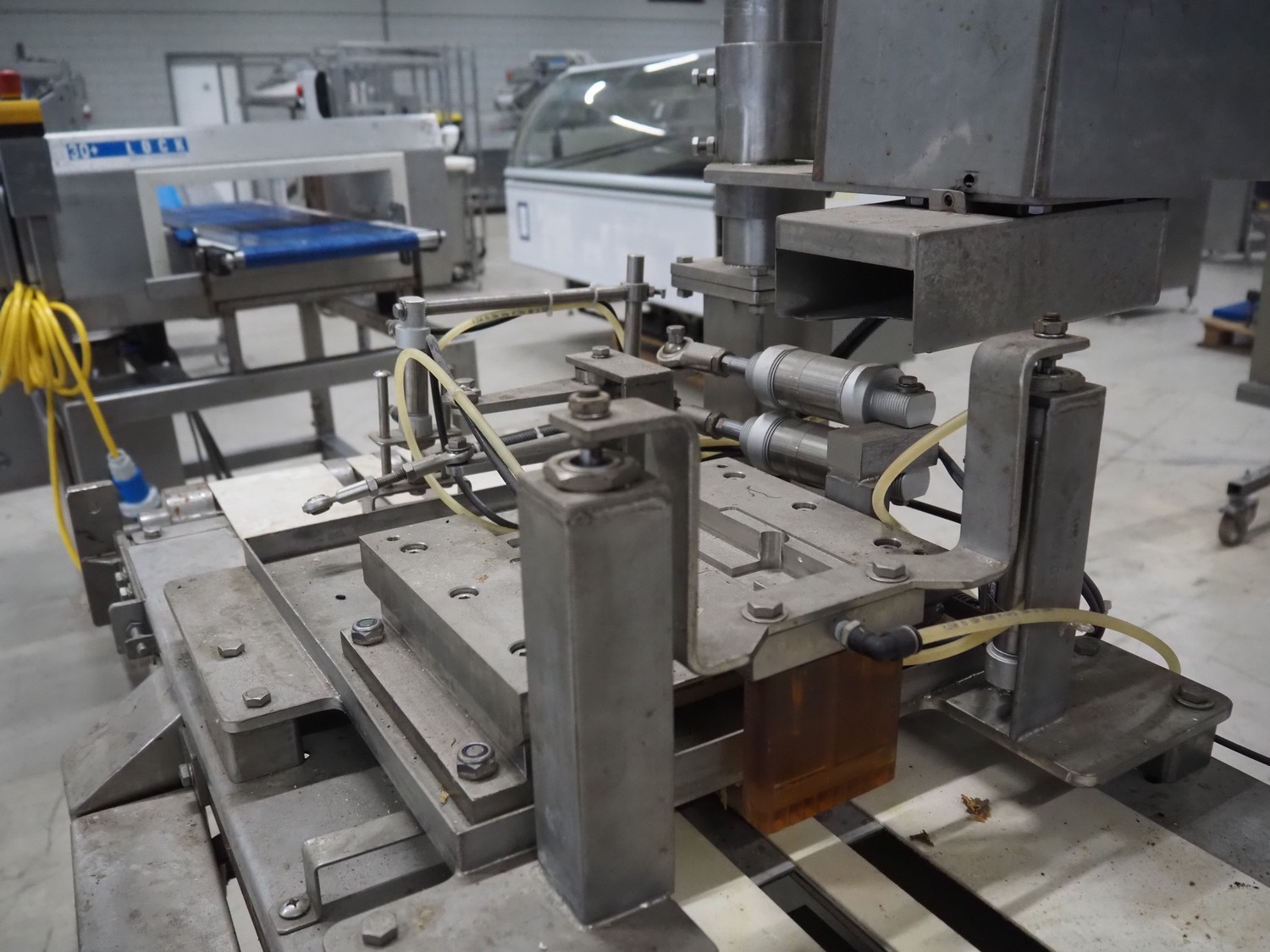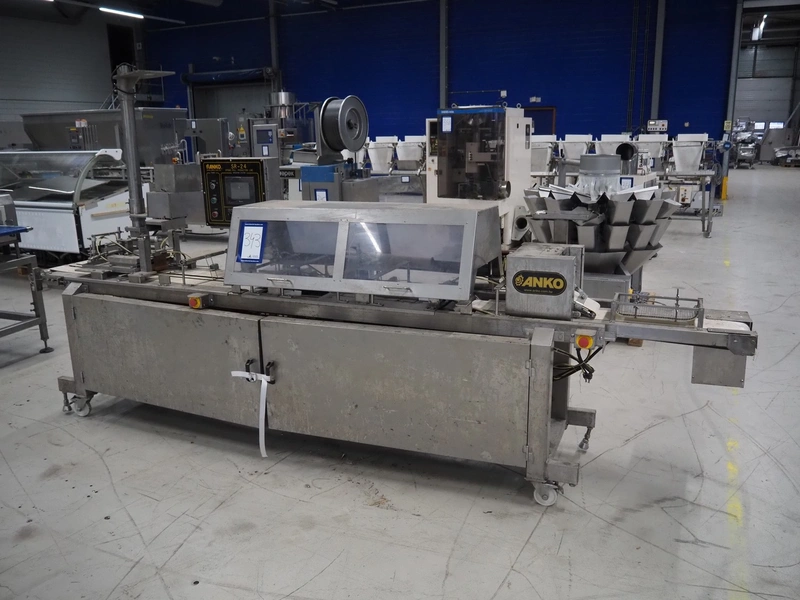ANKO spring roll filling and folding machine, model: SR-2404 & SR-2405, serial number: PO201200627-4, year of construction: 2012.08, 380 V, 3 Ph, 50 Hz, 2.5 kW, plastic belts, belt width: (2x) 110 mm / 30mm / (2x) 20 mm / 150 mm, total dimensions: 3700 mm x 750 mm x 1930 mm. Incomplete.
