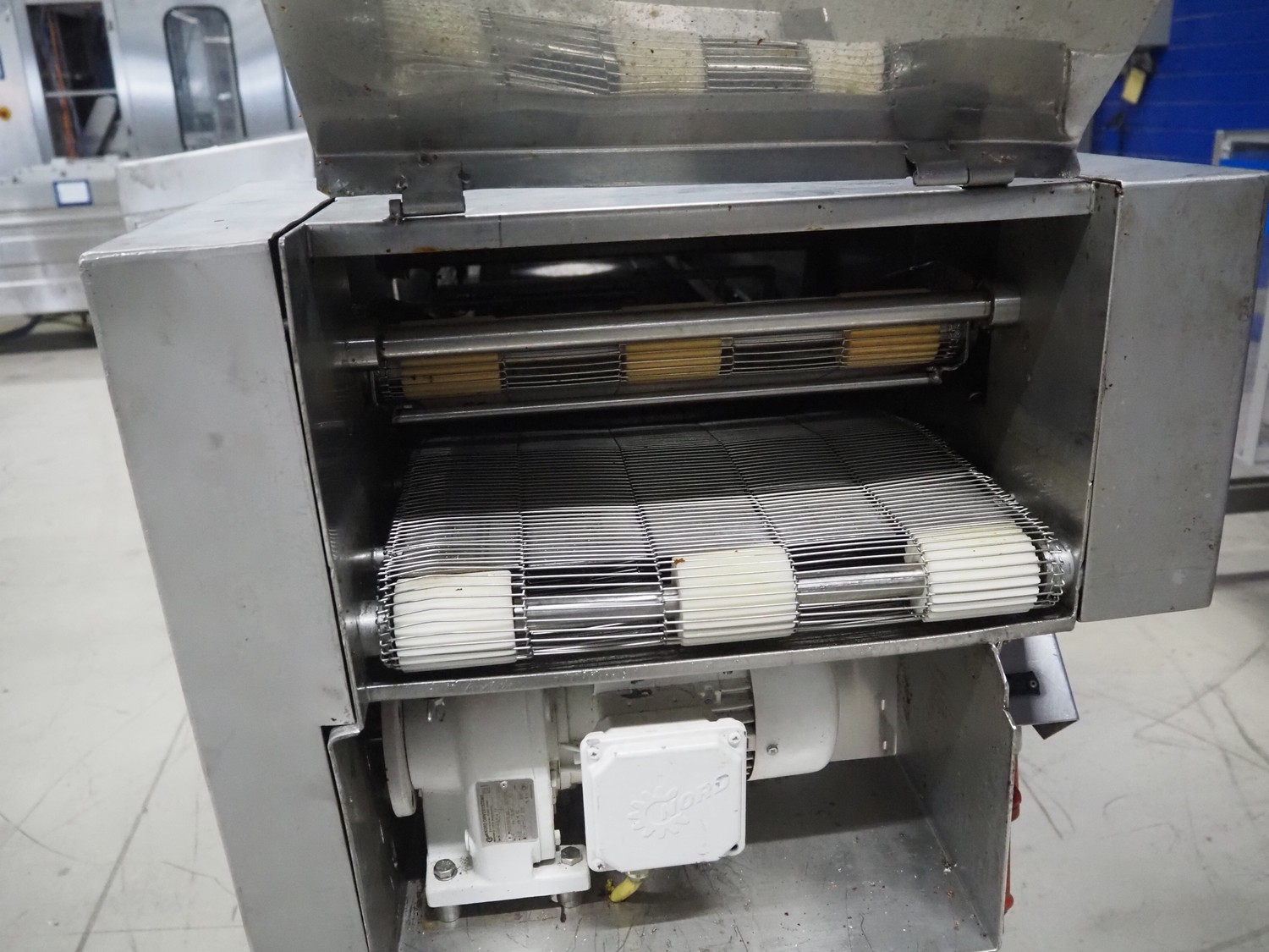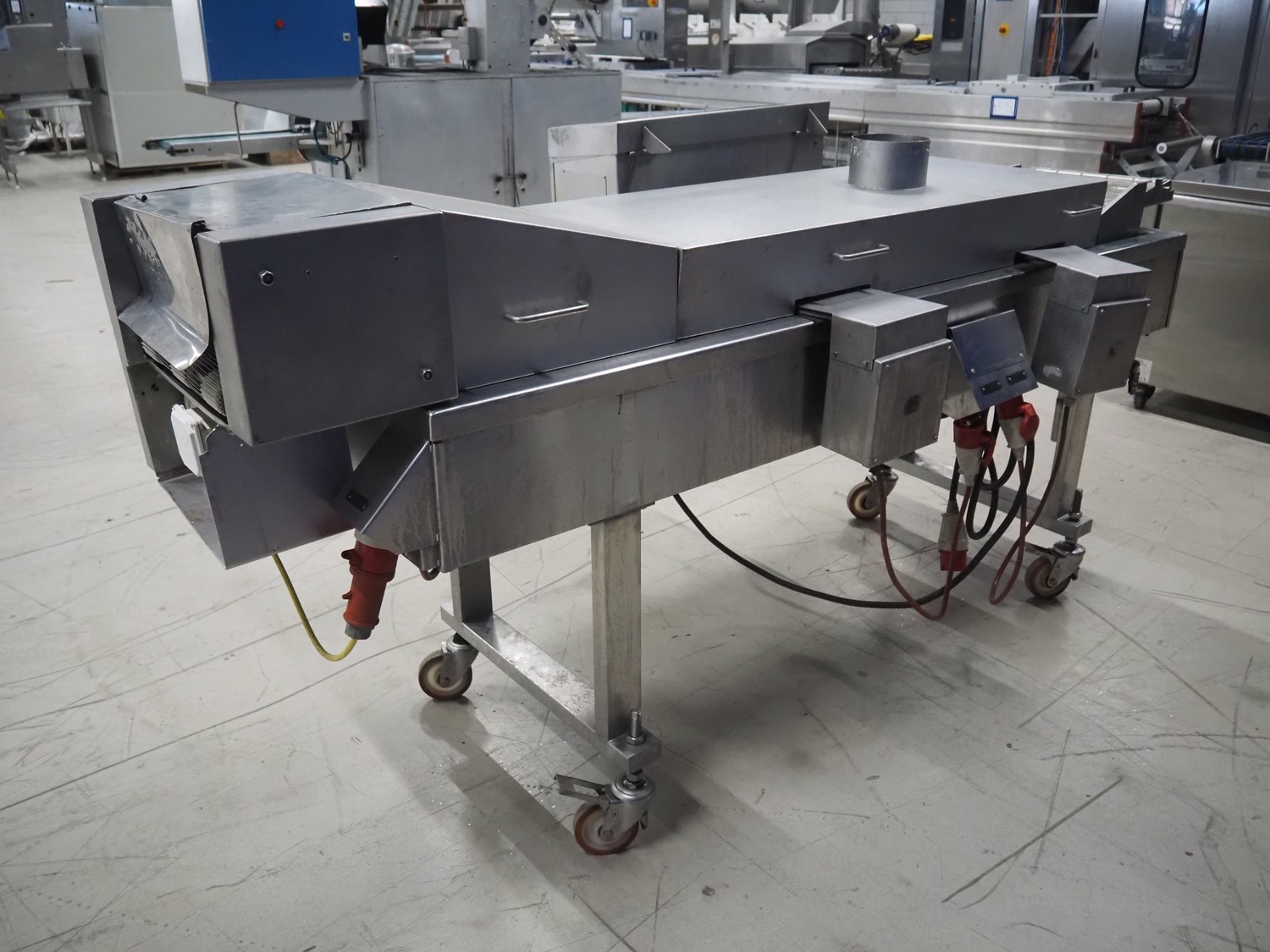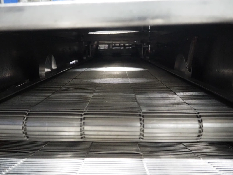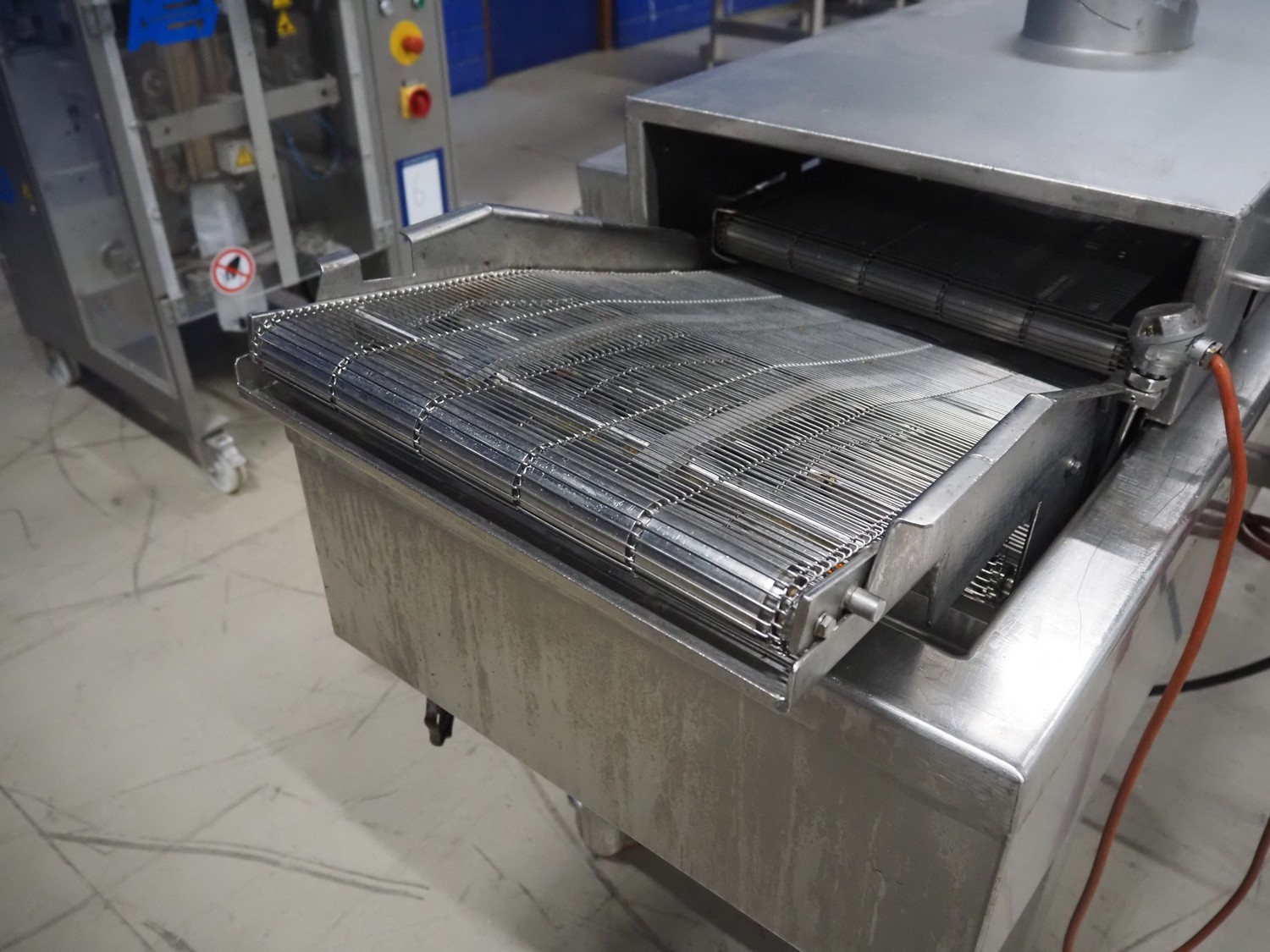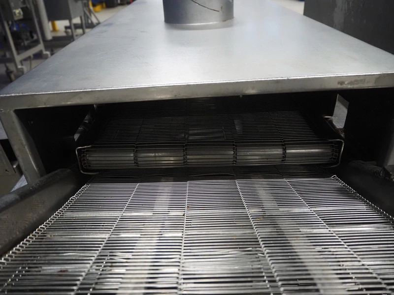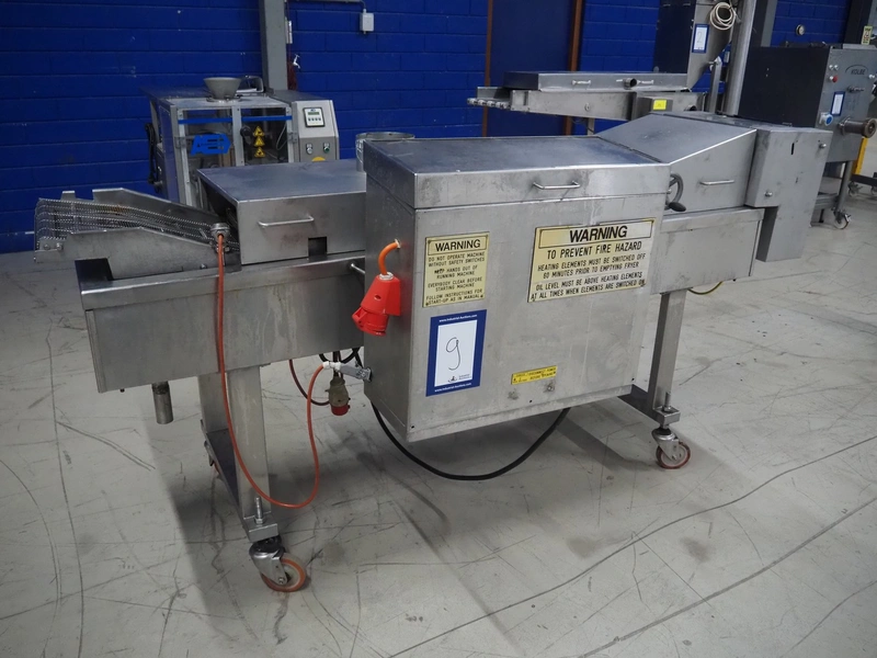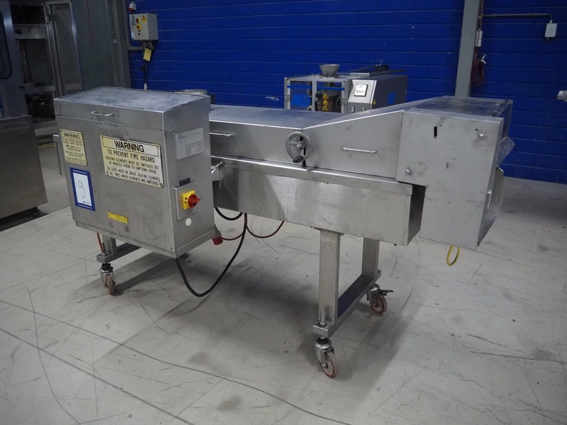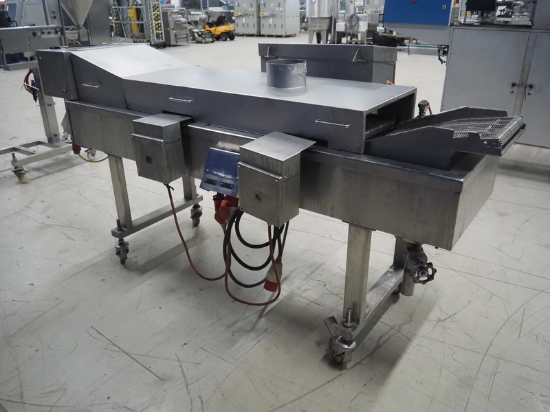 Koppens mobile frying belt, type: BR1200/400, number: 609, 415 V, 3 Ph, 50 Hz, 28 A, 18 kW, weight: 750 kg, s/s mesh belt, belt width: 400 mm, total dimensions: 2600 mm x 1200 mm x 1270 mm.