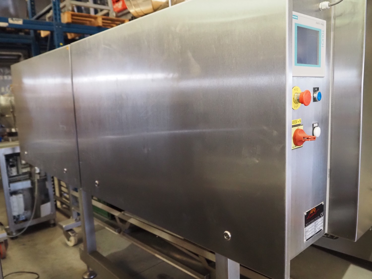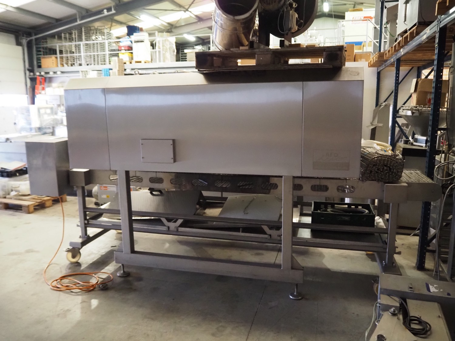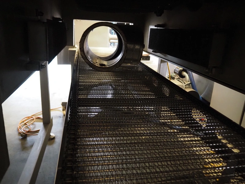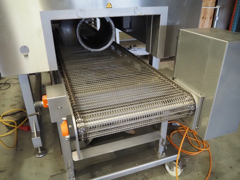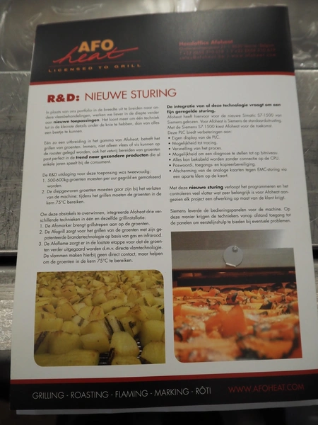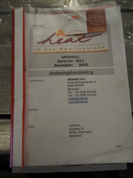 Afoheat NV infrared grill, type: AFOGRILL, serial number: J 008, year of construction: 2010, 400 V, 3 Ph, 4.2 kW, weight: 1200 kg, s/s mesh belt, belt width: 630 mm, total dimensions: 3180 mm x 1650 mm x 1900 mm.