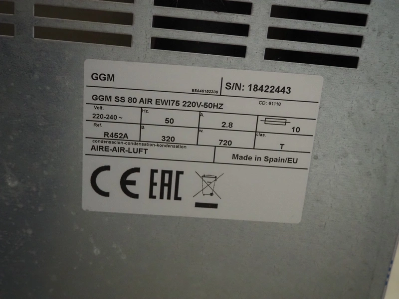 GGM ice bunker, type: SS 80 AIR EWI75, serial number: 18422443, 220/240 V, 3 Ph, 50 Hz, 2.8 A, 720 W, inside dimensions: 430 mm x 580 mm x 250 mm, total dimensions: 650 mm x 450 mm x 980 mm.