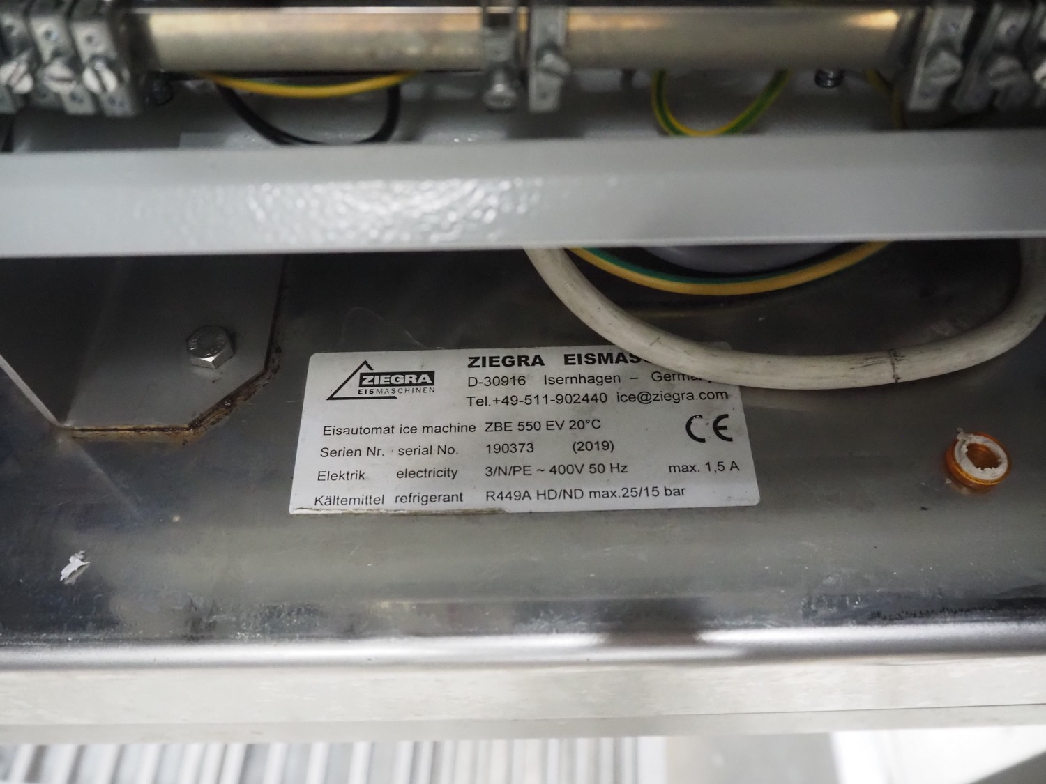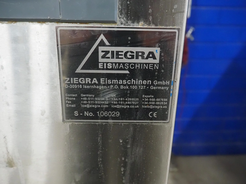 Ziegra Eismaschinen ice machine with bunker, serial number bunker: 106029, model ice machine: ZBE 550 EV 20°C, serial number: 190373, year of construction: 2019, 400 V, 3 Ph, 50 Hz, 1.5 A, refrigerant: R449A, dimensions bunker: 830 mm x 1000 mm x 2150 mm, dimensions ice machine: 800 mm x 660 mm x 1520 mm.