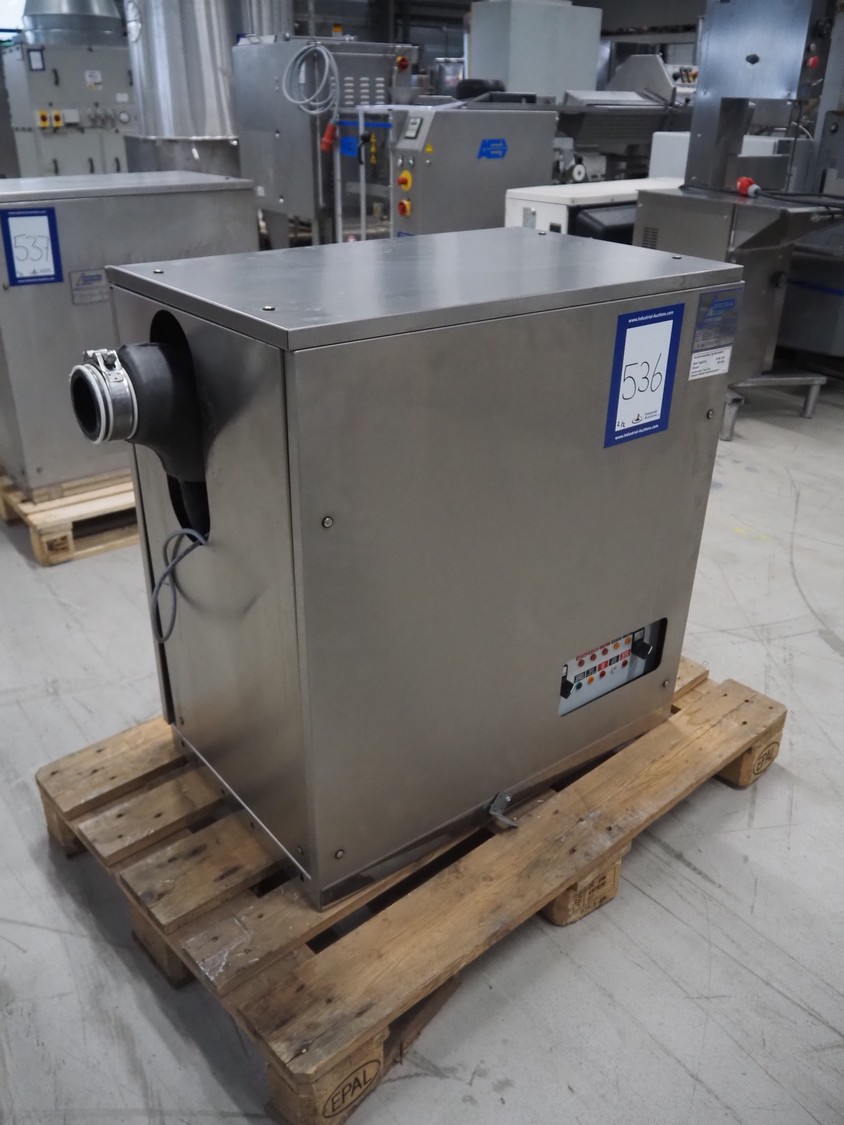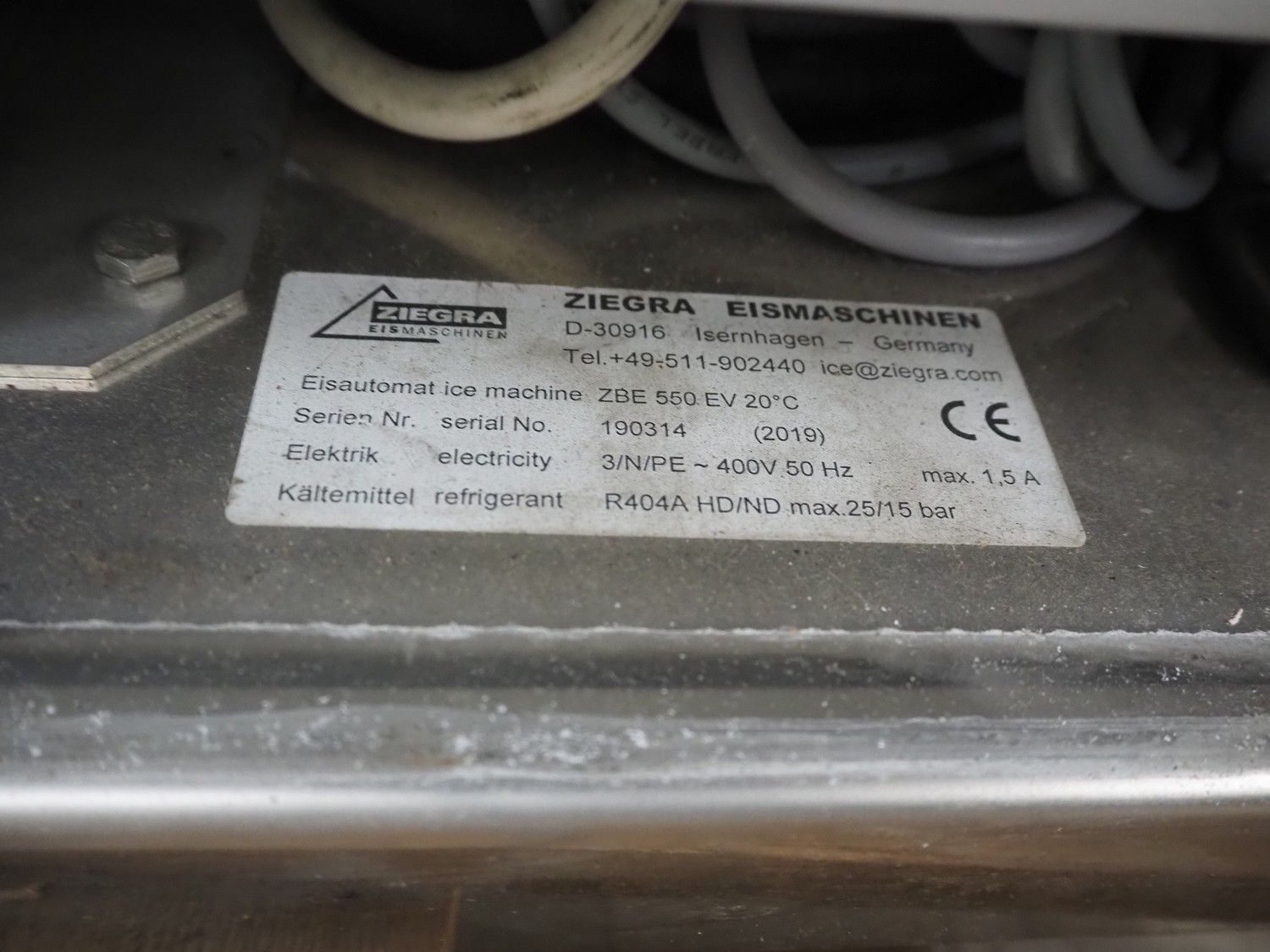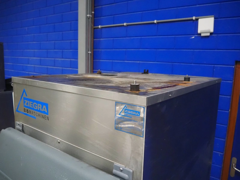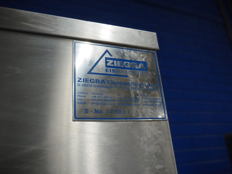 Ziegra Eismaschinen ice machine with bunker, serial number bunker: 174551, model ice machine: ZBE 550 EV 20°C, serial number: 190314, year of construction: 2019, 400 V, 3 Ph, 50 Hz, 1.5 A, refrigerant: R404A, dimensions bunker: 850 mm x 1200 mm x 1900 mm, dimensions ice machine: 950 mm x 500 mm x 850 mm. Incomplete.