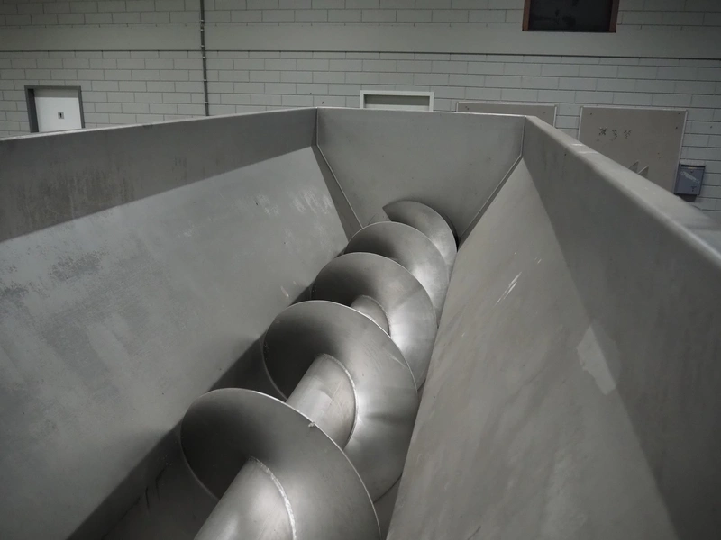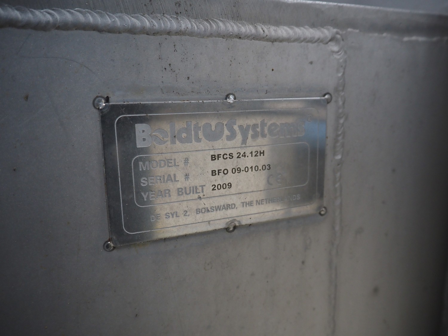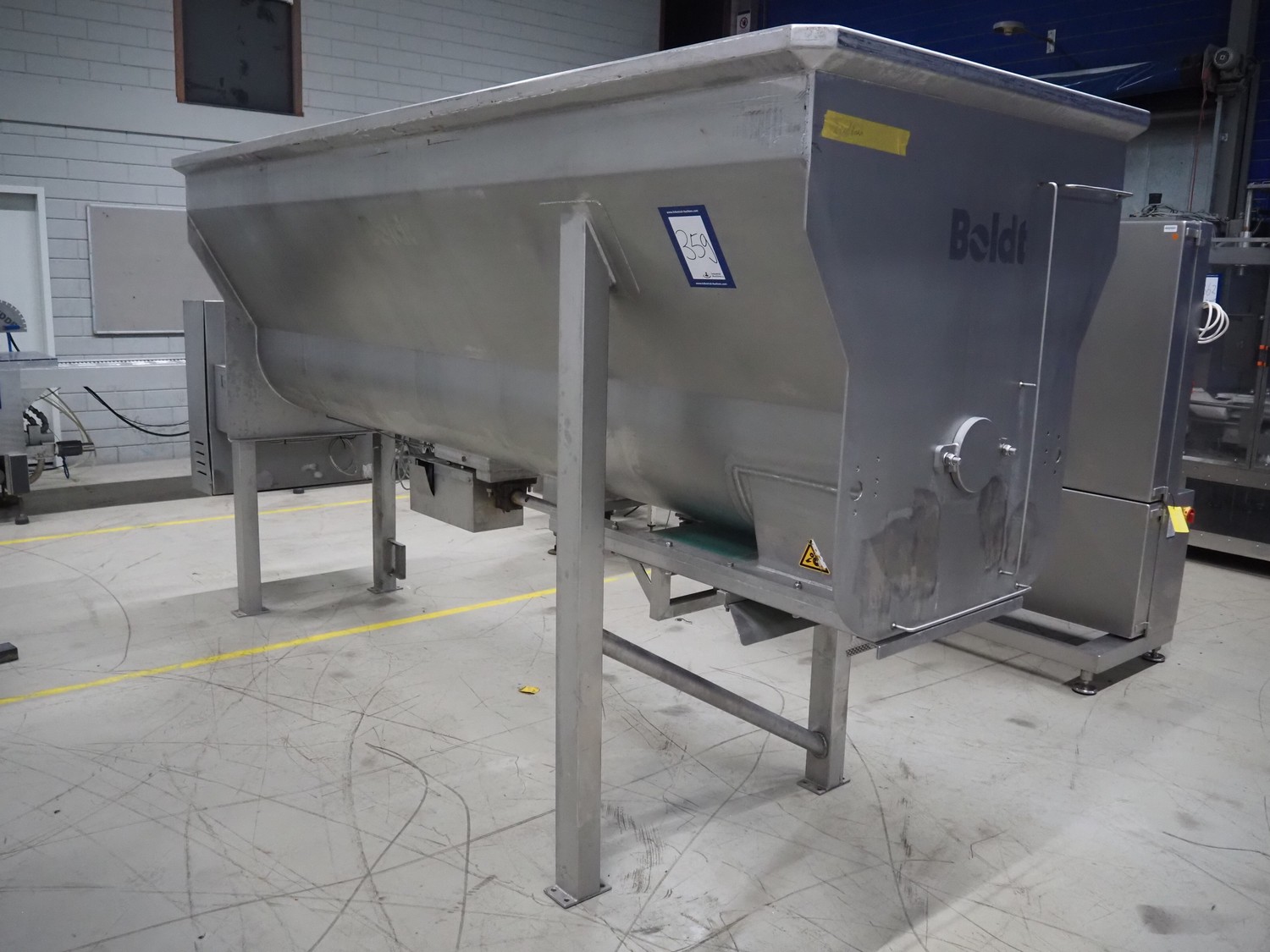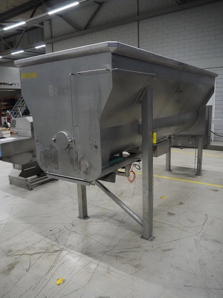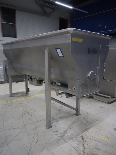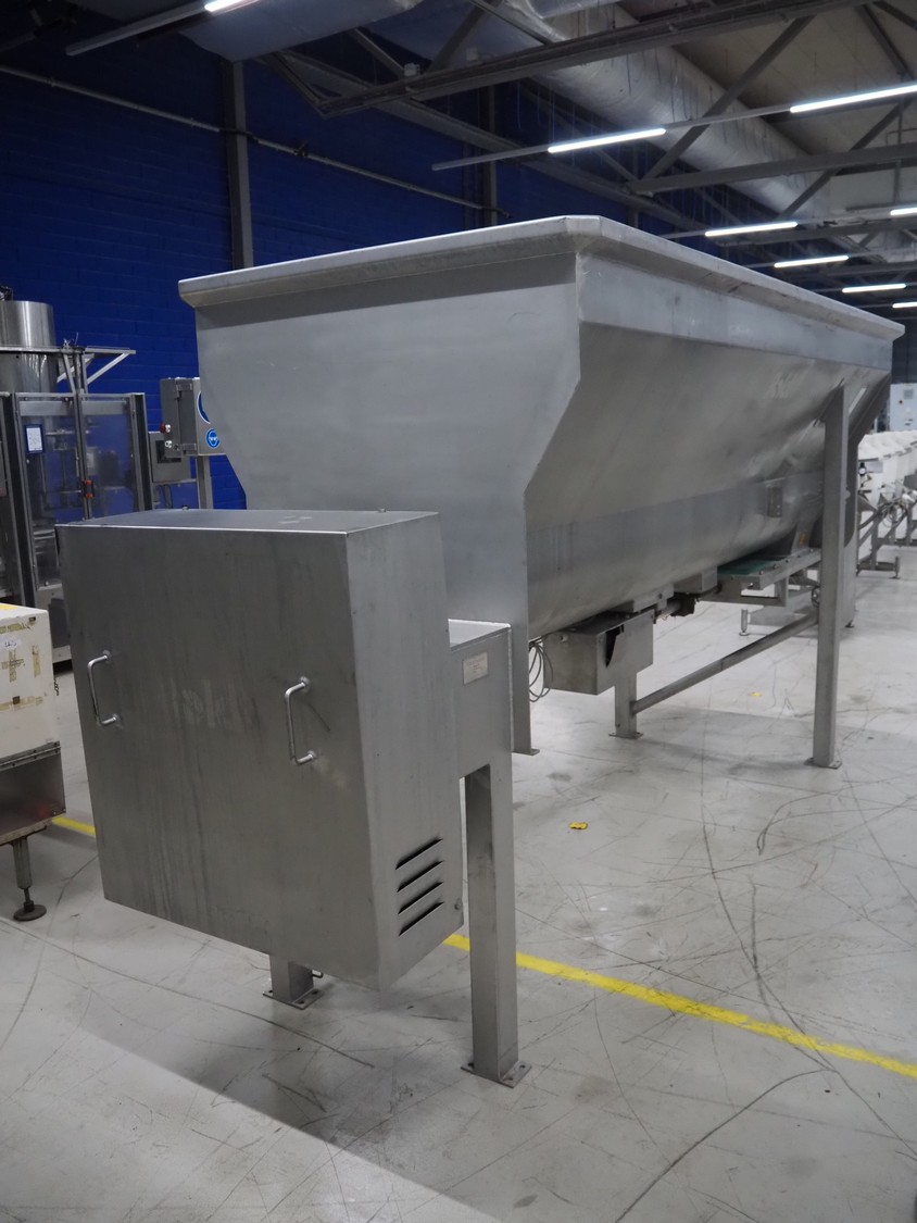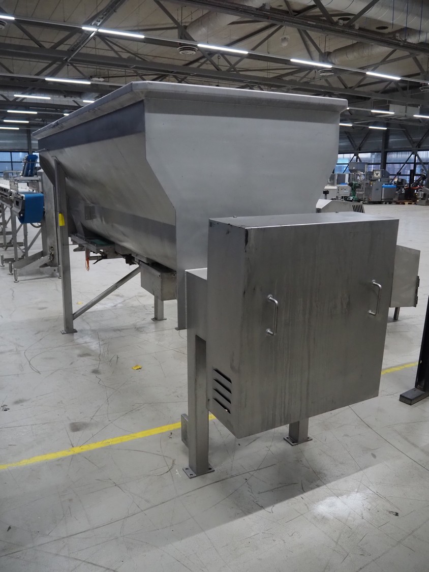 Boldt Systems infeed bunker with outfeed belt, model: BFCS 24.12H, serial number: BFO 09-010.03, year of construction: 2009, inside dimensions: 3500 mm x 1100 mm x 800 mm, plastic belt, belt width: 490 mm, total dimensions: 4300 mm x 1700 mm x 2830 mm.