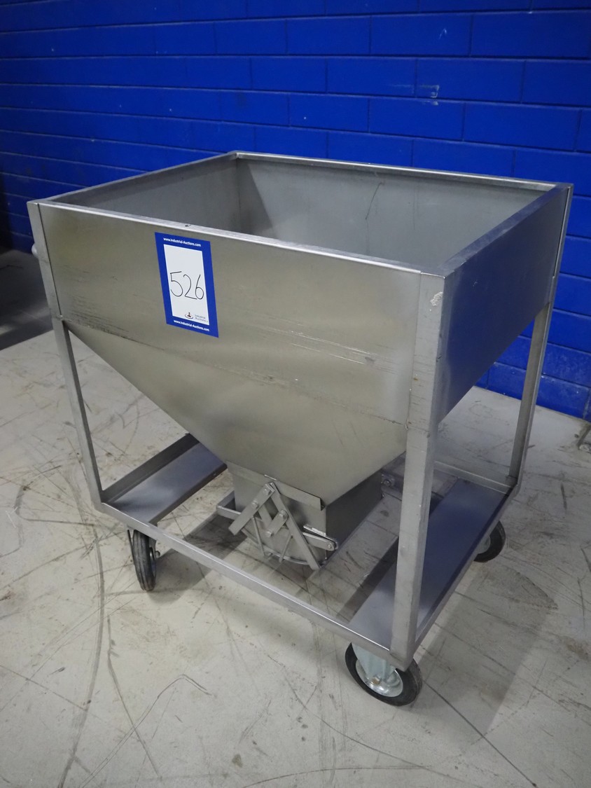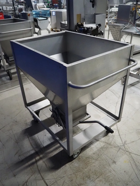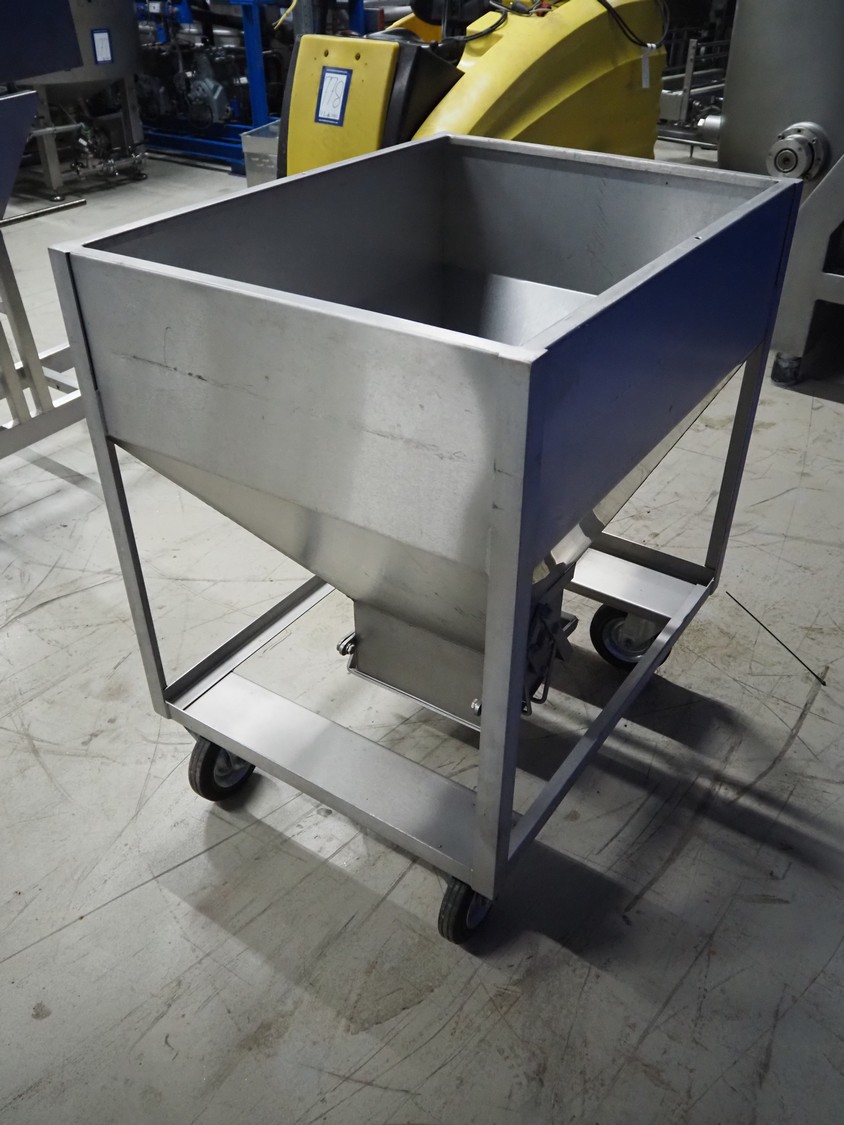S/s mobile infeed bunker, inside dimensions: 940 mm x 680 mm x 710 mm, total dimensions: 1150 mm x 1060 mm x 1130 mm.