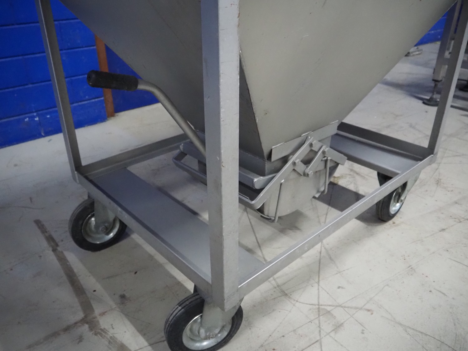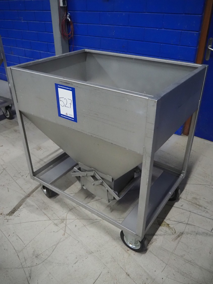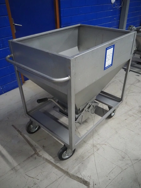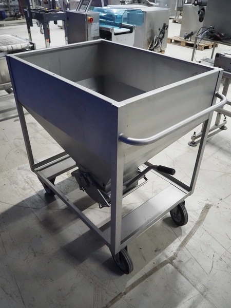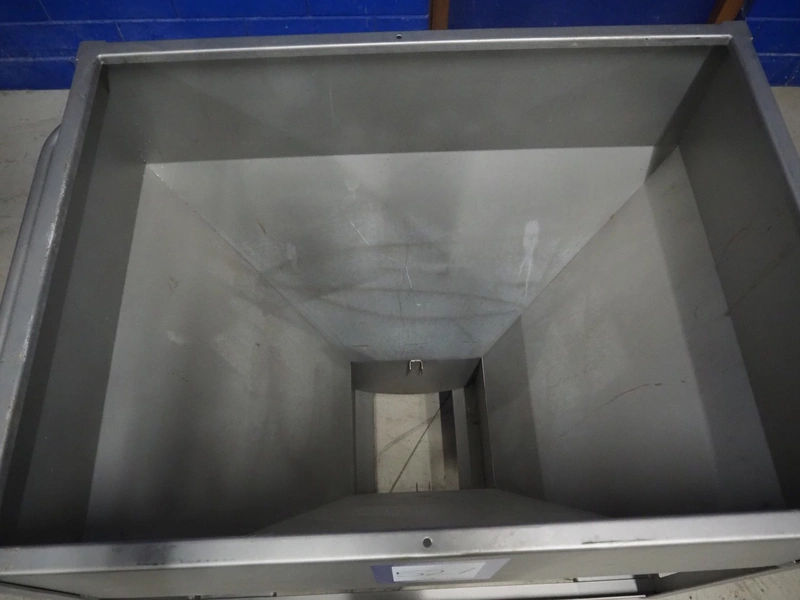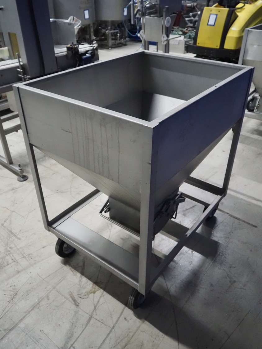 S/s mobile infeed bunker, inside dimensions: 940 mm x 680 mm x 710 mm, total dimensions: 1150 mm x 1060 mm x 1130 mm.