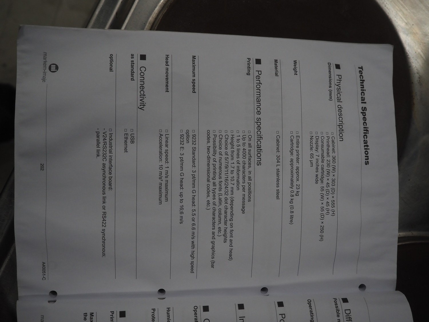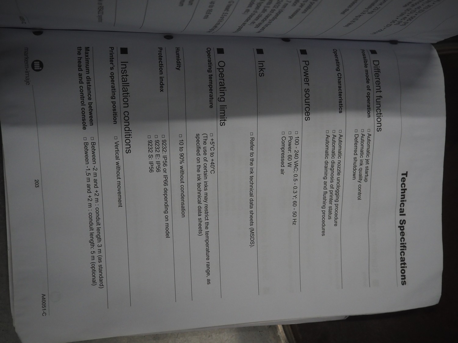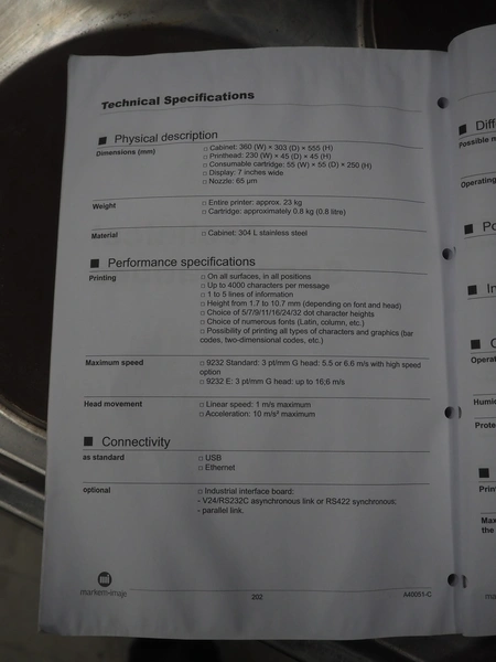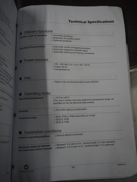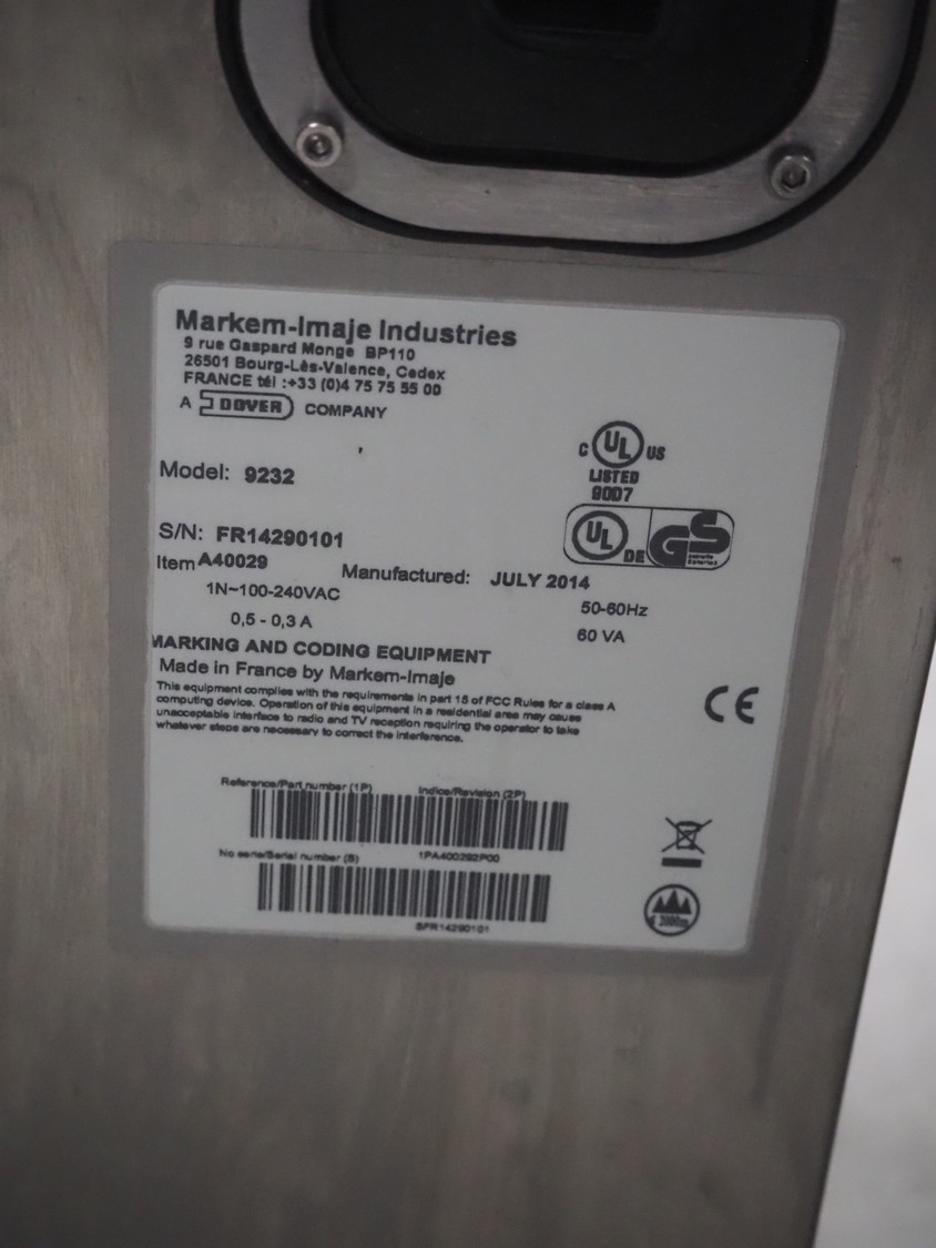 Markem-Imaje Industries inkjet printer, model: 9232, serial number: FR14290101, year of construction: 07/2014, 100/240 V, 1 Ph, 50/60 Hz, 0.5/0.3 A, dimensions: 360 mm x 330 mm x 550 mm.