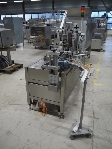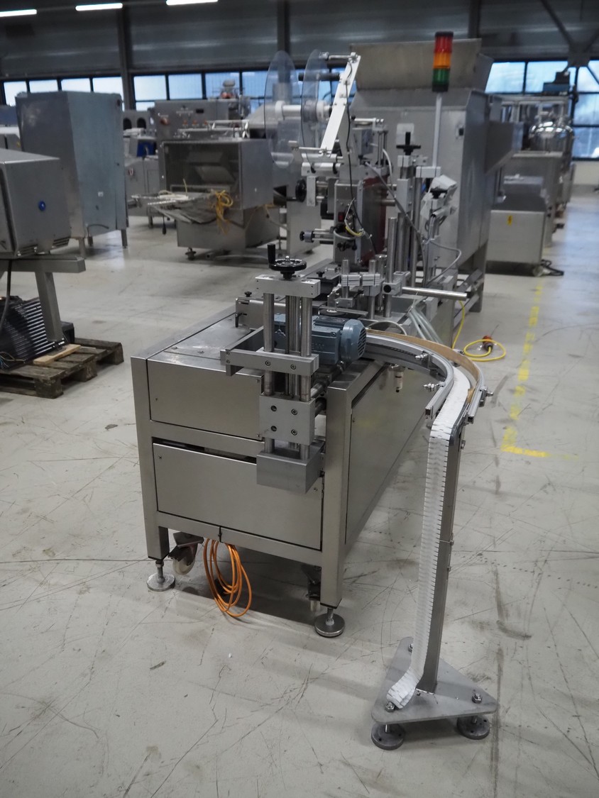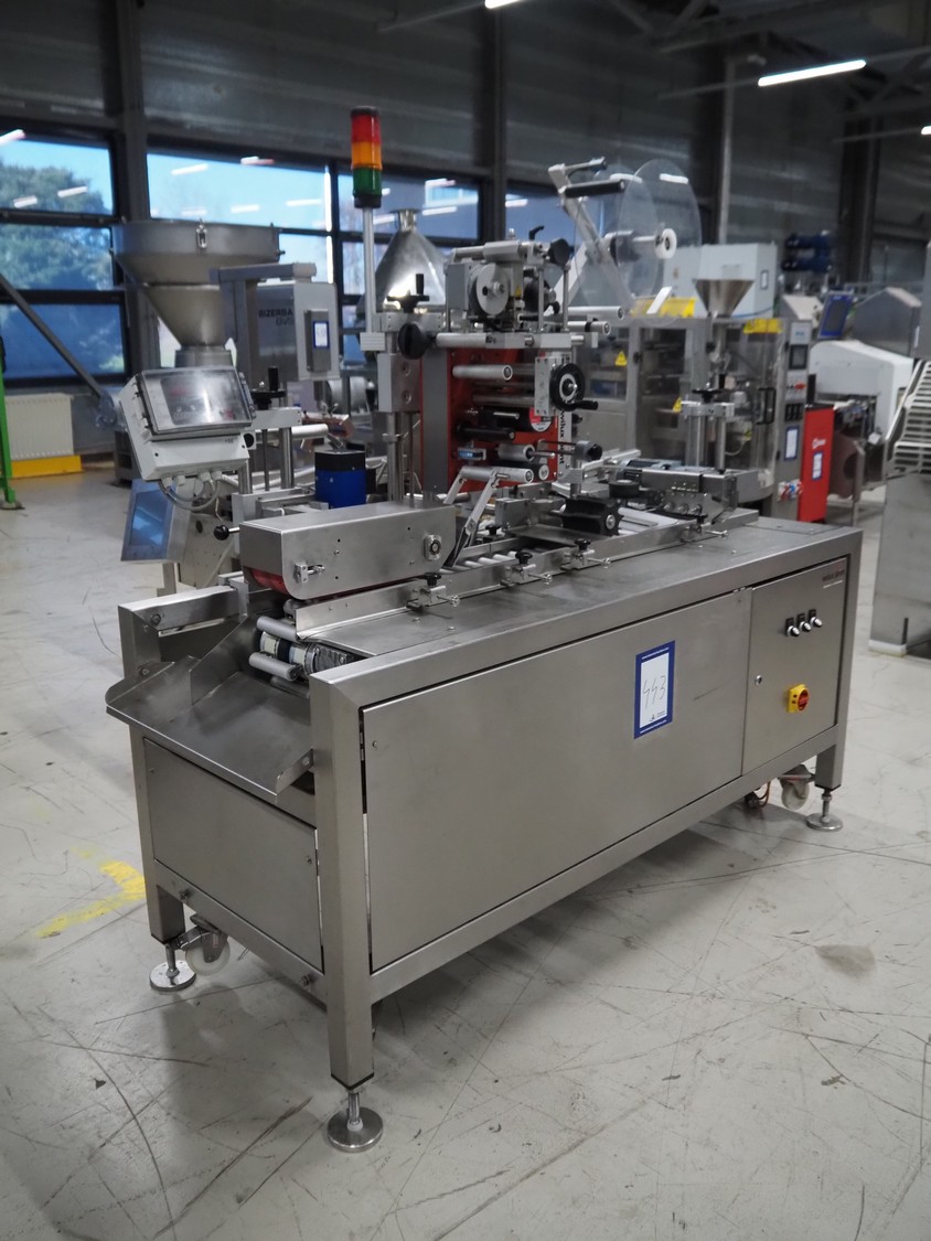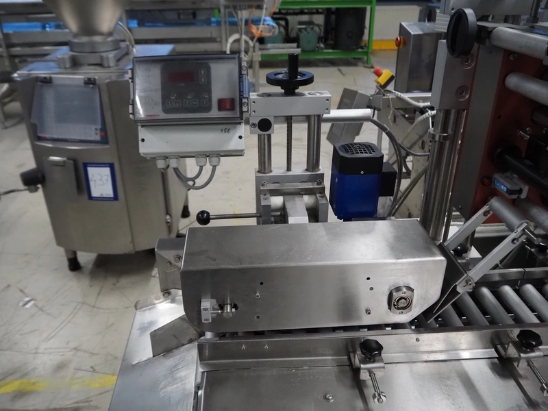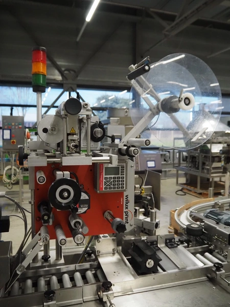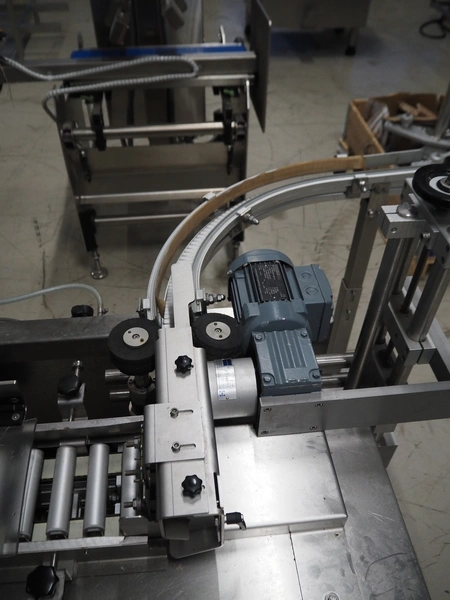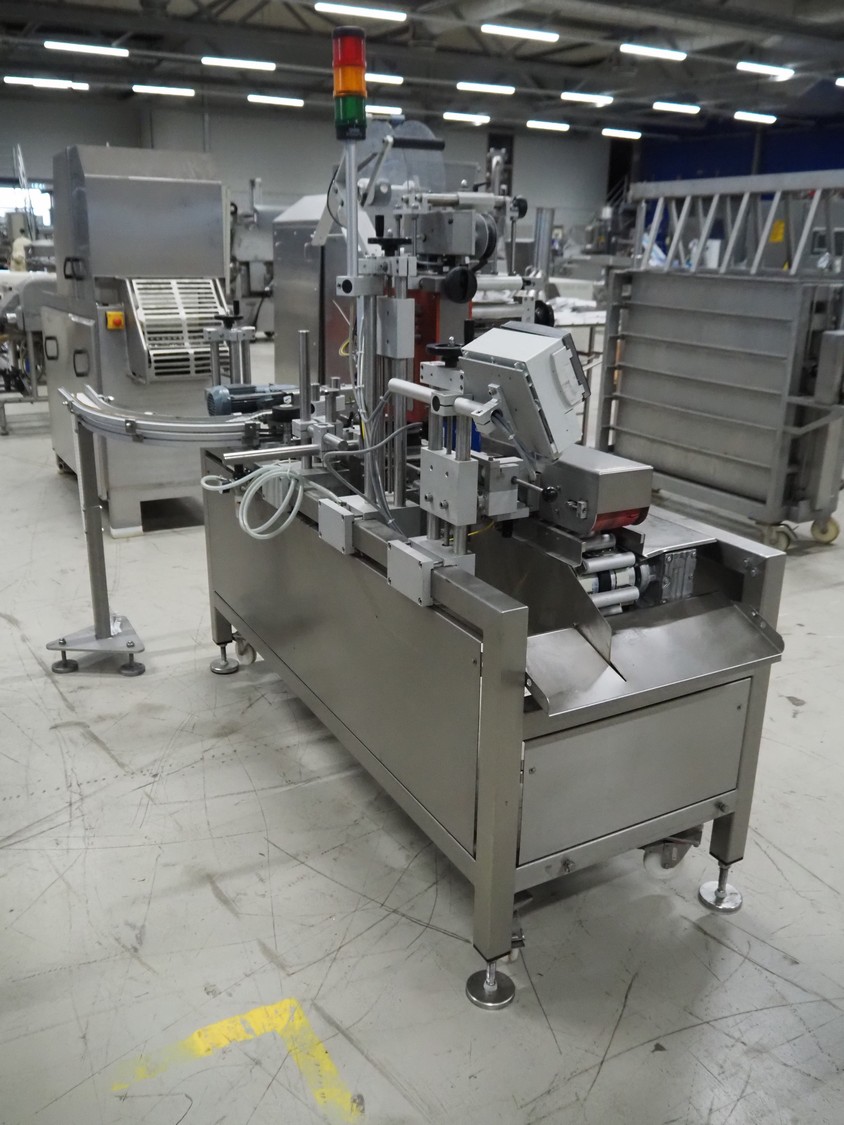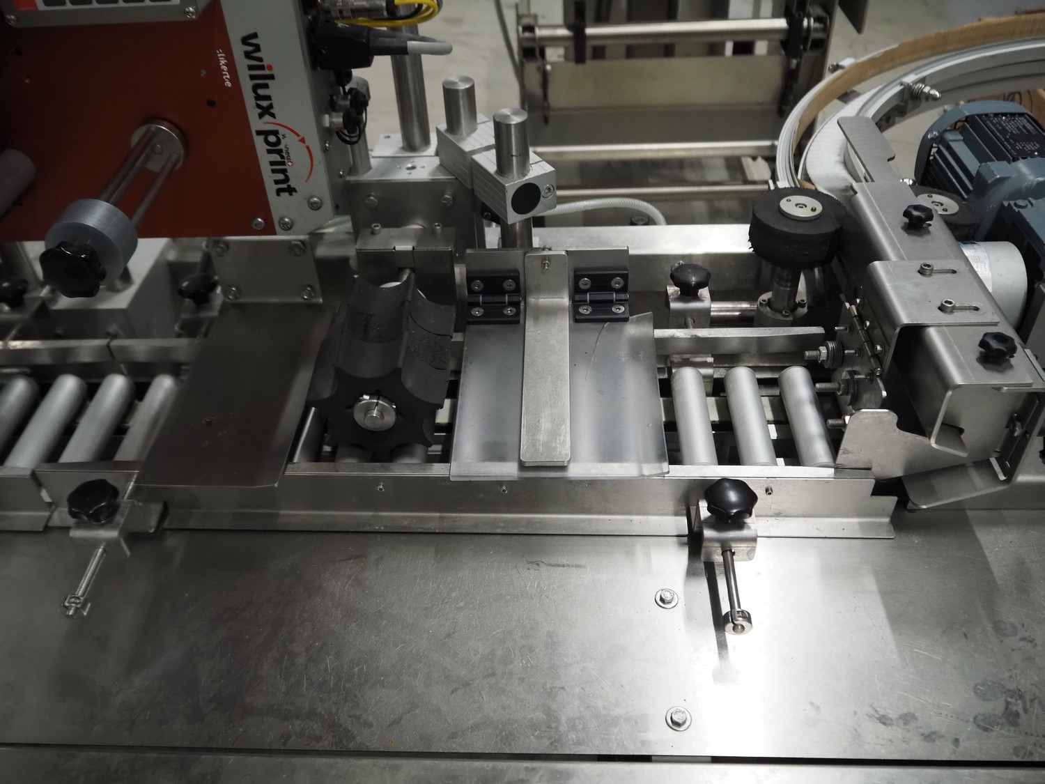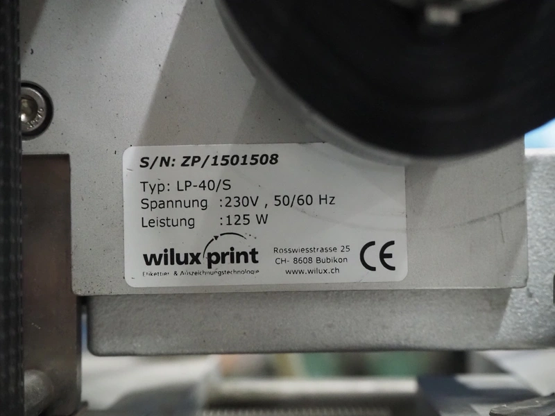 Wilux mobile labelling machine, type: LP-40/S, serial number: ZP/1501508, 230 V, 50/60 Hz, 125 W, plastic infeed belt, belt width: 40 mm, s/s rollers, roller width: 125 mm, total dimensions: 2270 mm x 1200 mm x 1900 mm.