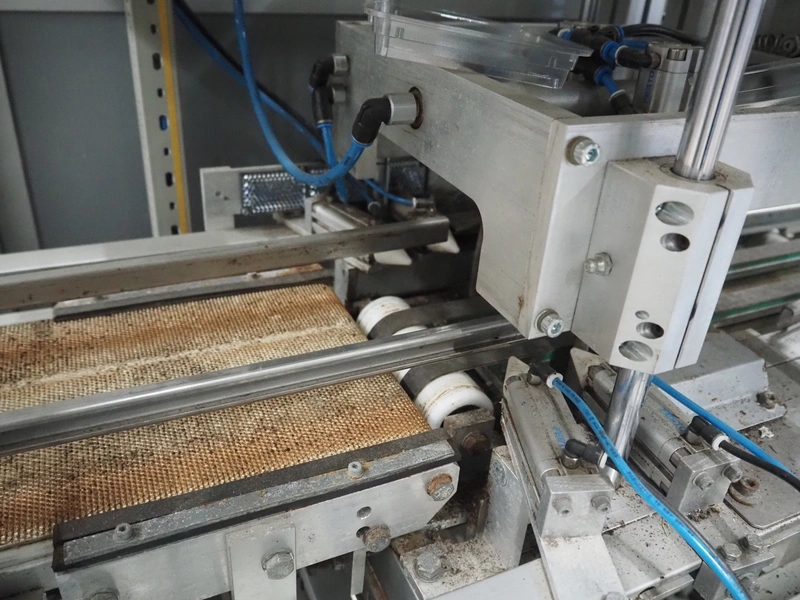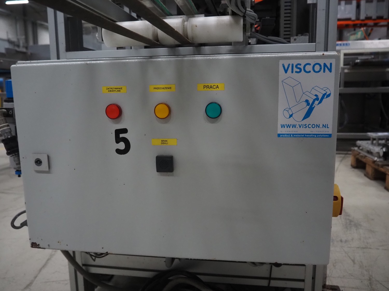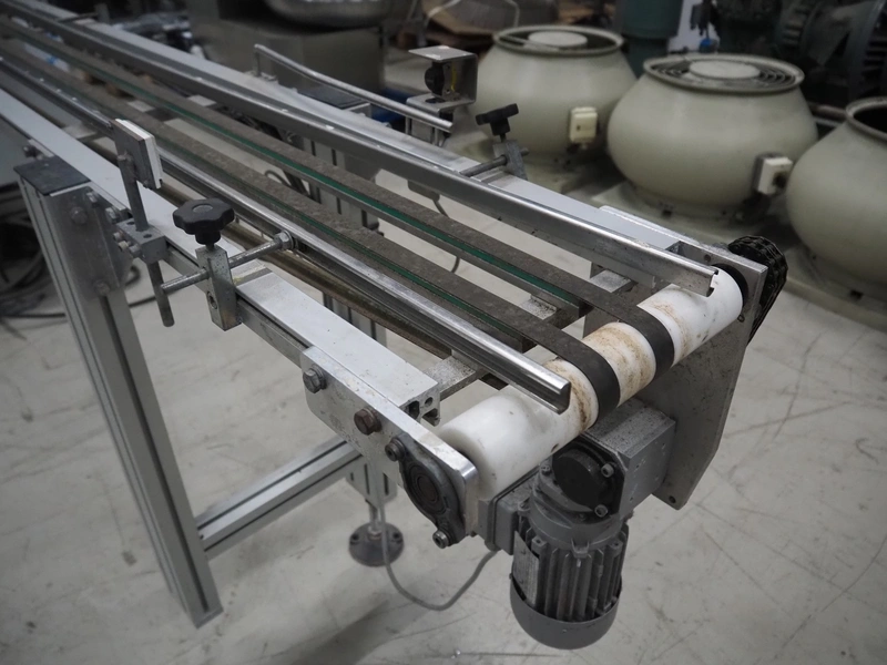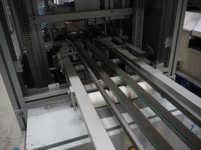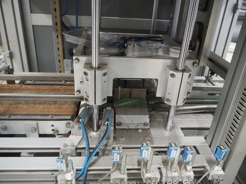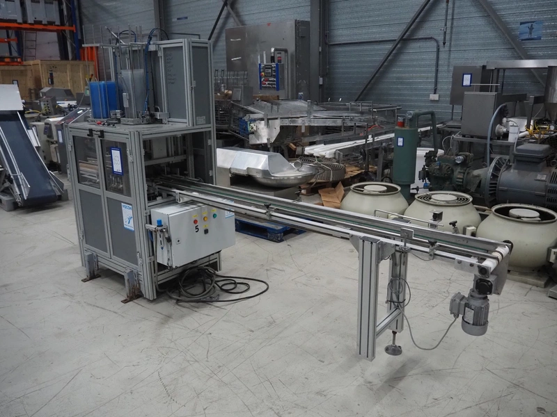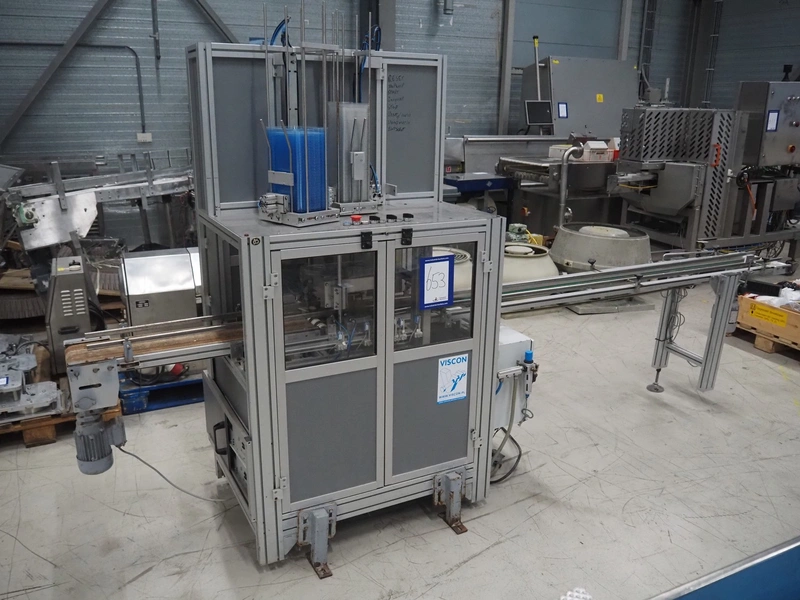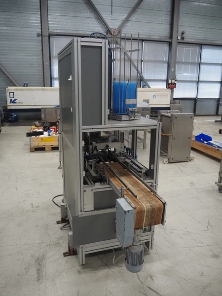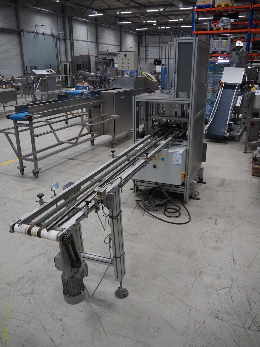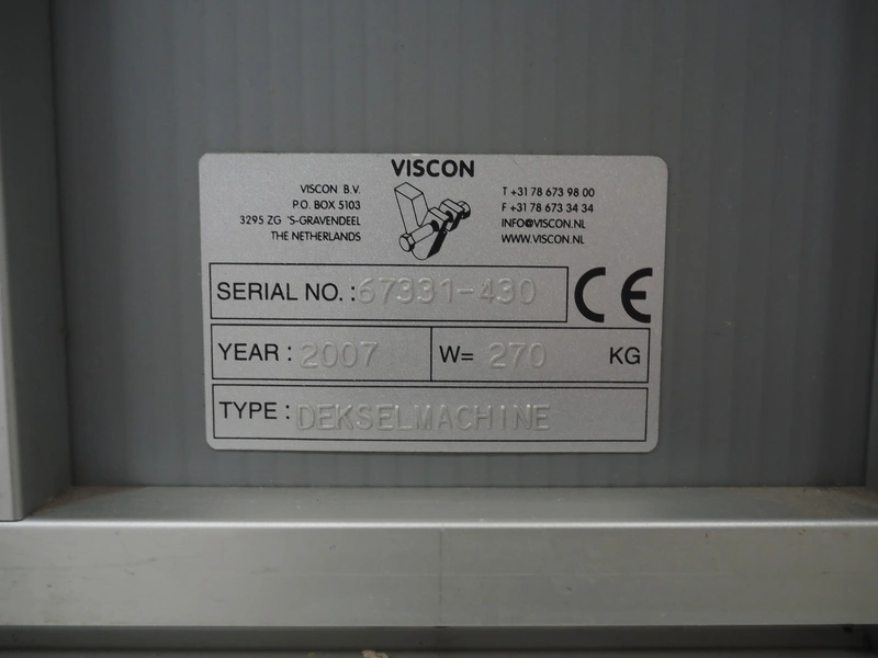 Viscon lid applicator, type: Dekselmachine, serial number 67331-430, year of construction: 2007, weight: 270 kg, plastic belt, belt width: 195 mm, lid size: 120 mm x 140 mm / 190 mm x 150 mm, total dimensions: 3800 mm x 1000 mmx 2000 mm.