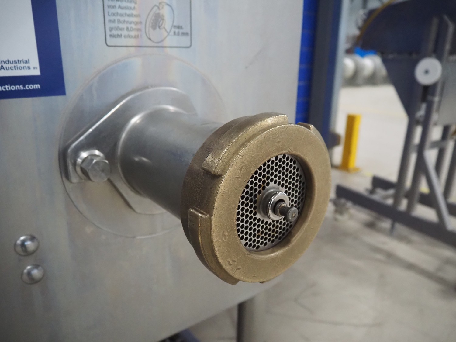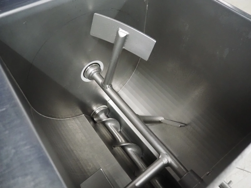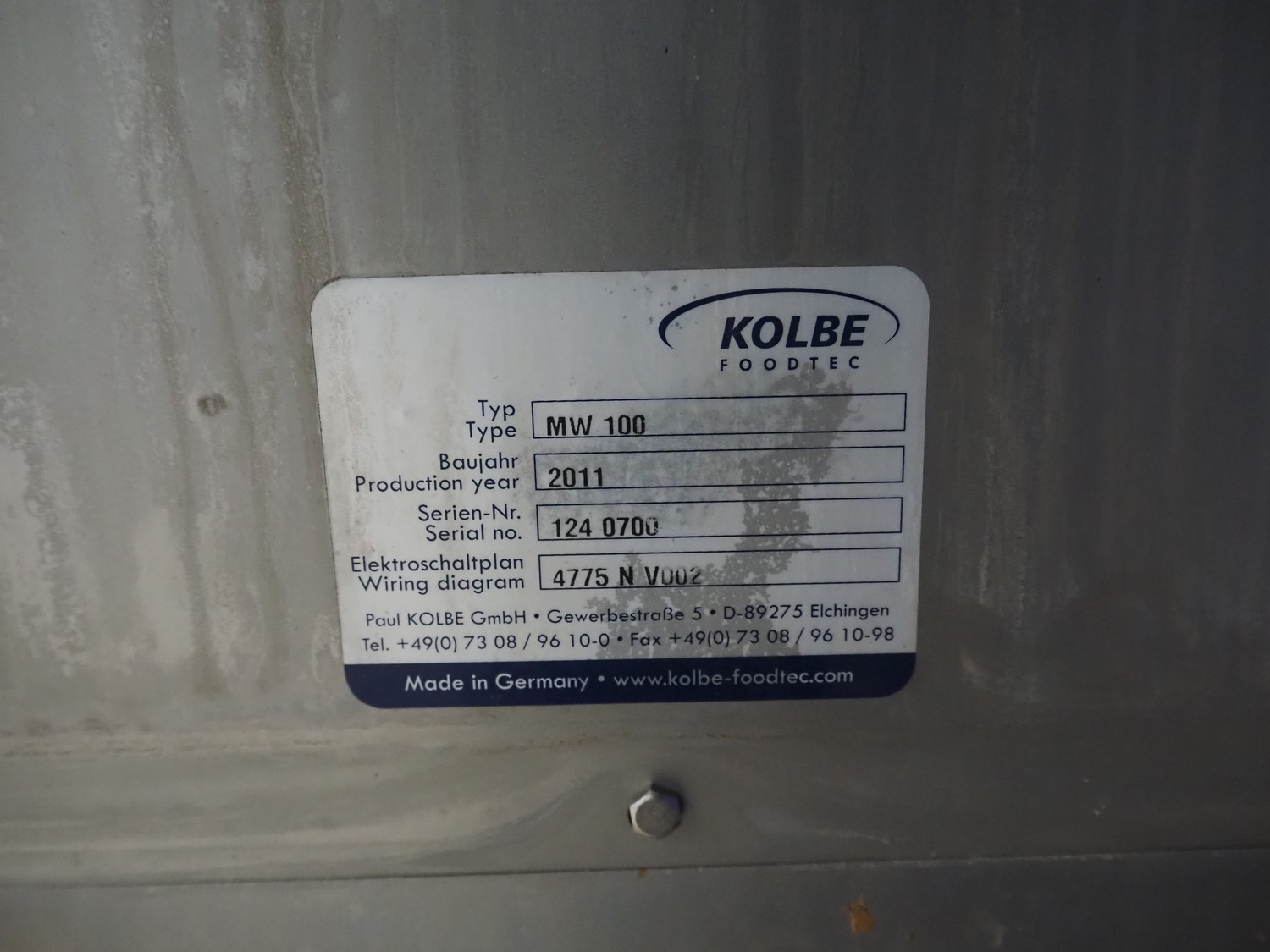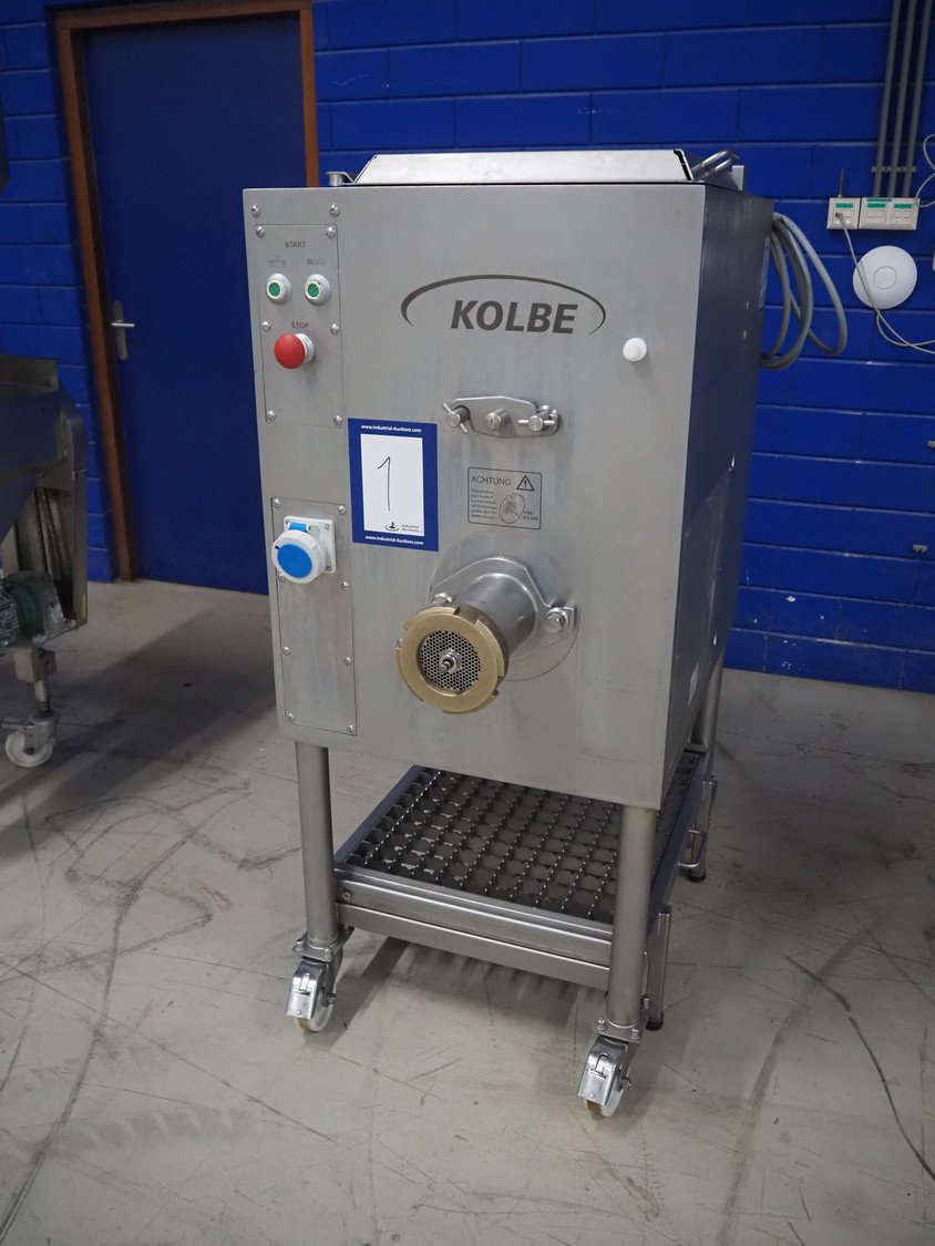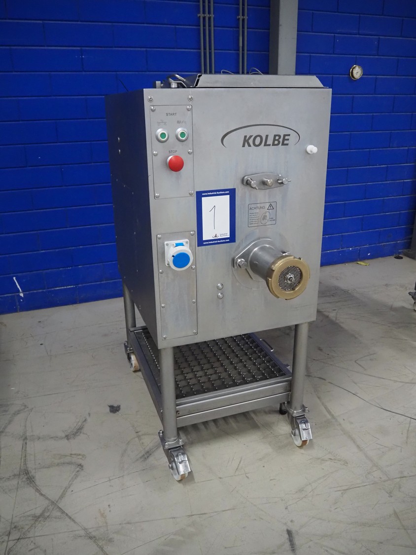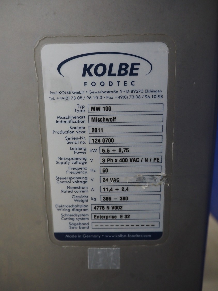 Kolbe mobile paddle mixer-grinder, type: MW 100, serial number: 124 0700, year of construction: 2011, 400 V, 3 Ph, 50 Hz, 11.4/2.4 A, 5.5/0.75 kW, weight: 365/380 kg, plate diameter: 100 mm, total dimensions: 1250 mm x 700 mm x 1570 mm.